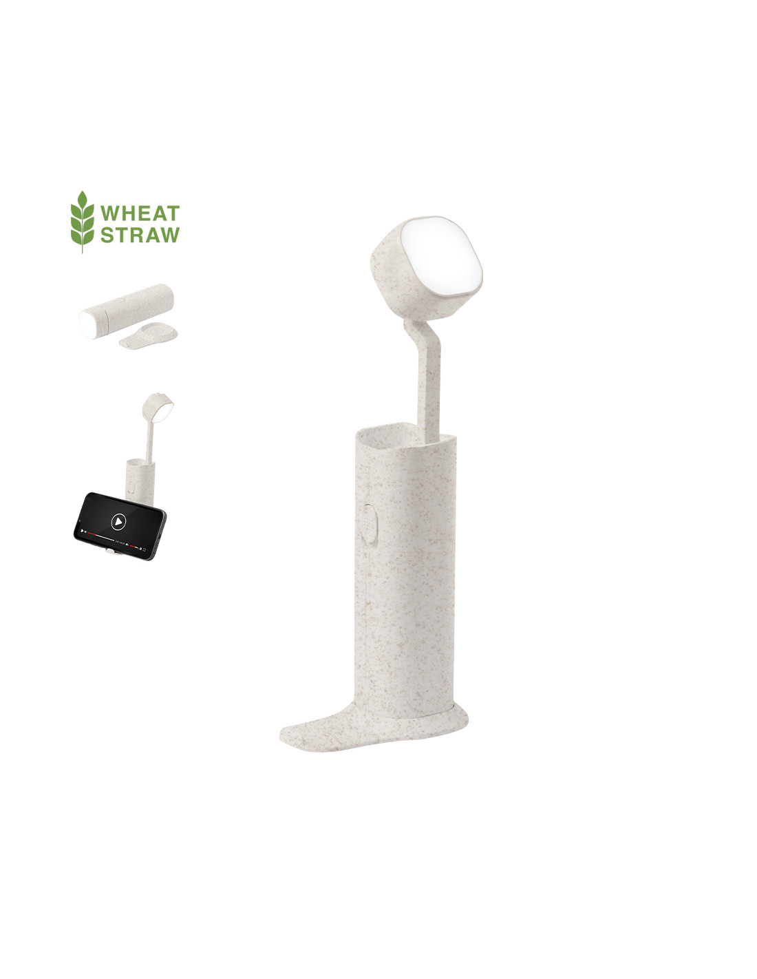 Lámpara multifunción fabricada en caña de trigo. Incluye 12 LEDs de intensidad regulable, es plegable y ajustable en altura. Incluye soporte para dispositivos móviles y tiene base antideslizante, con cable cargador Micro USB incluido. Disponible manual de instrucciones en español e inglés y presentada en caja de diseño kraft.La caña de trigo fomenta la utilización de materias primas naturales, reduciendo así las emisiones contaminantes.Fabricada conforme a los estándares RoHS y en cumplimiento con los siguientes requisitos de seguridad:Sistema de protección contra sobrecalentamiento.Sistema de protección contra sobrecarga.Sistema de bloqueo para evitar cortocircuitos.