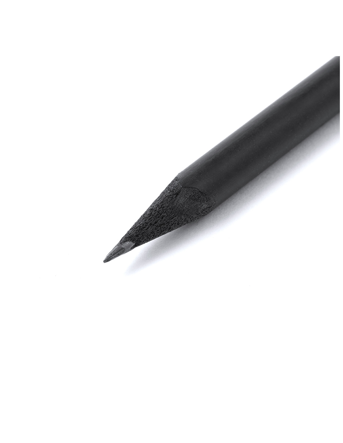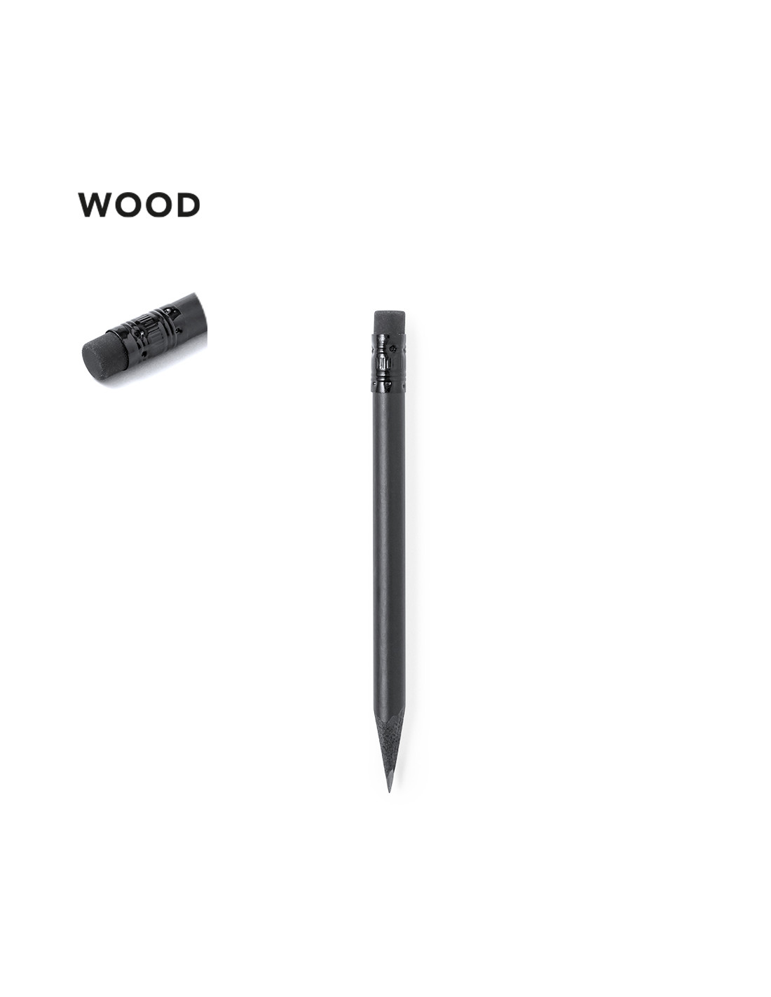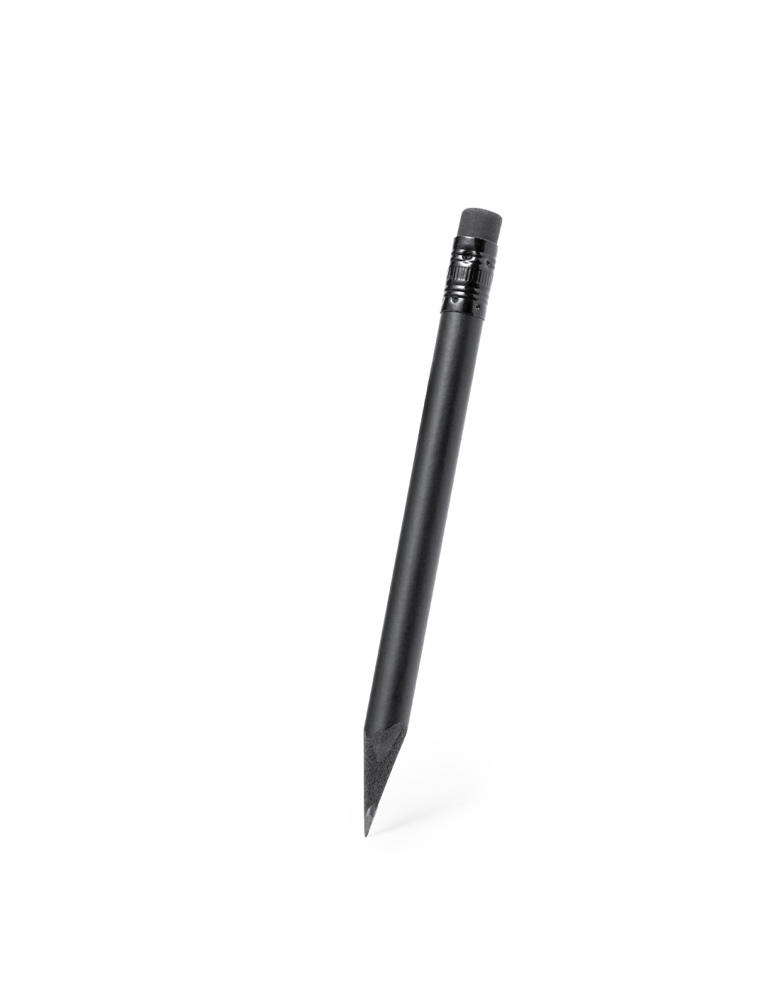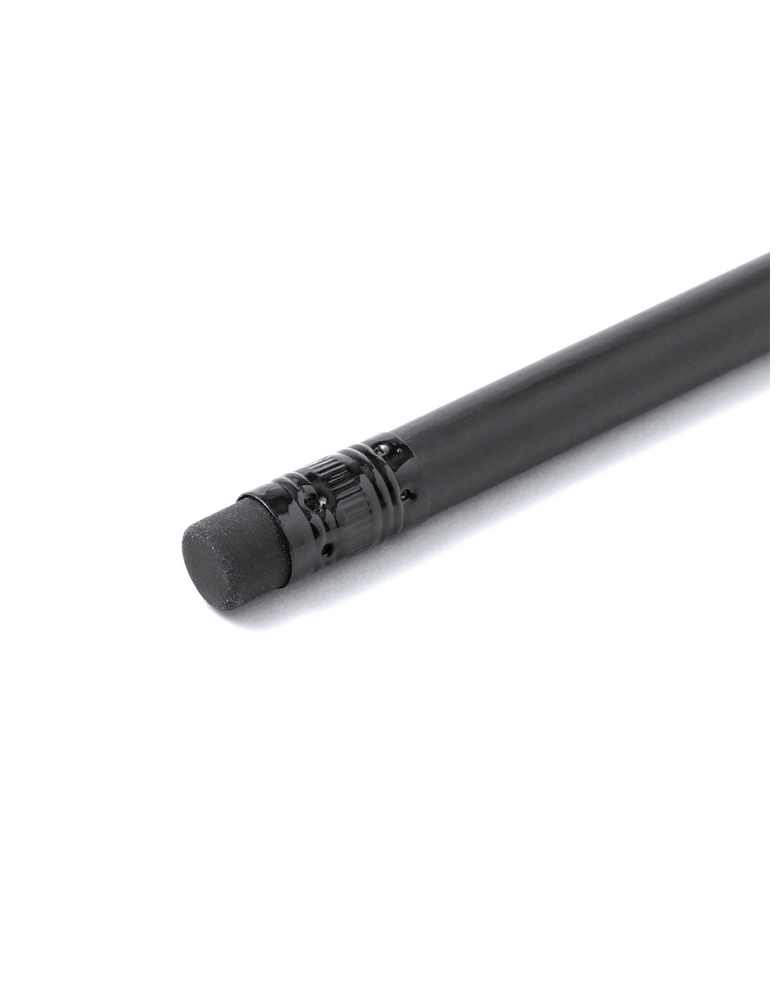 Lápiz de madera natural en acabado negro mate, con mina negra, punta afilada y goma en la parte superior a juego.
