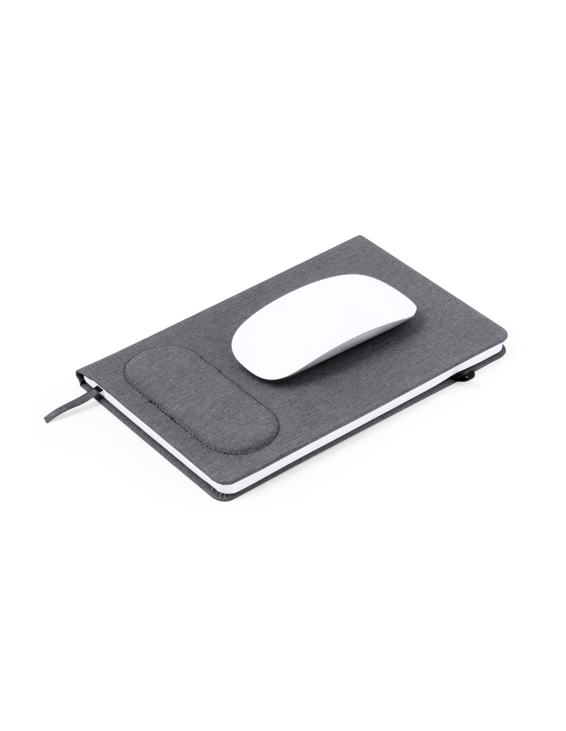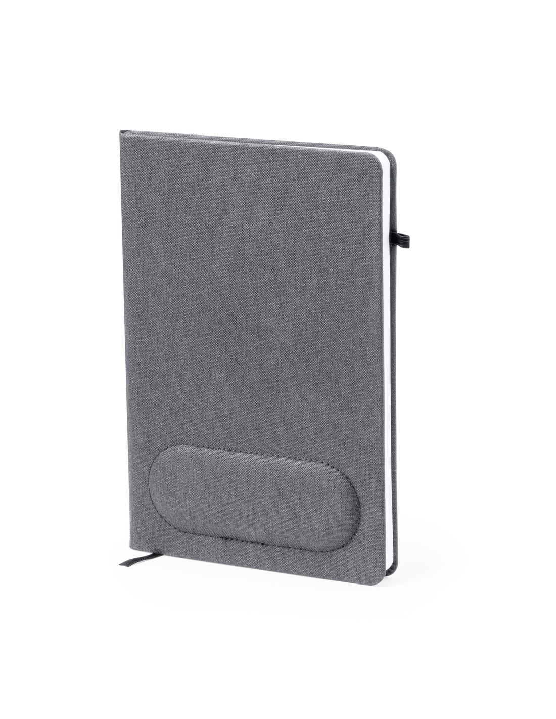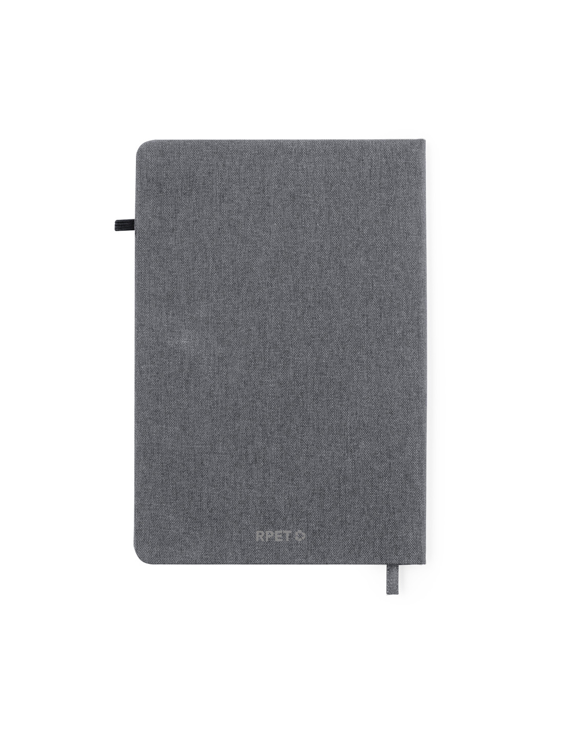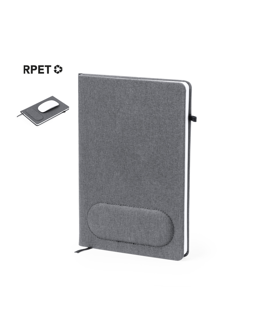 Libreta alfombrilla elaborada en RPET 300D con tapas rígidas. Destaca por su original soporte en la portada con forma ergonómica para la muñeca y así poder usarse como alfombrilla de ratón. Incluye marcapáginas y un soporte para bolígrafo a juego. Contiene 100 hojas interiores lisas y está disponible en un elegante color gris. Con logotipo RPET en contraportada y presentada en bolsa individual reciclada.El material RPET se elabora a partir de plástico reciclado, para así fomentar la reutilización de residuos plásticos y ayudar a la sostenibilidad del planeta.
