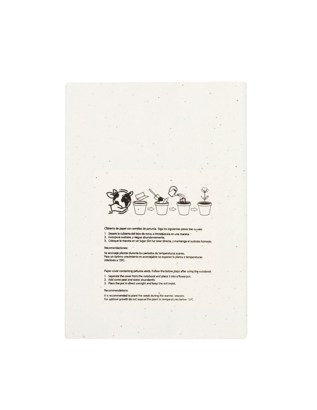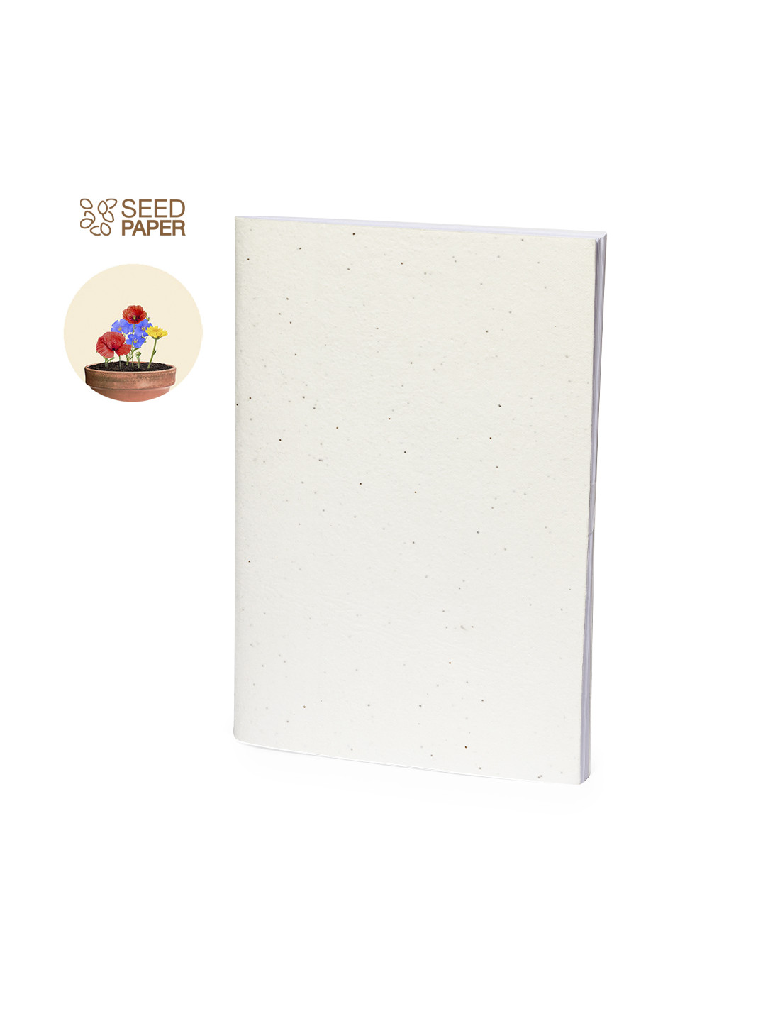 Libreta de tapas blandas con portada y contraportada fabricadas en papel de semillas. Con 60 hojas interiores en color blanco lisas. incluye semillas de petunia en ambas cubiertas, convirtiéndolo así en papel plantable al final de su vida útil. Con instrucciones de plantado y presentado en bolsa individual de papel reciclado.