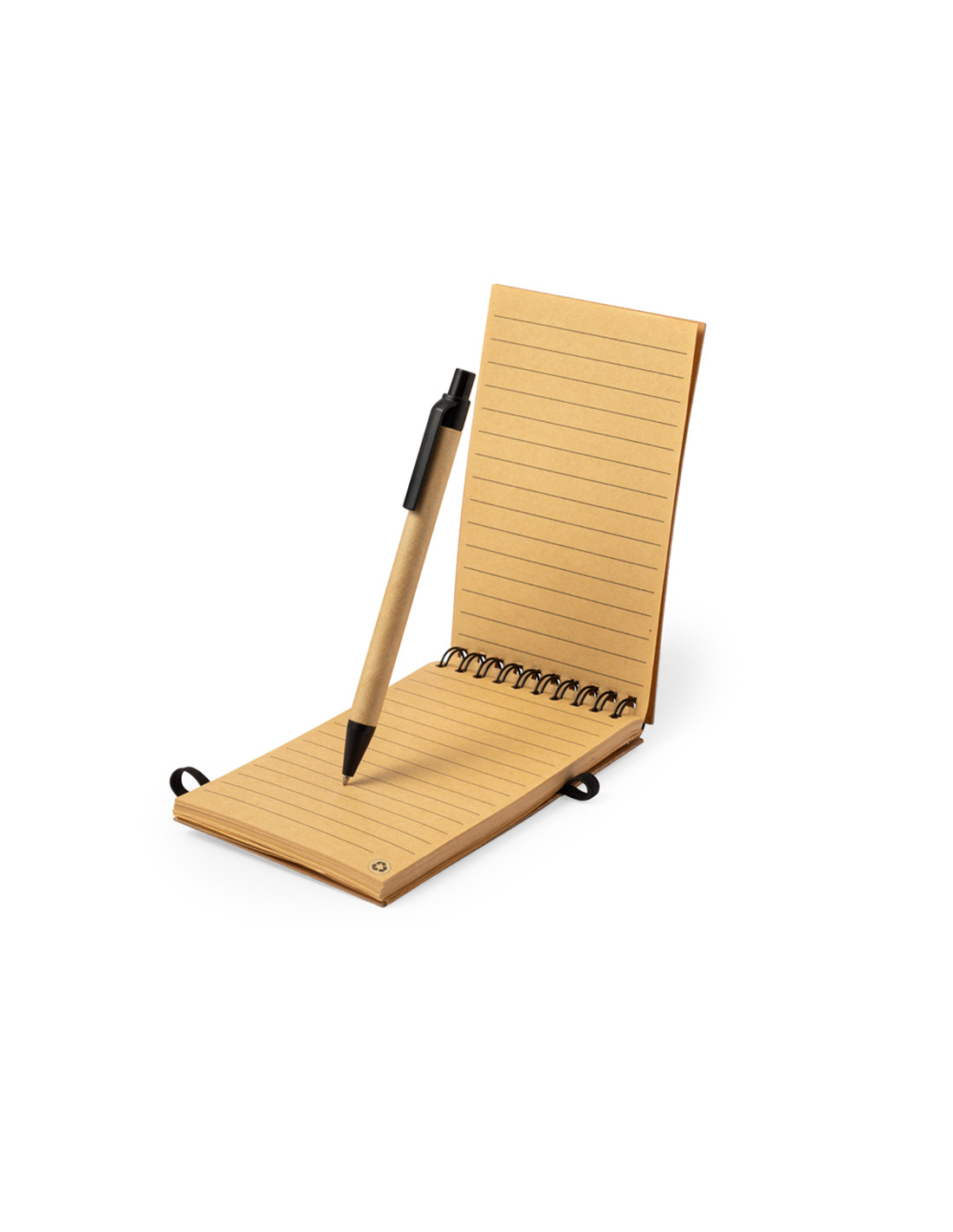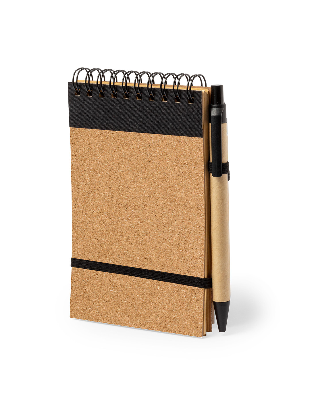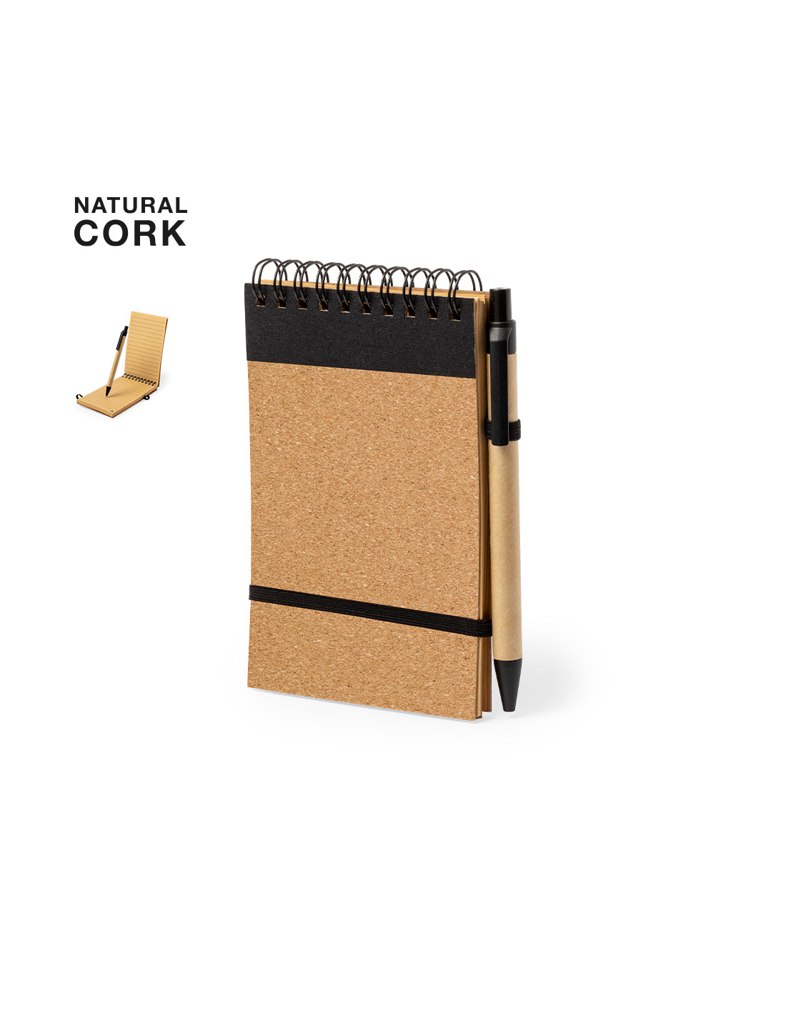 Set de libreta y bolígrafo fabricado en corcho y cartón reciclado. Incluye libreta de anillas con tapas rígidas en corcho natural, con 80 hojas de disposición a una raya. Incluye bolígrafo de mecanismo pulsador con cuerpo fabricado en cartón reciclado y en tinta azul. Presentado en bolsa de papel reciclado. Elaborado con elementos vegetales para así fomentar la utilización de materias primas naturales y reducir las emisiones contaminantes.