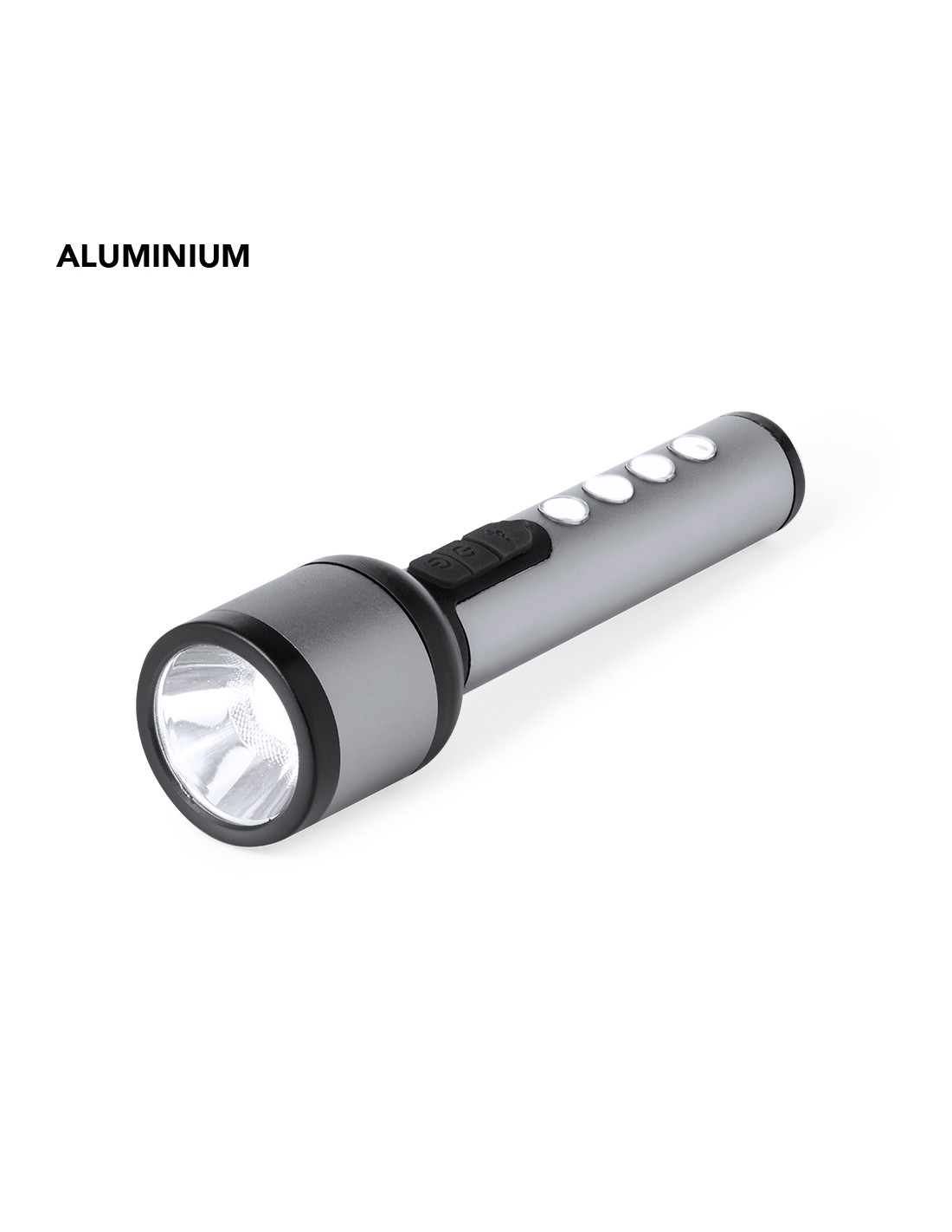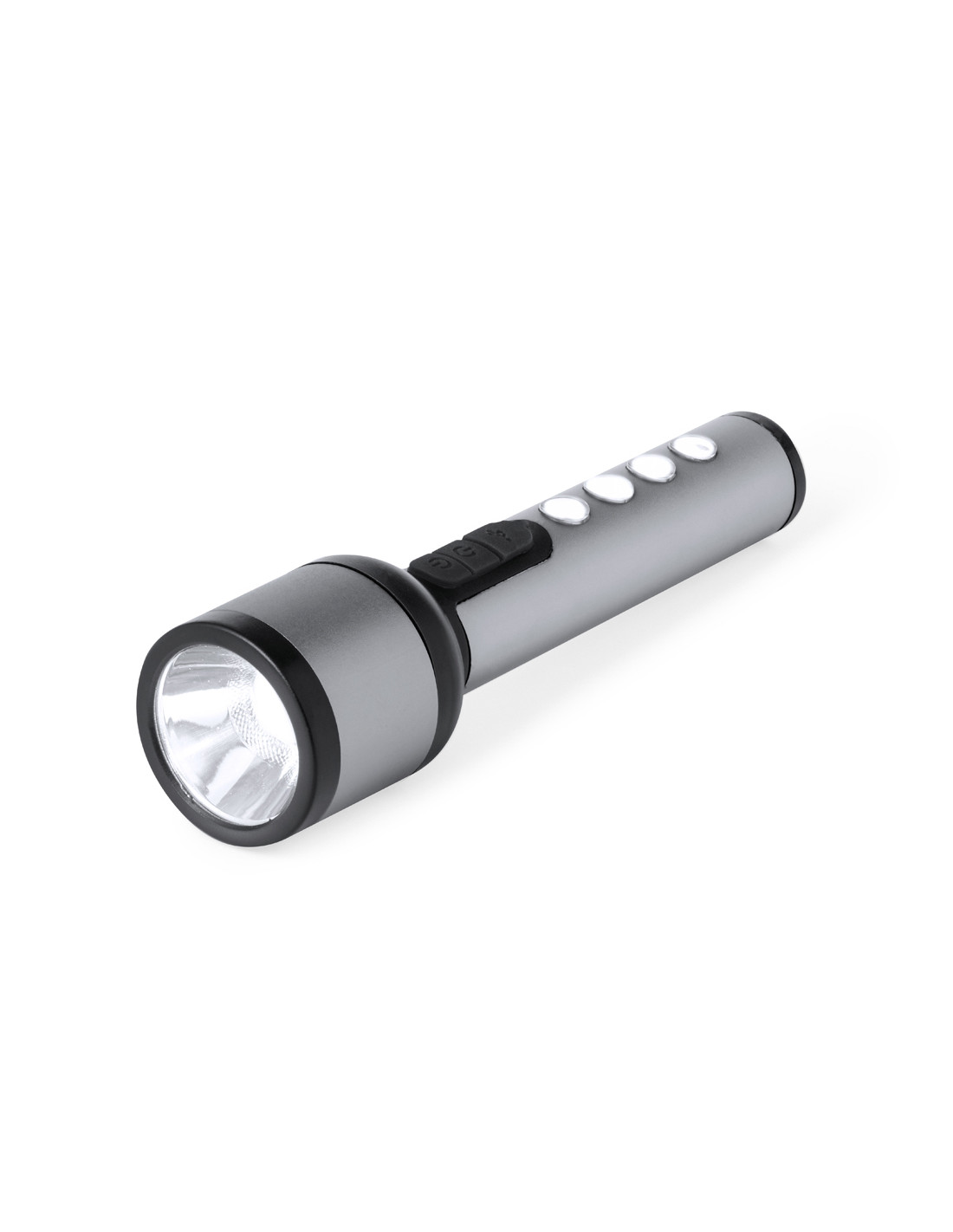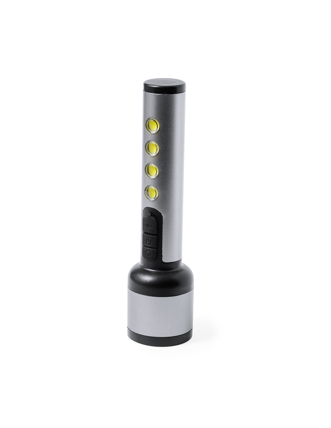 Linterna potente fabricada en aluminio con un diseño elegante en acabado gris metalizado con detalles en negro. Cuenta con 1 LED frontal para una iluminación focalizada y 4 luces COB en el mango para una dispersión más amplia de la luz. Ofrece 3 modos de iluminación: fija, intermitente lenta y rápida, adaptándose a diversas necesidades. Esta linterna es recargable mediante su batería de 1200 mAh, con el cable de carga incluido. Presentada individualmente en caja de diseño kraft.