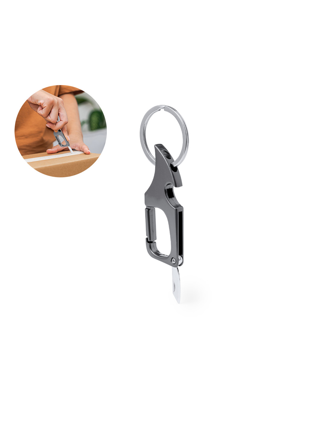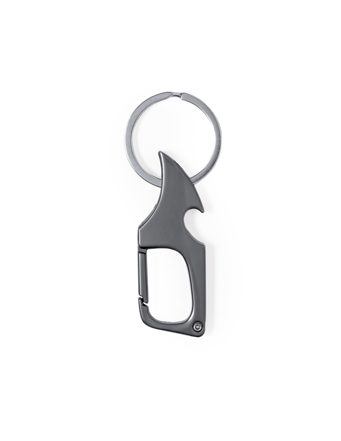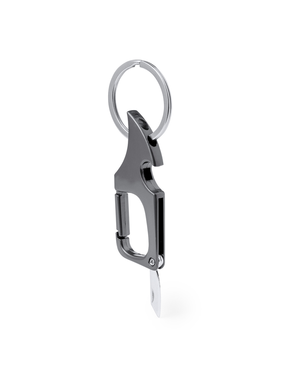 Práctico llavero abridor metálico. Con anilla para llavero y mosquetón para un rápido enganche. Con abrebotellas en uno de sus extremos, incorpora un pequeño cuchillo de acero inox en el extremo opuesto, ideal para abrir cartas, paquetes, etc. En elegante color negro metalizado y presentado en bolsa de papel reciclada.