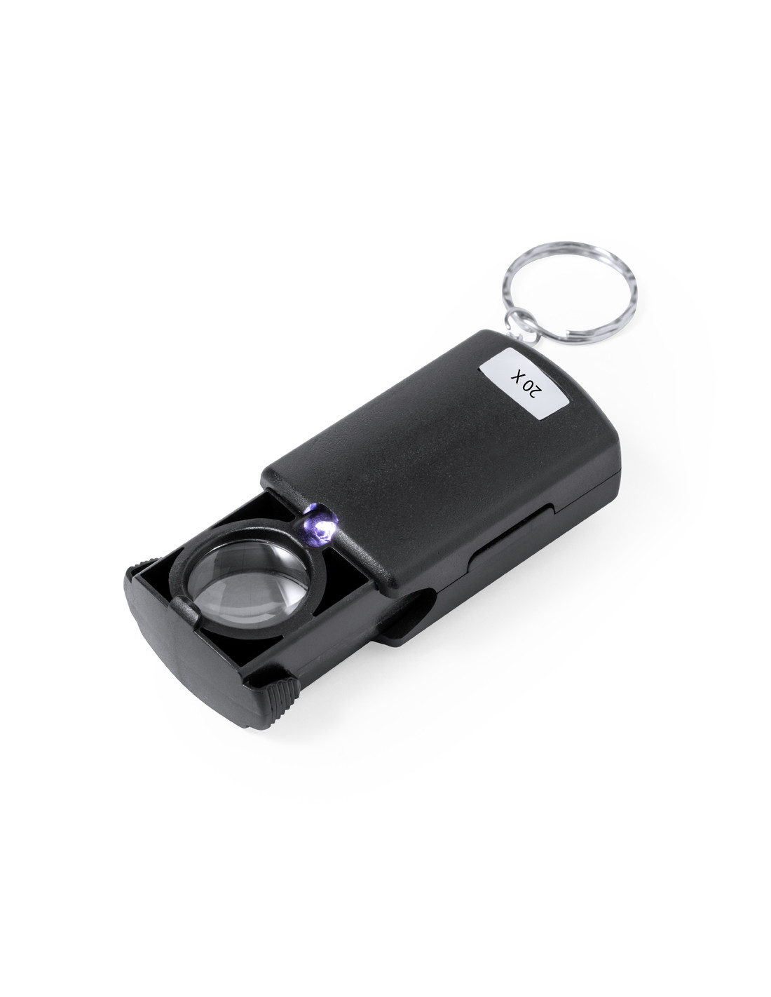 Práctica lupa llavero con aumento 20x y luz LED integrada. Fabricada en resistente ABS de color negro y fácil de transportar por su reducido tamaño. Alimentada por 1 pila de botón (incluida) y presentada en caja individual de cartón negra.