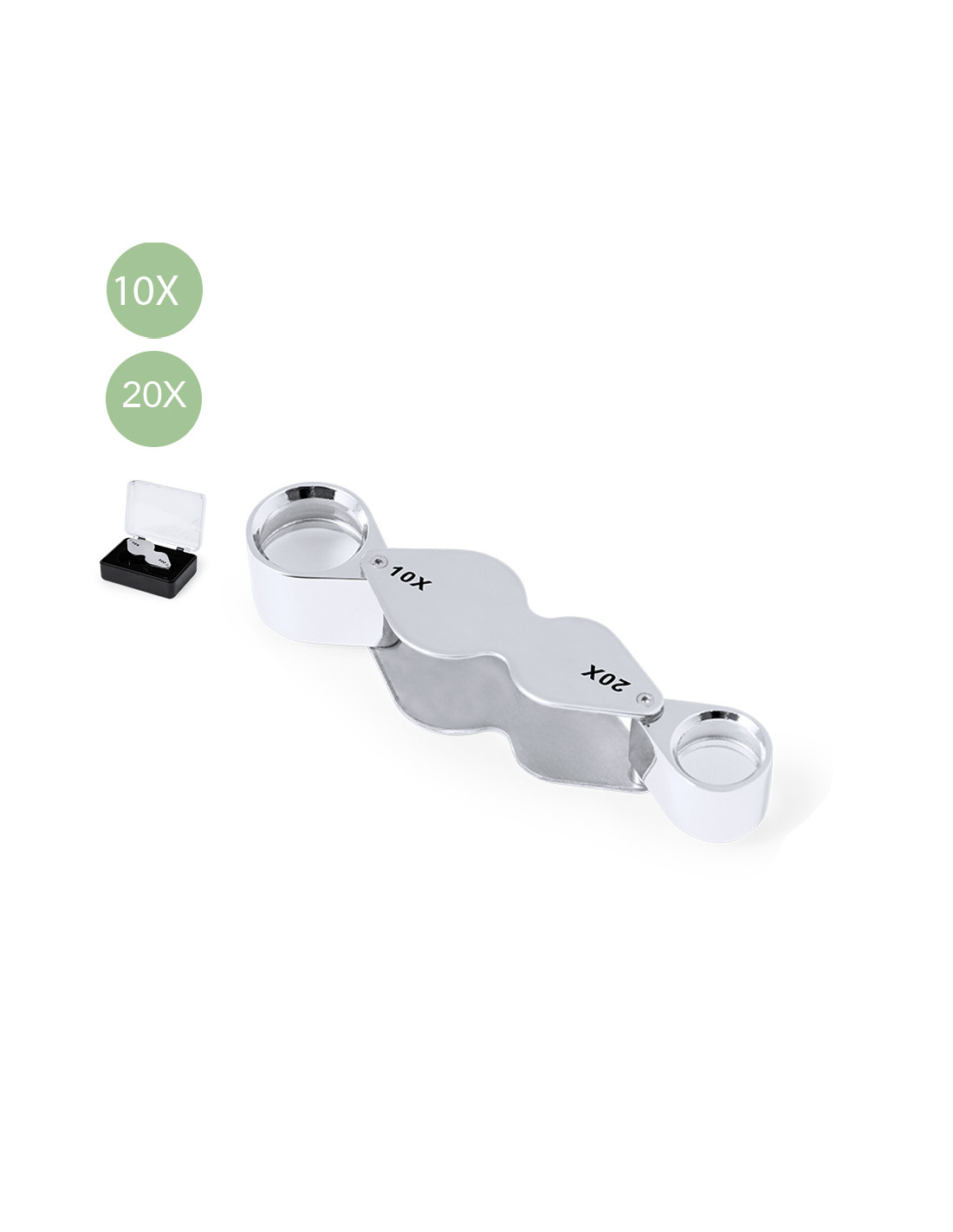 Lupa plegable doble con aumento 10x y 20x, fabricada en resistente metal. Gran potencia de aumento para obtener una visión muy cercana de los detalles más pequeños, con ampliación sin distorsión. Ideal para inspeccionar objetos de tamaño reducido, textos, etc. Además, viene dentro de un estuche con interior acolchado para una mayor protección. Presentada en caja de cartón negra.