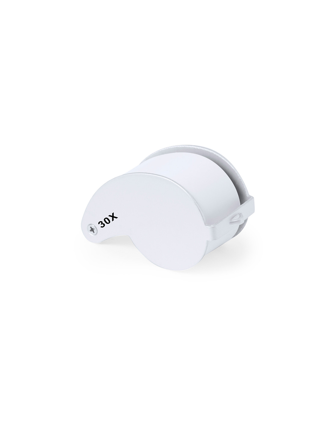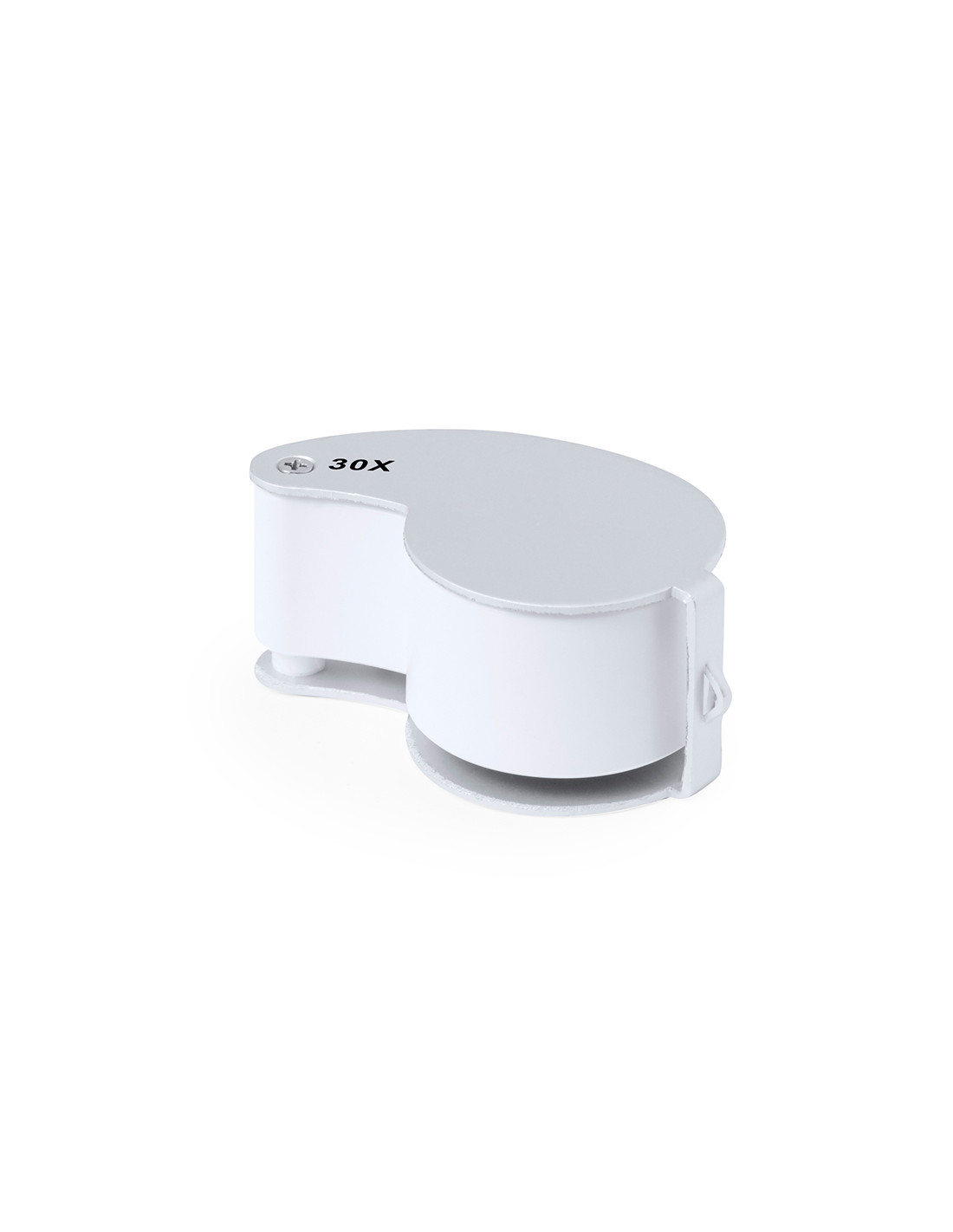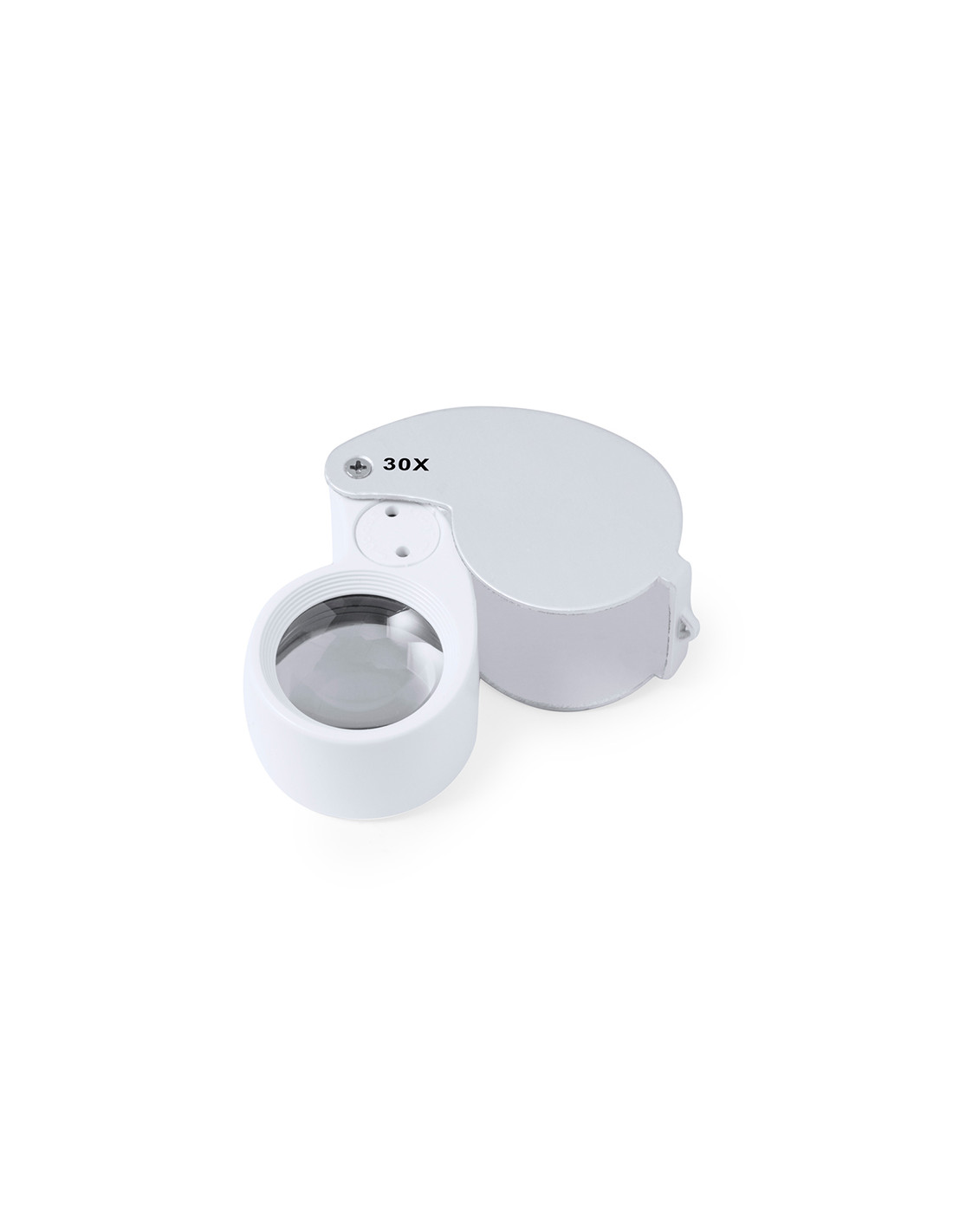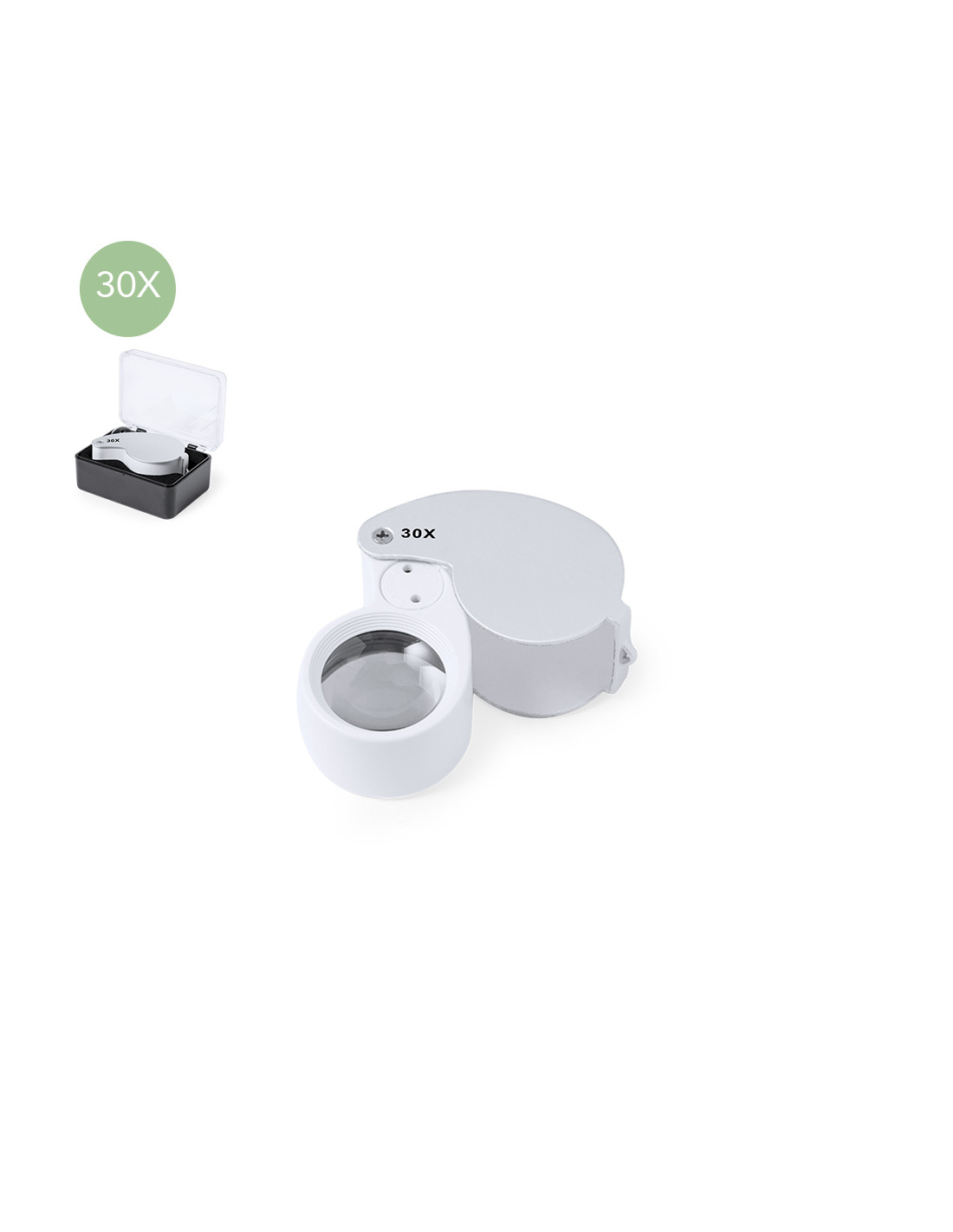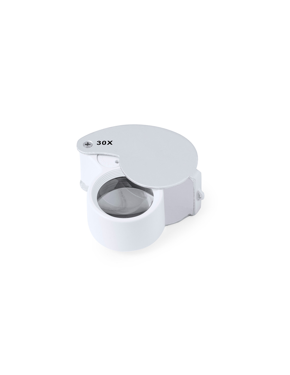 Lupa plegable doble con aumento 30x , fabricada en resistente metal. Con luces LED integradas y gran potencia de aumento para obtener una visión muy cercana de los detalles más pequeños y ampliación sin distorsión. Ideal para inspeccionar objetos de tamaño reducido, textos, etc. Además, tiene un accesorio para colgar, y viene dentro de un estuche con interior acolchado para una mayor protección. Alimentación a pilas (de botón incluidas), con llave especial para reemplazarlas cuando se agoten. Presentada en caja de cartón negra.