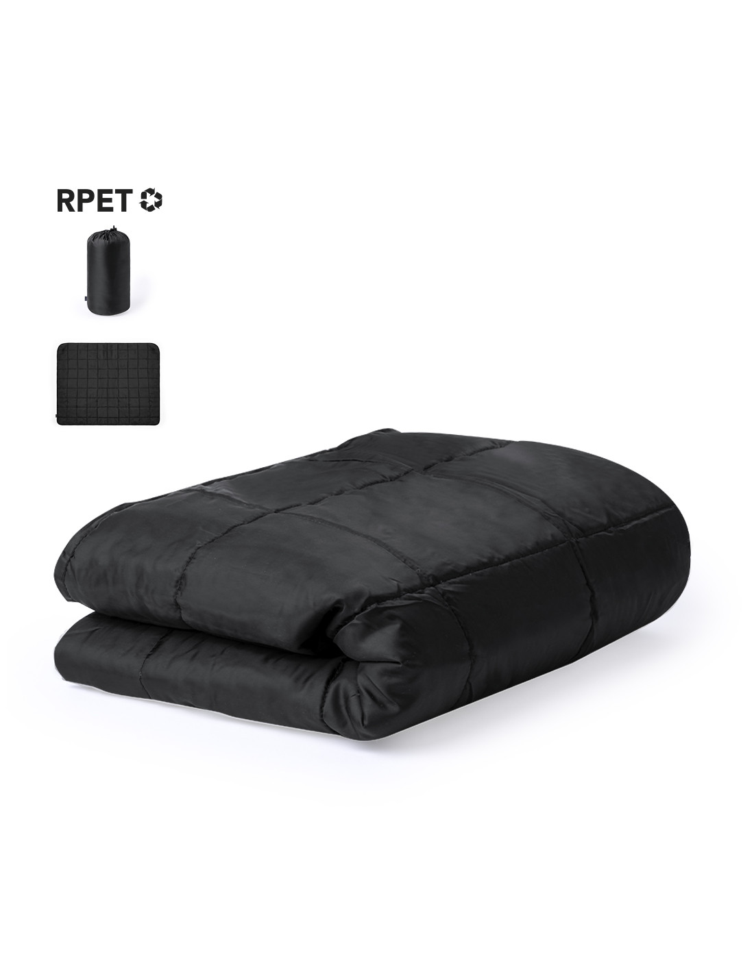 Manta de picnic premium fabricada en resistente poliéster 190T RPET y acabado en negro. Plegable, con funda ajustable de autocierre en poliéster 190T RPET. En tamaño 120x150 cm, de fácil plegado y tamaño compacto, con logotipo RPET.El material RPET se elabora a partir de plástico reciclado, para así fomentar la reutilización de residuos plásticos y ayudar a la sostenibilidad del planeta.