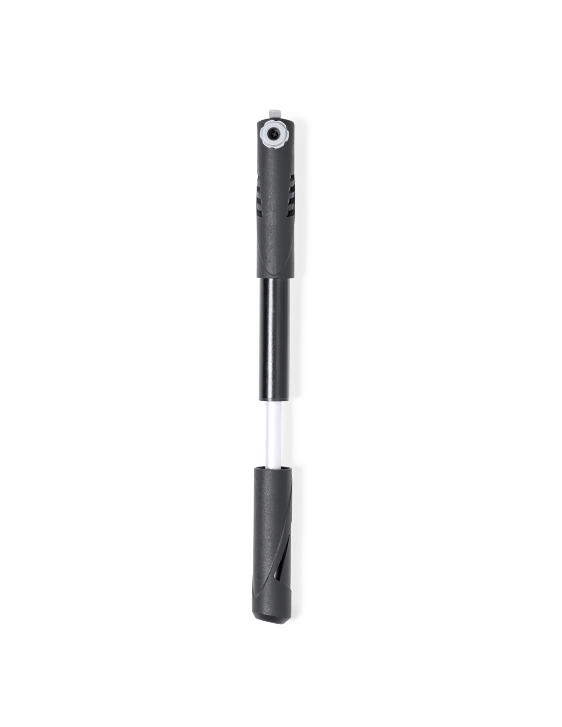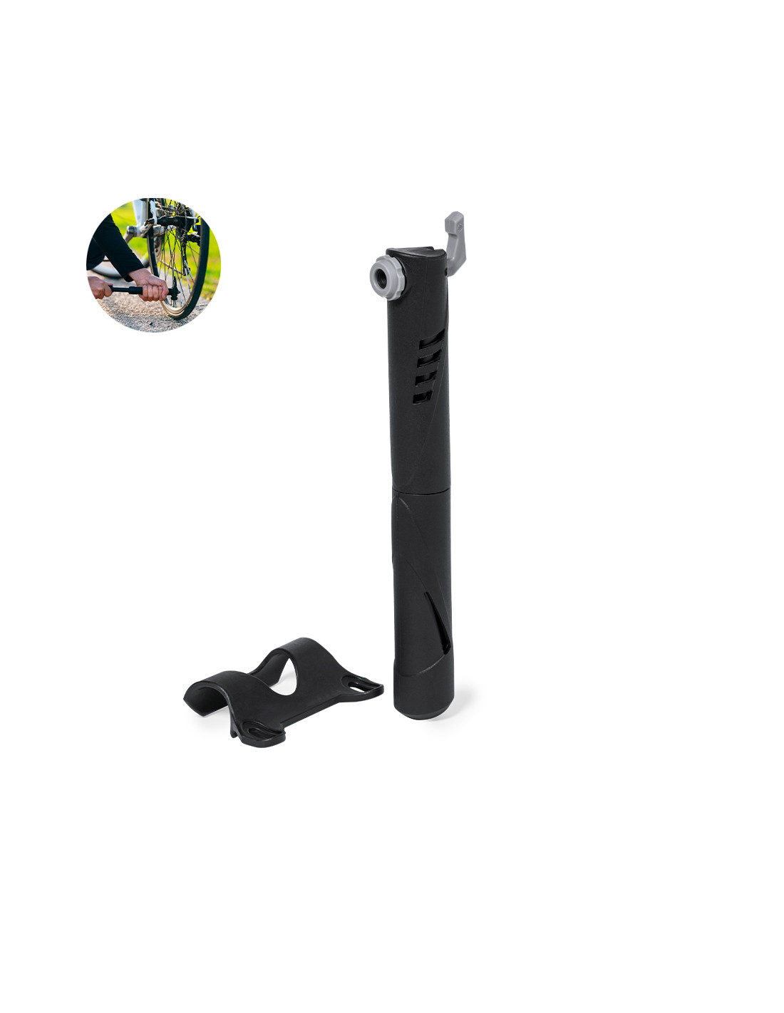 Práctica bomba para bicicleta, fabricada en resistente aluminio. De inflado manual y en tamaño reducido, con accesorio de acople válido para cualquier tipo de bicicleta.