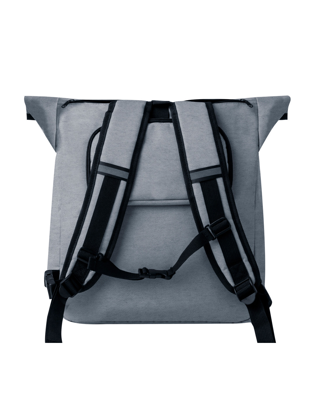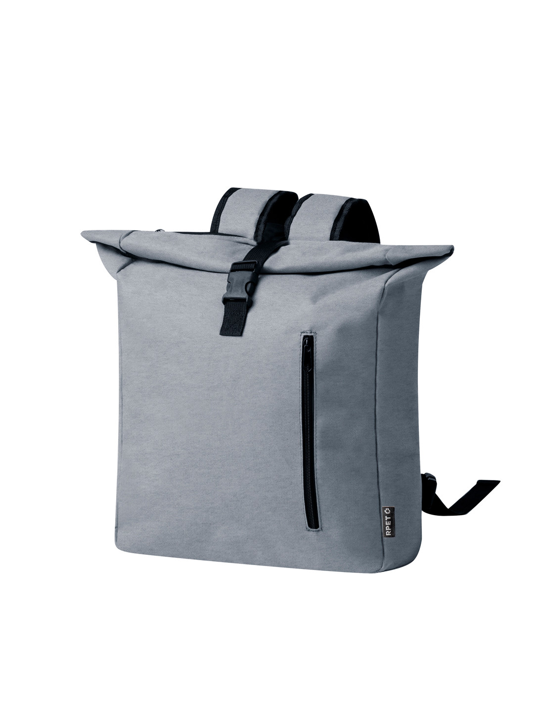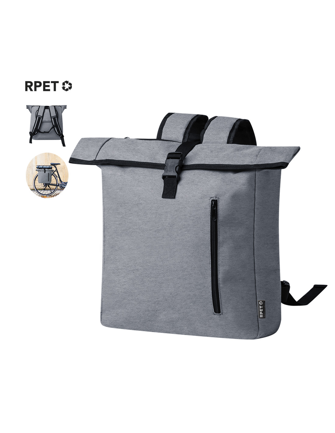 Mochila para bicicleta fabricada en resistente RPET 600D. Versátil y con cierre de hebilla, incluye un práctico bolsillo frontal con cremallera. En su parte trasera cuenta con enganches específicos universales para bicicleta, garantizando una mayor comodidad y seguridad en los desplazamientos. Además, dispone de un asas acolchadas y ajustables para los hombros, para así transportarla con mayor confort cuando se desacopla de la bicicleta. Etiqueta exterior con logotipo RPET.El material RPET