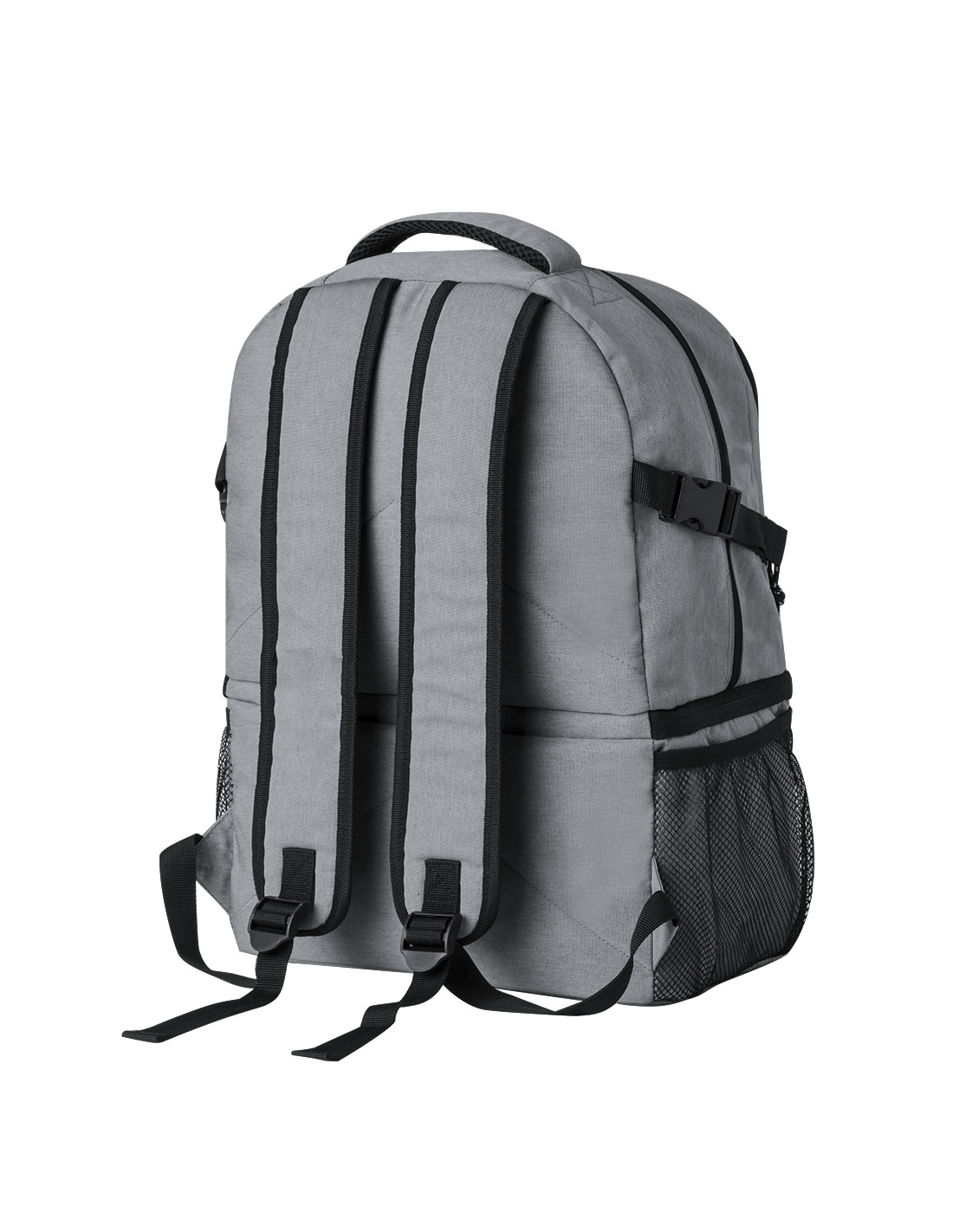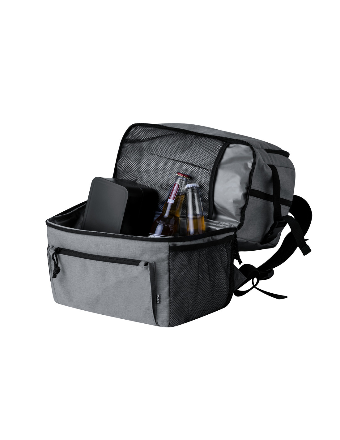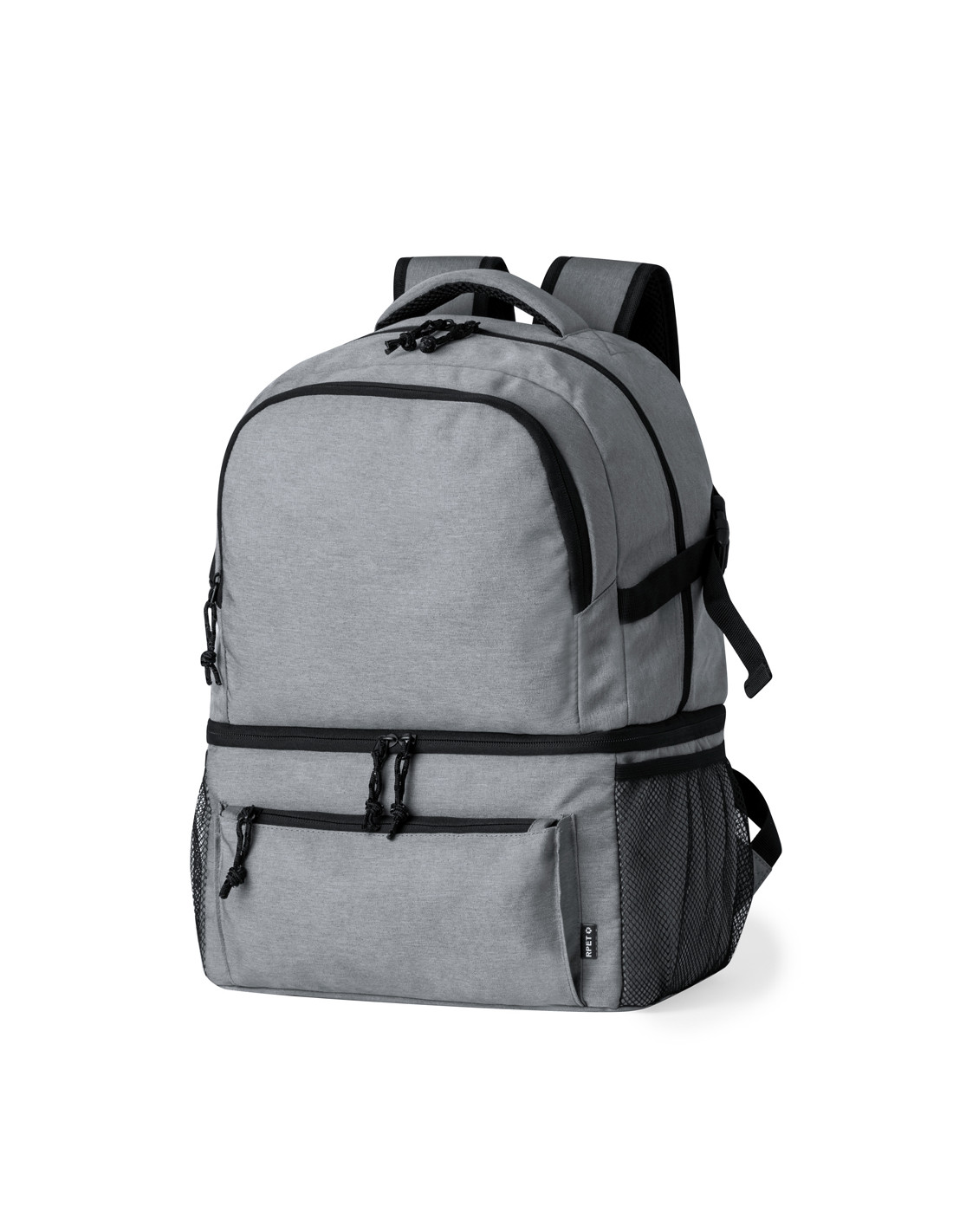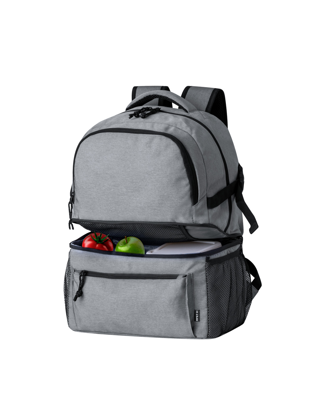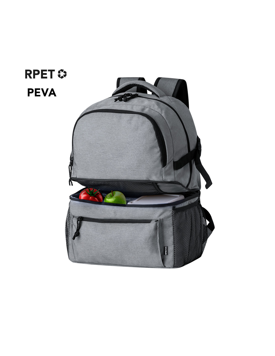 Mochila multiusos fabricada en resistente poliéster 600D RPET, con un diseño urbano y práctico. Destaca por su compartimento isotérmico independiente en la base, forrado con PEVA para mantener la temperatura. El compartimento principal se cierra con cremallera, de doble tirador, y cuenta con bolsillos frontales y laterales de malla para mayor versatilidad. Las cintas de hombros son acolchadas y ajustables. Además, dispone de un asa de mano acolchada en la parte superior. Etiqueta distintiva de RPET. Presentada individualmente en bolsa reciclada.El material RPET se elabora a partir de plástico reciclado, para así fomentar la reutilización de residuos plásticos y ayudar a la sostenibilidad del planeta.