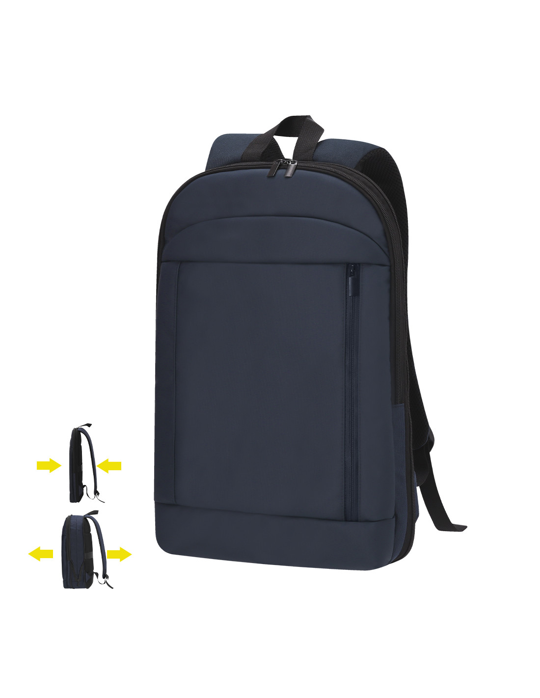 Mochila extensible confeccionada en resistente PU/ poliéster 900D. Equipada con cierre de cremallera de doble tirador, con posibilidad para ampliar la capacidad. Con compartimento interior acolchado para portátil de hasta 15 pulgadas. Cómodas cintas de hombros acolchadas, transpirables y ajustables. Incluye cinta para fijarla en trolley y maletas.