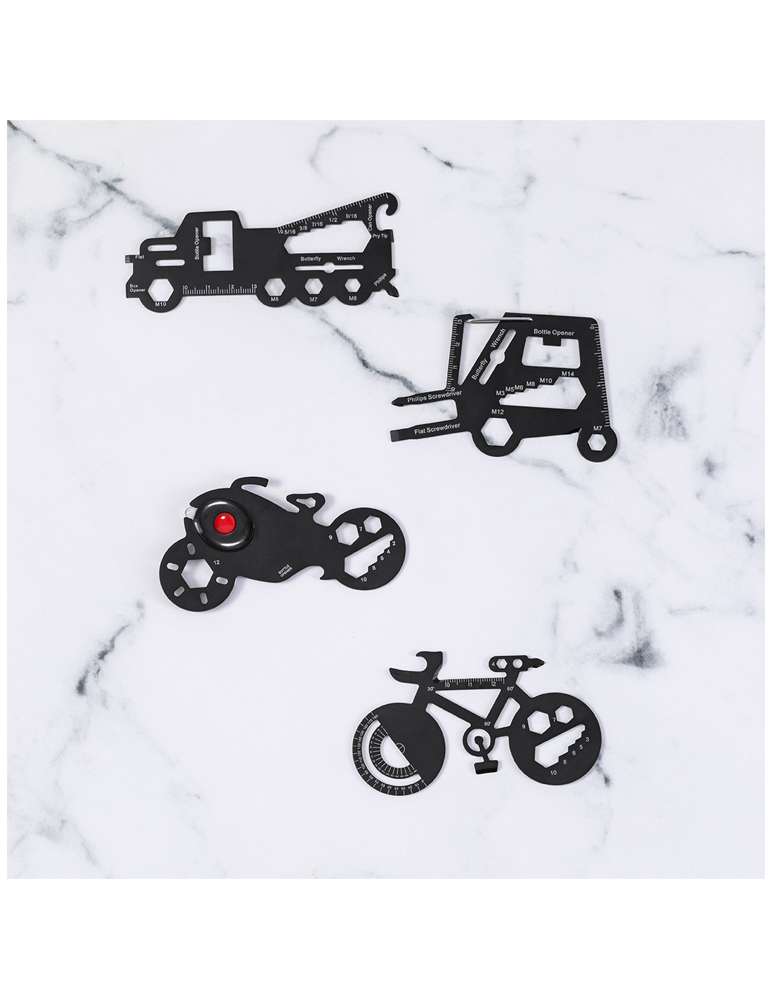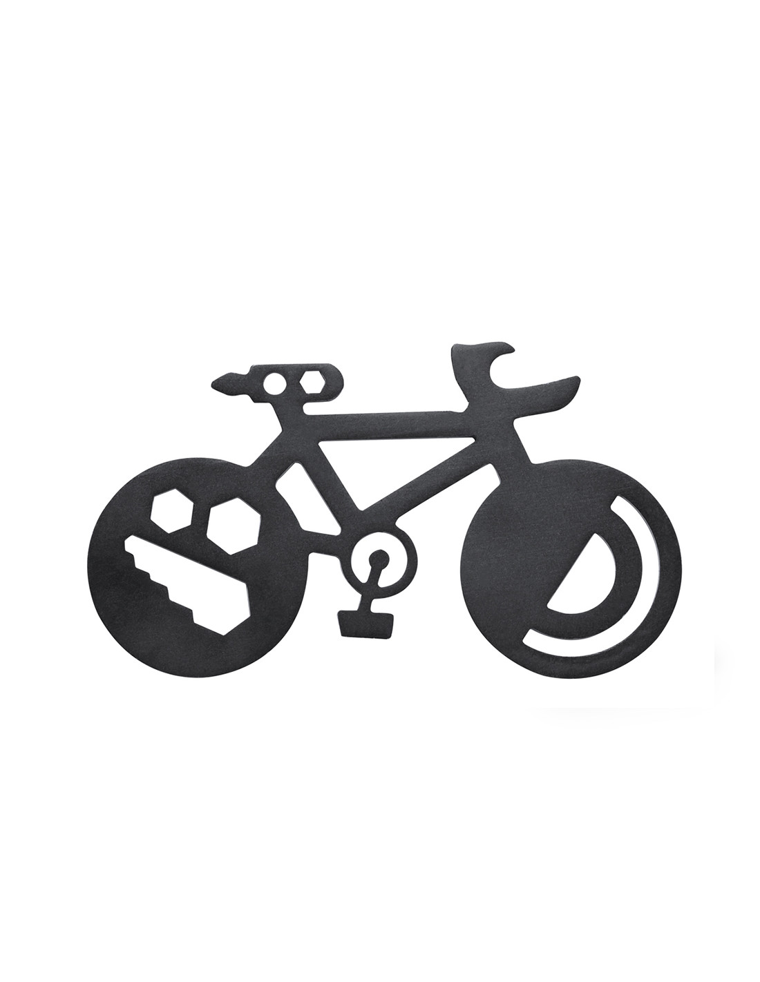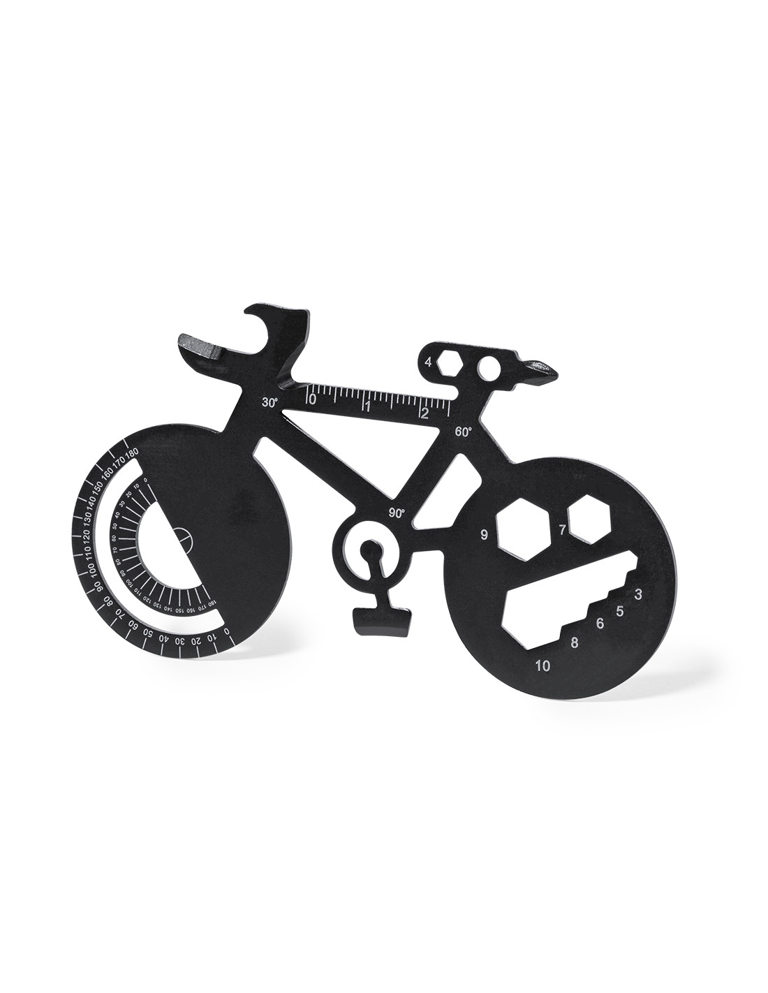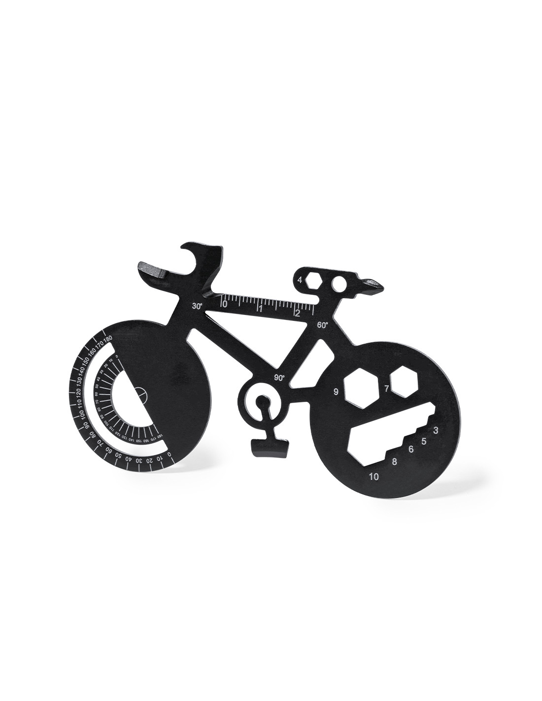 Original y práctica multiherramienta en acero inox con forma de bicicleta. Con 16 funciones, entre otras: destornillador de punta plana y philips, llave para tuercas hexagonales en varios tamaños, regla, transportador de ángulos y abrebotellas. Presentada en bolsa de papel reciclada.
