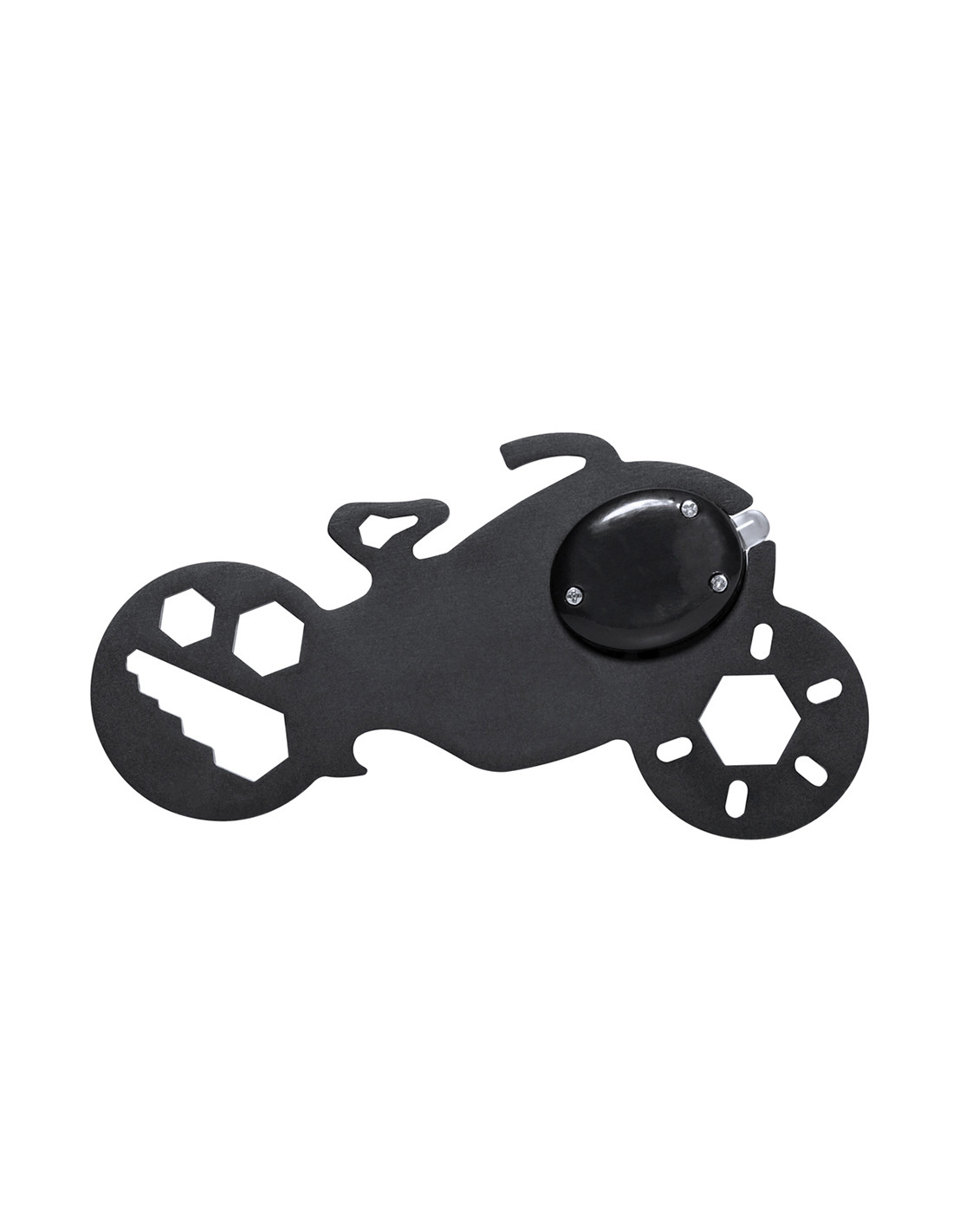 Original y práctica multiherramienta en acero inox con forma de motocicleta. Con 11 funciones, entre otras: llave para tuercas hexagonales en varios tamaños y abrebotellas. Además, con linterna de 1 LED alimentada por pila de botón. Presentado en bolsa de papel reciclada.