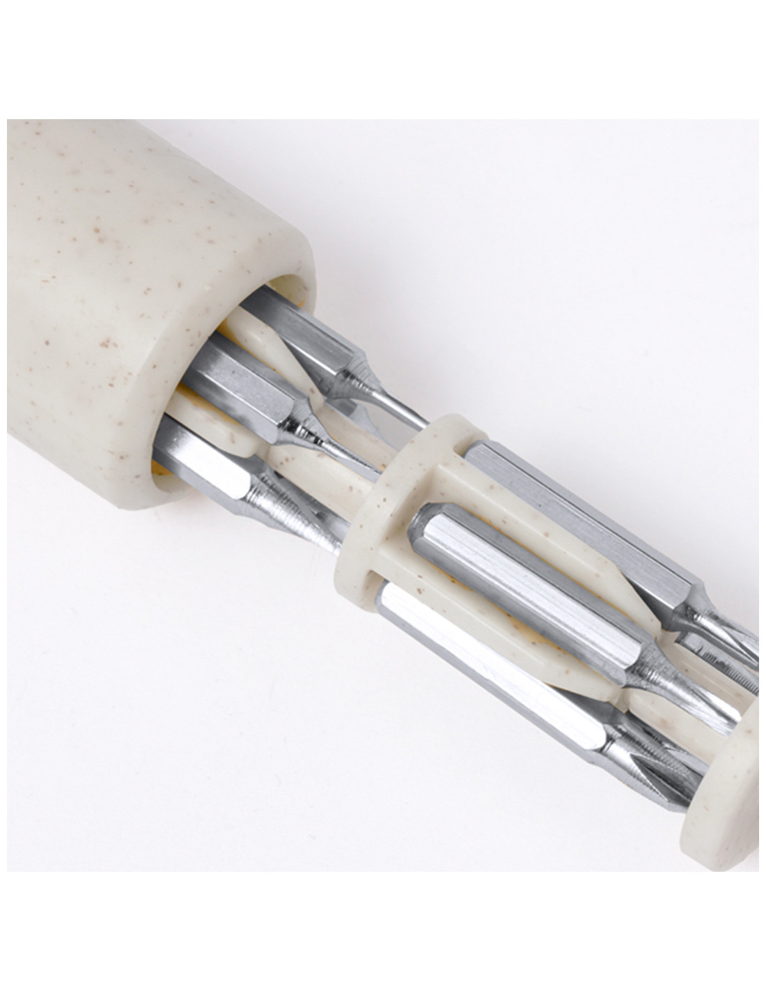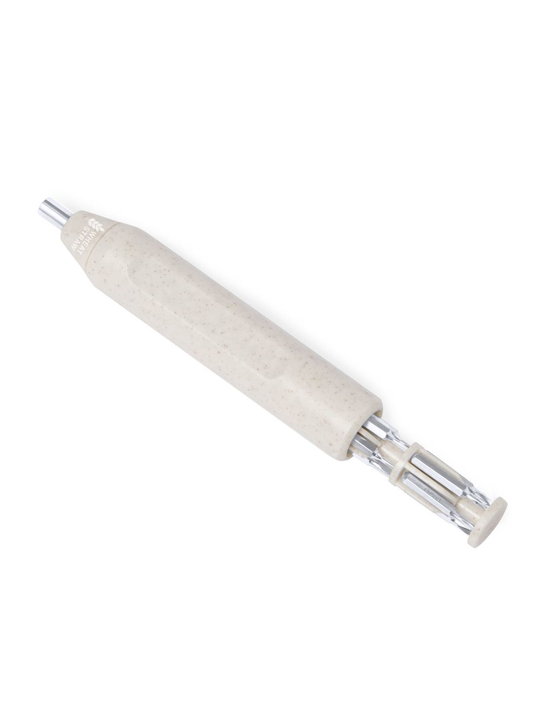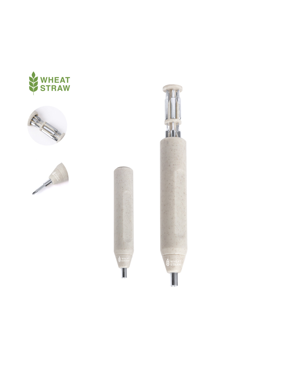 Práctica multiherramienta fabricada en caña de trigo con forma de destornillador. Incluye un compartimento en la empuñadura para guardar las múltiples puntas magenéticas (planas y philips). Con logotipo caña de trigo incluido. Presentada en caja de diseño kraft. La caña de trigo fomenta la utilización de materias primas naturales, reduciendo así las emisiones contaminantes.