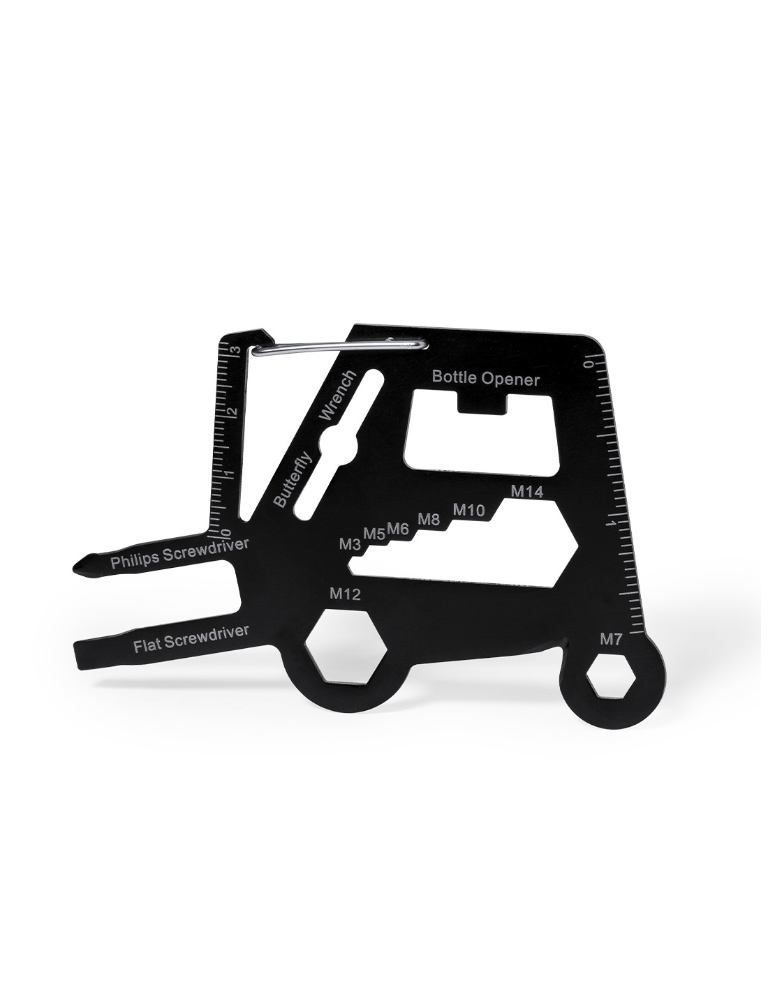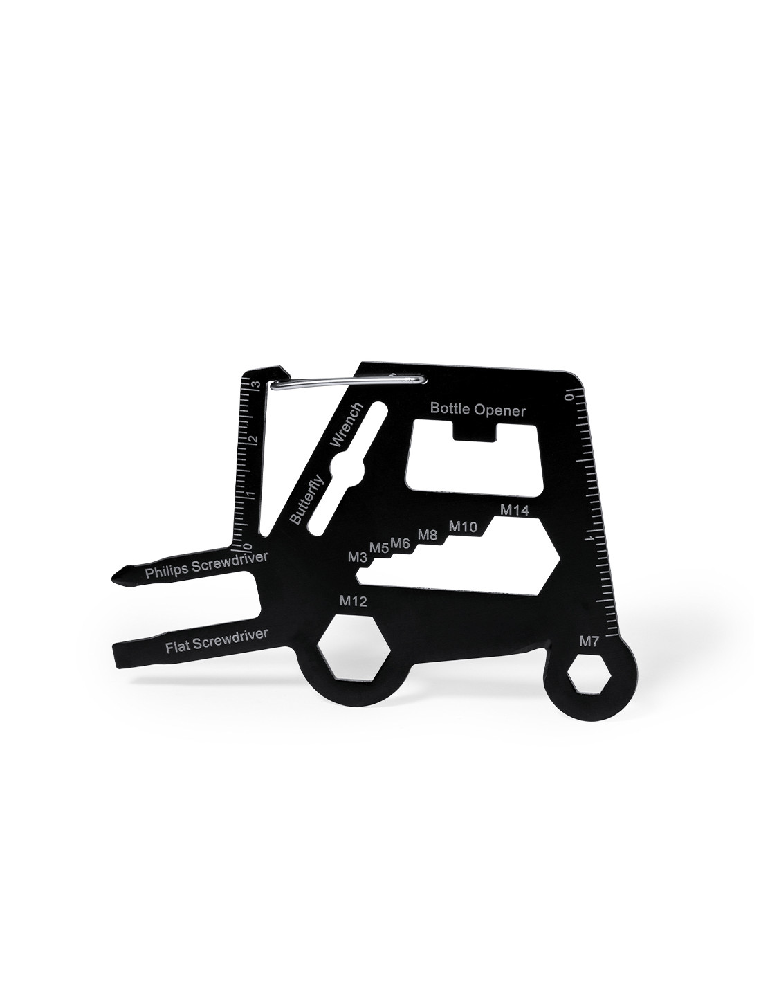 Original y práctica multiherramienta en acero inox con forma de toro mecánico. Con 16 funciones, entre otras: destornillador de punta plana y philips, llave para tuercas hexagonales en varios tamaños, regla, abridor de cajas y abrebotellas. Además de enganche en forma de mosquetón para un fácil transporte. Presentado en bolsa de papel reciclada.