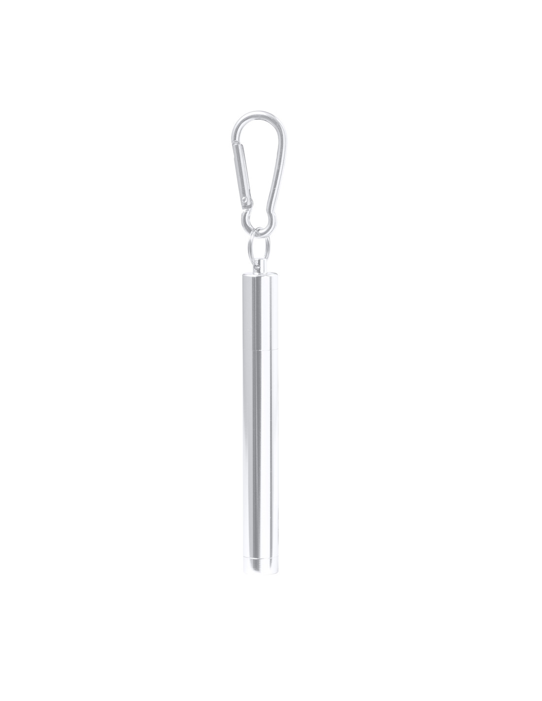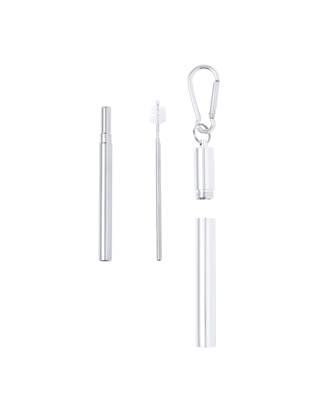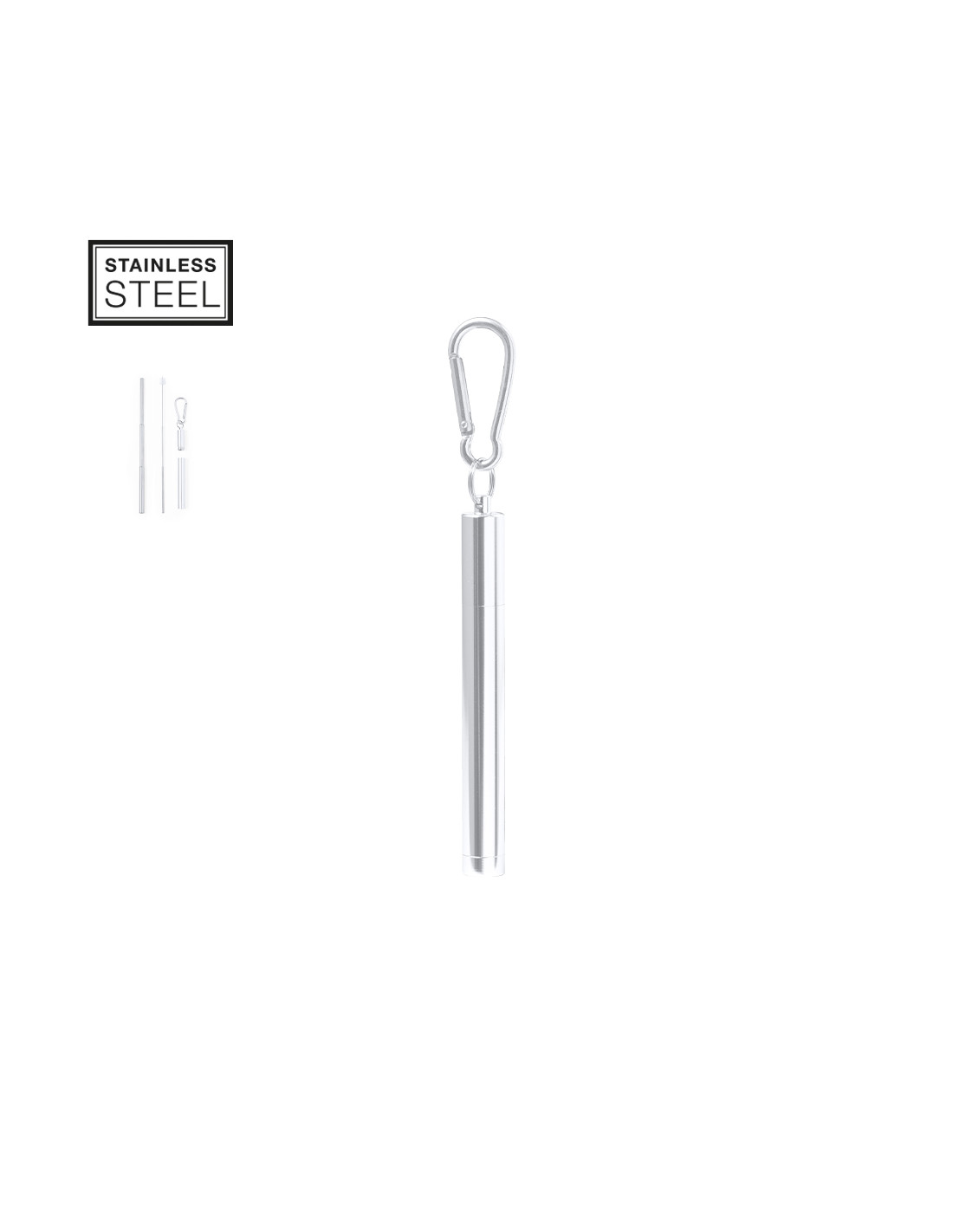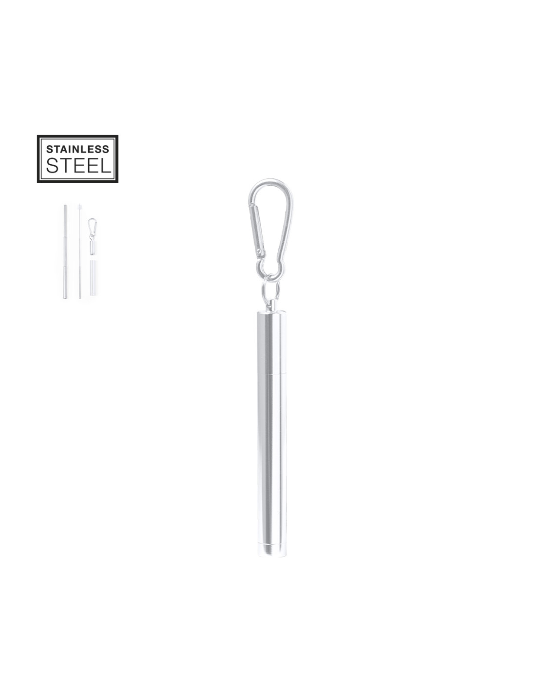 Pajita reutilizable y extensible en acero inox, con boquilla de silicona. Con accesorio limpiador incluido y presentada en estuche a juego con mosquetón para transporte.