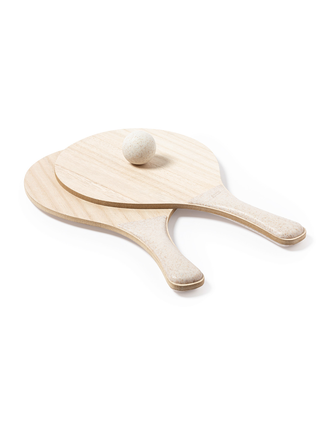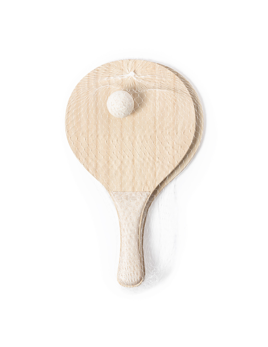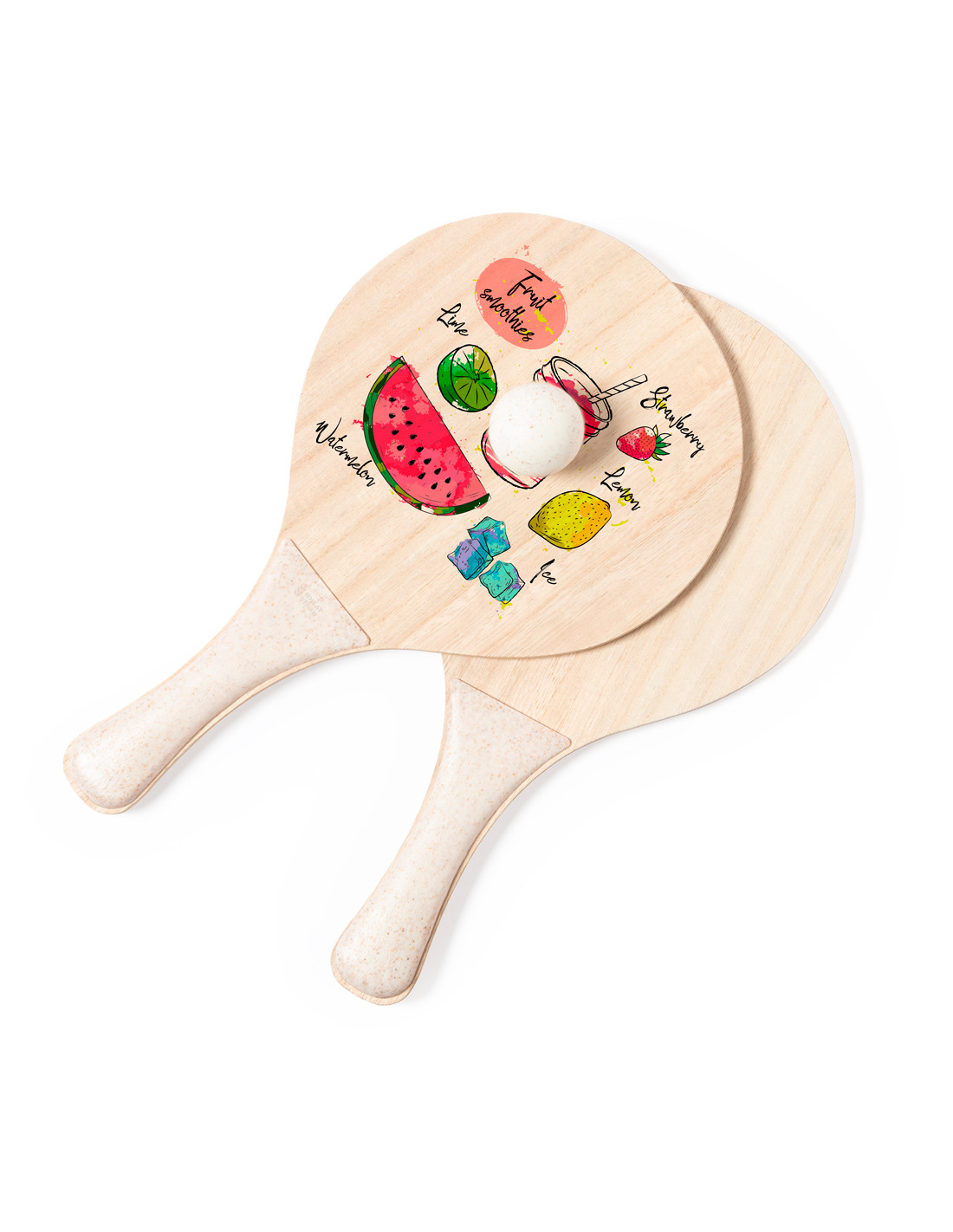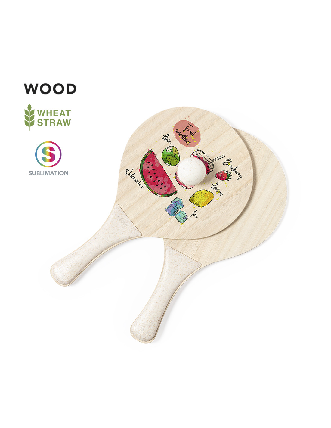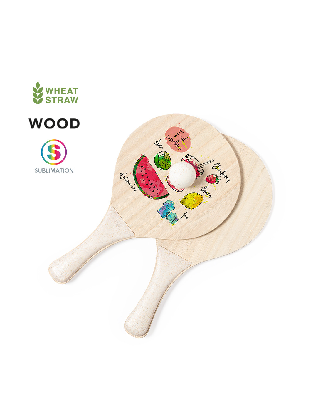 Par de palas de playa especiales para la sublimación. Fabricadas en madera, con mango reforzado en caña de trigo. Zona especial para la sublimación en la parte plana de la pala con posibilidad de diseños a todo color. Logotipo en el mango. Presentadas en bolsa de rejilla, con pelota de caña de trigo.La caña de trigo fomenta la utilización de materias primas naturales, reduciendo así las emisiones contaminantes.