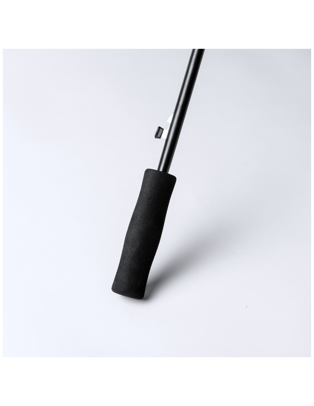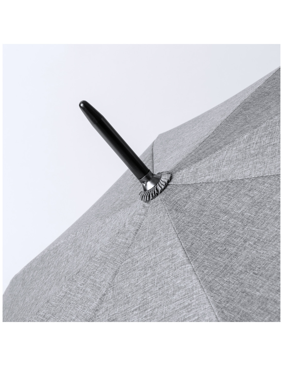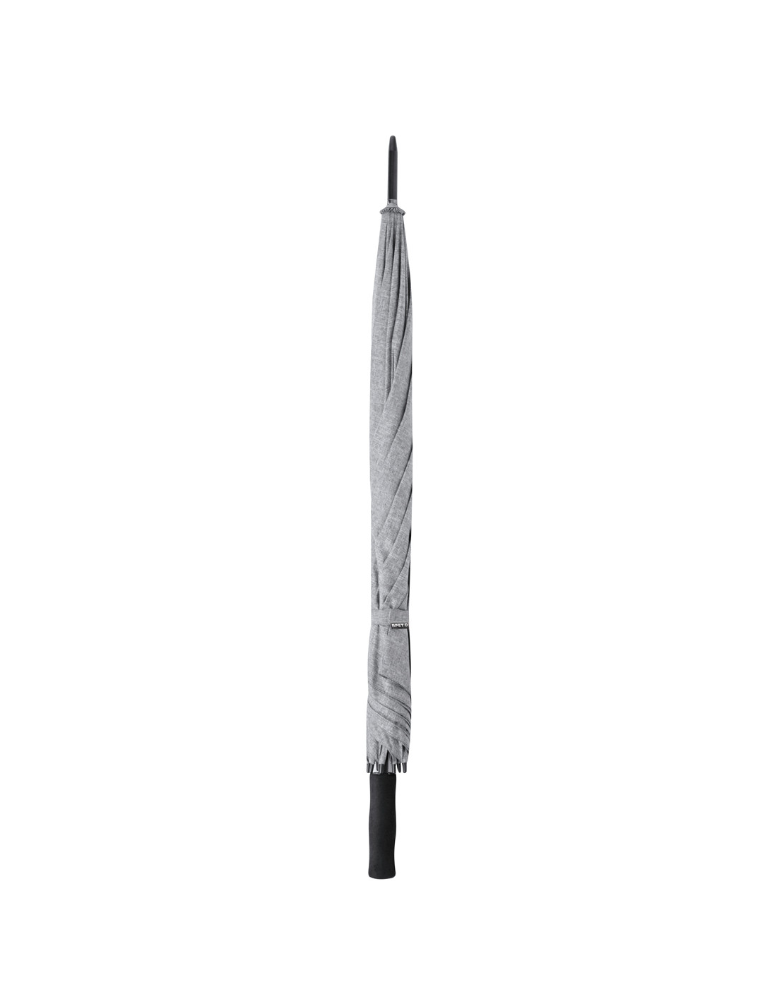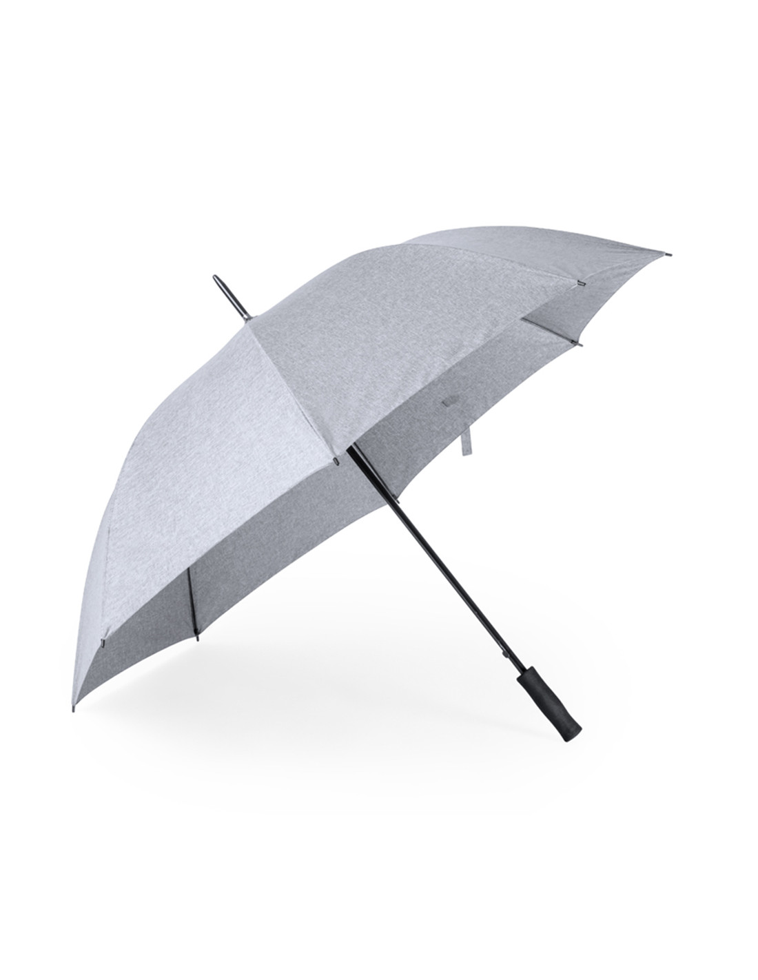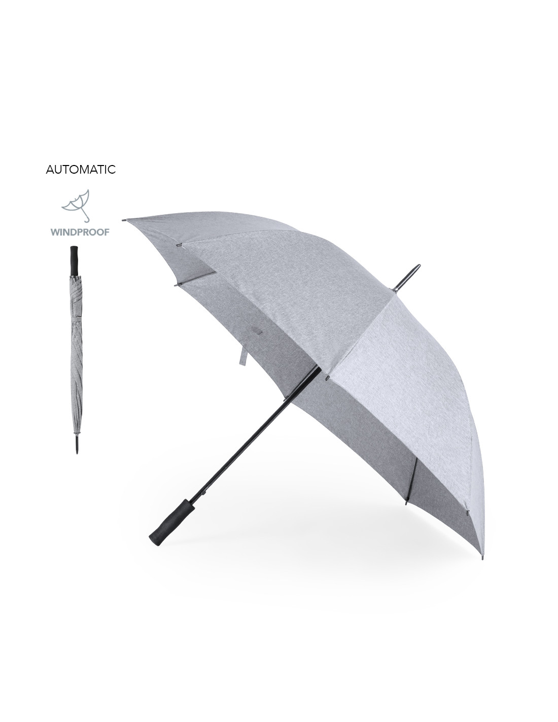 Paraguas de alta calidad y 130cm de diámetro, fabricado en material poliéster 150D y en elegante tono gris jaspeado. Apertura automática, varillas de fibra de vidrio antiviento y cierre de velcro. Mango recto fabricado en EVA. Presentado en bolsa reciclada.