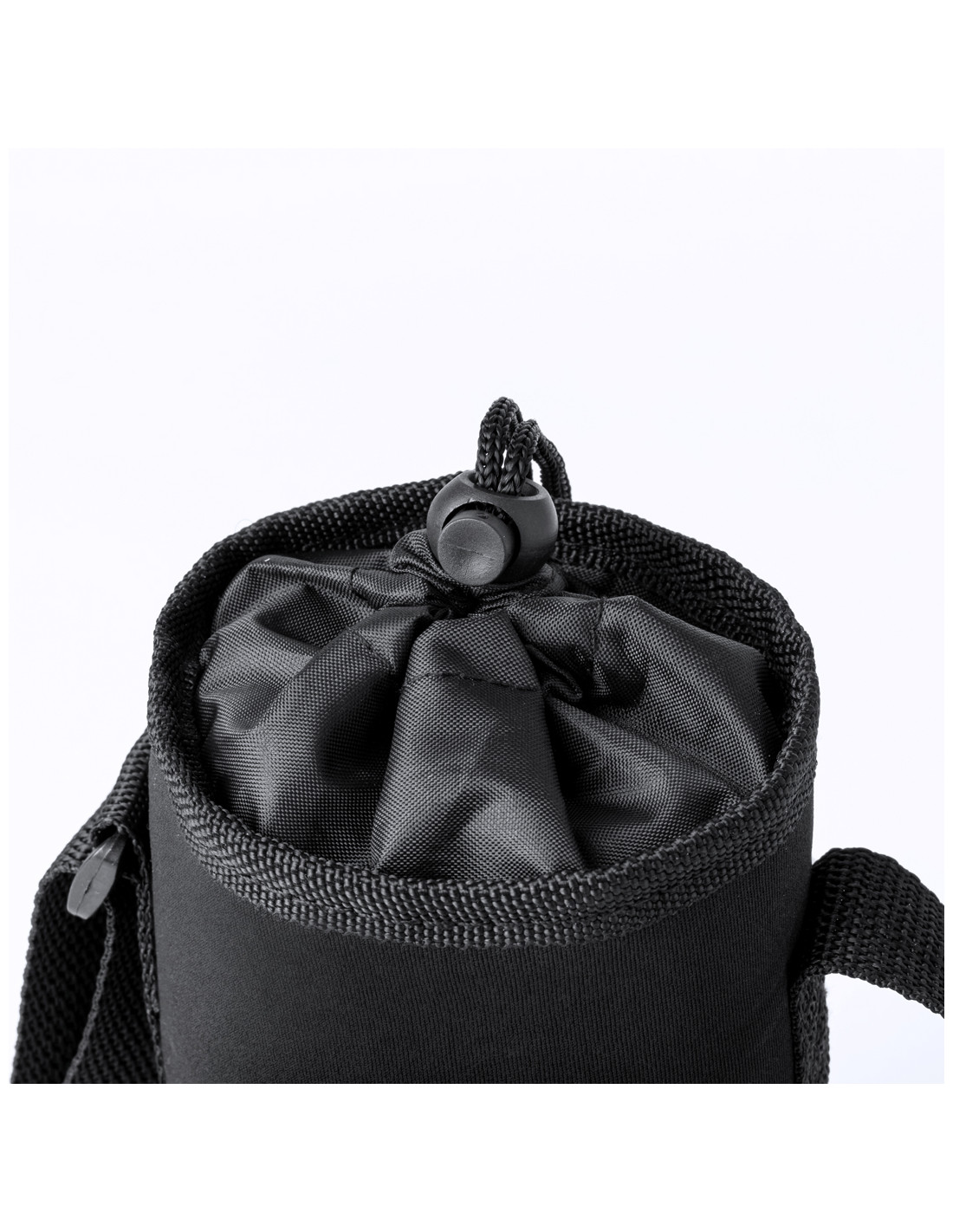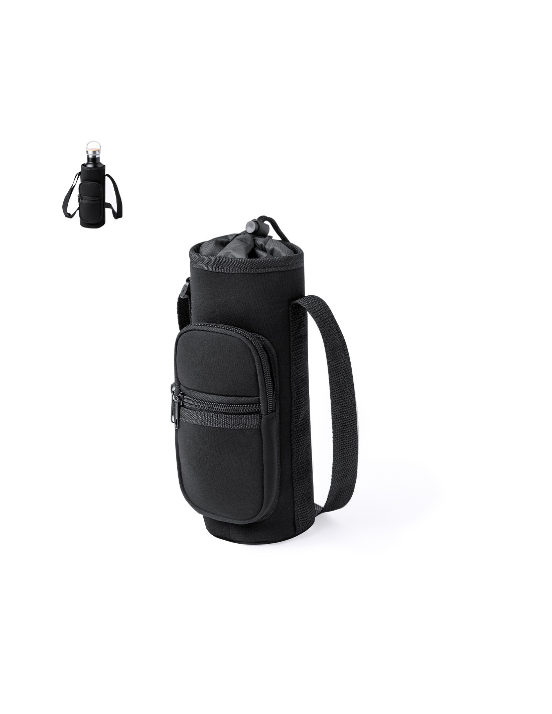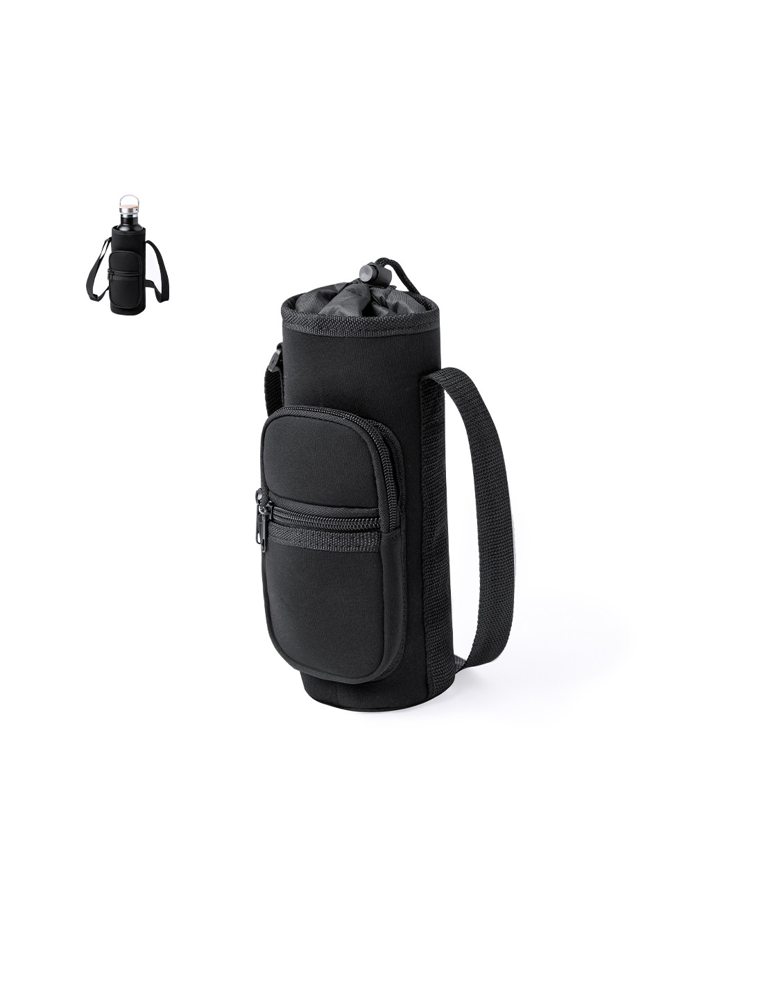 Portabidones de hasta 1,5L, fabricada en soft shell. Con cierre de cordón y se lleva cómodamente con la cinta para el hombro ajustable. Con bolsillos frontales de cremallera. Presentado individualmente en bolsa reciclada.