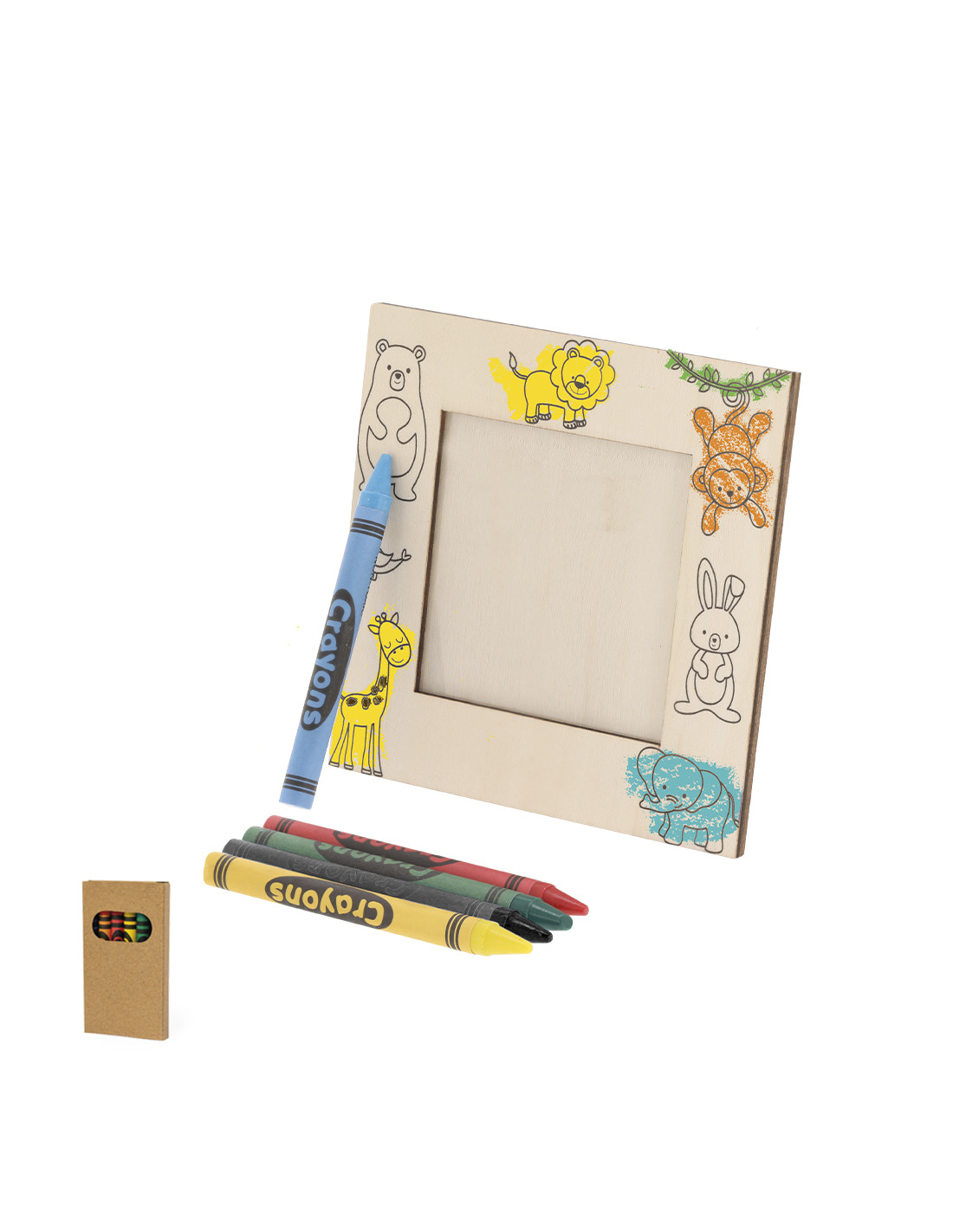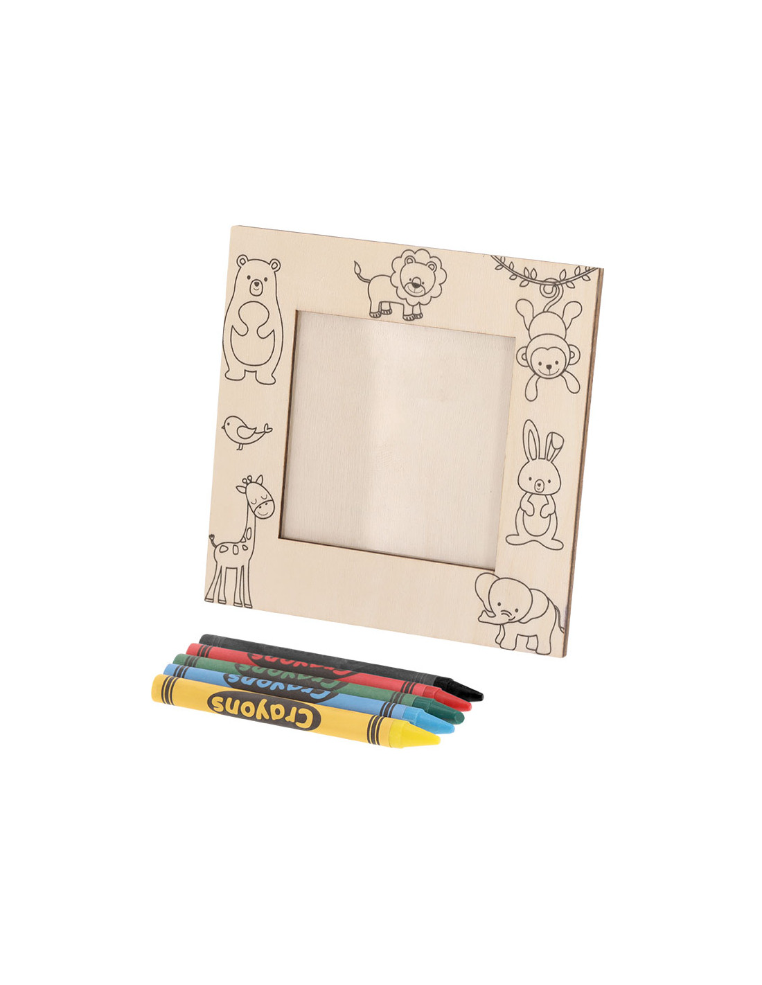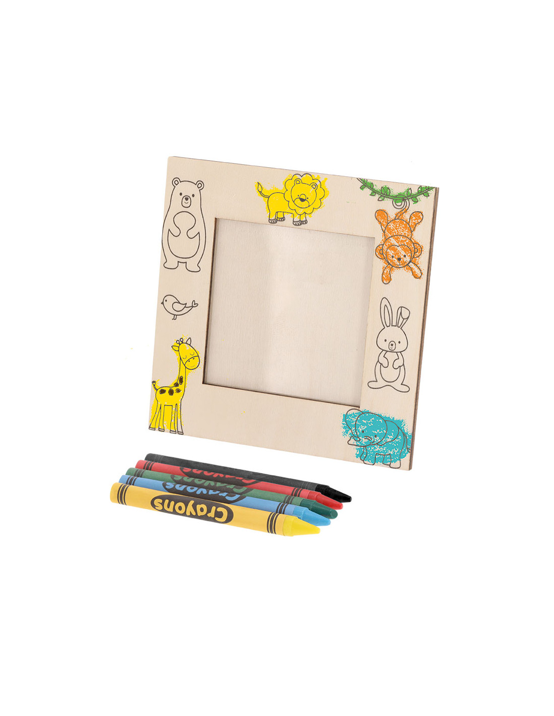 Marco de fotos fabricado en madera natural con diseño de animales. Incluye ceras de colores para personalizar y decorar el marco. Diseñado para fotografías de 7,5x7,5 cm. Cuenta con práctico soporte trasero de bisagra.