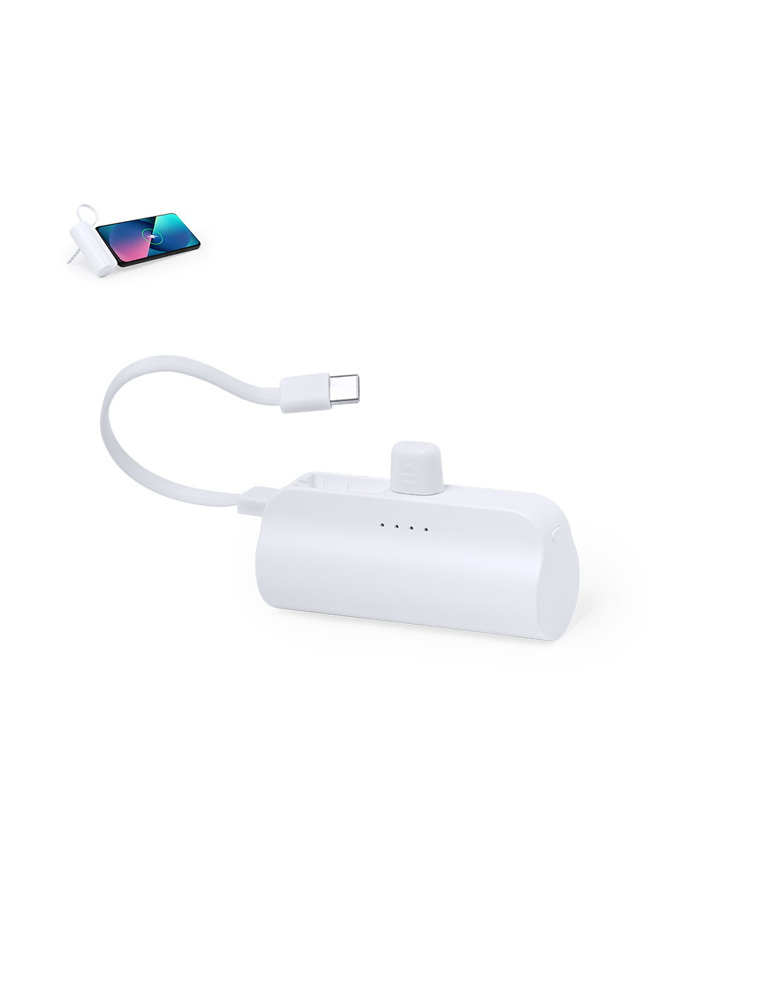Batería auxiliar externa de 5.000 mAh de capacidad fabricada en resistente ABS. Con original diseño cilíndrico y patilla extraíble que lo convierte en soporte, para todo tipo de dispositivos móviles. Incluye dos salidas y una entrada Tipo C e indicador de estado de carga, con cable Tipo C incluido. Presentada en atractiva caja de diseño kraft, con manual de instrucciones en español e inglés.Las capacidades mostradas en todas nuestras baterías auxiliares externas son reales, incorporando todas ellas baterías de grado A y no recicladas, con una vida útil de al menos 500 ciclos de carga y según normativa CE.Además, están fabricadas conforme a los estándares RoHS y en cumplimiento con los siguientes requisitos de seguridad:Sistema de protección contra sobrecarga del power bank.Sistema de protección contra descarga completa que proporciona una mayor durabilidad del power bank