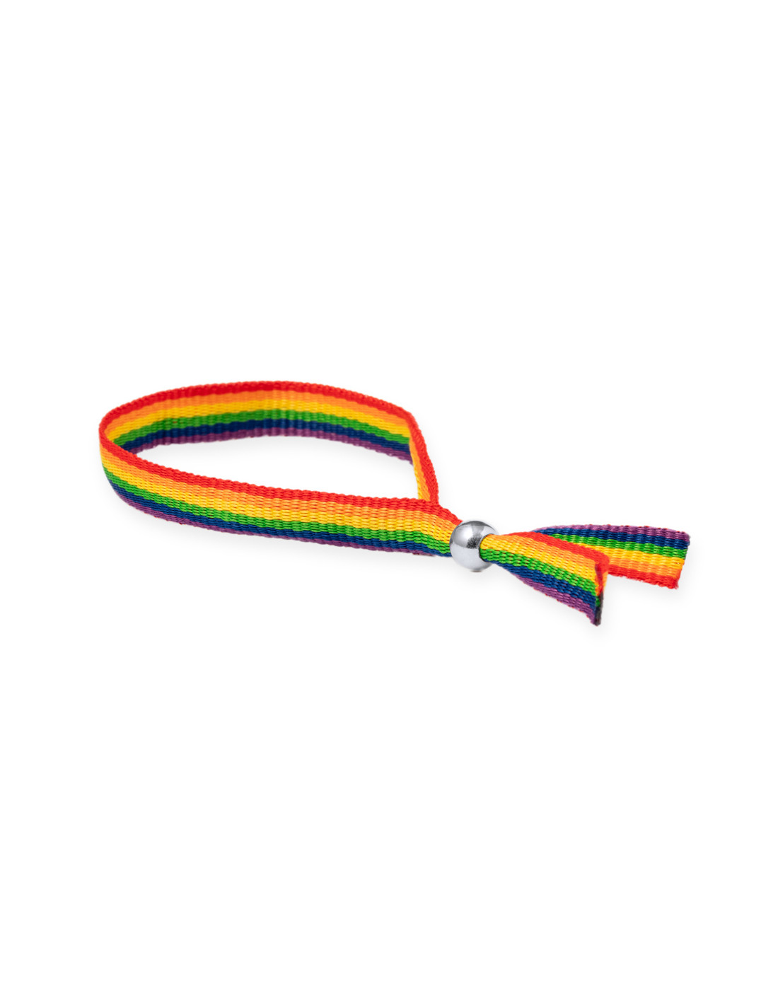 Pulsera Rainbow multicolor, fabricada en suave poliéster. Con cierre de bola ajustable en acabado cromado. Pespuntes de refuerzo en los laterales. Todo un orgullo de pulsera.