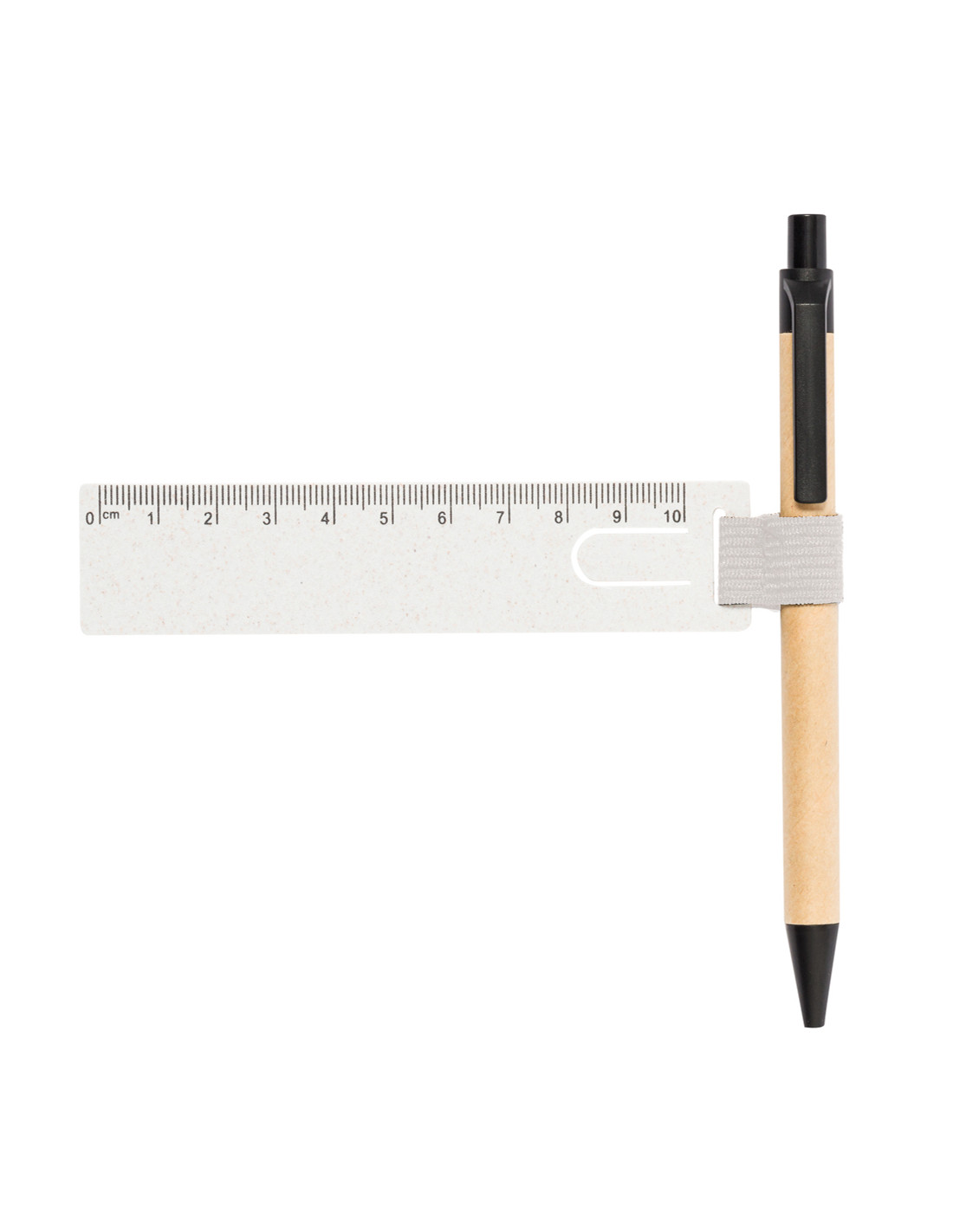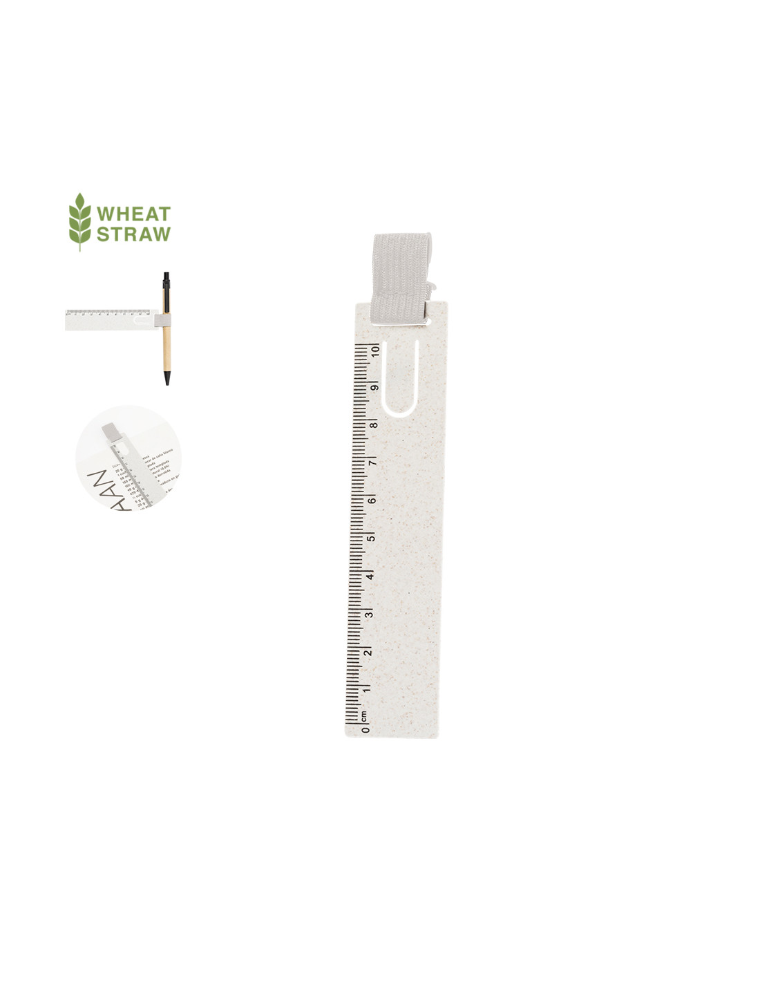 Original regla marcapáginas hecho en caña de trigo. Práctico utensilio de medida de hasta 10cm con pestaña para usar como marcapáginas y goma elástica para sujetar bolígrafos. Fabricado en caña de trigo y poliéster. Presentado individualmente en una bolsa de papel reciclada. La caña de trigo fomenta la utilización de materias primas naturales, reduciendo así las emisiones contaminantes.