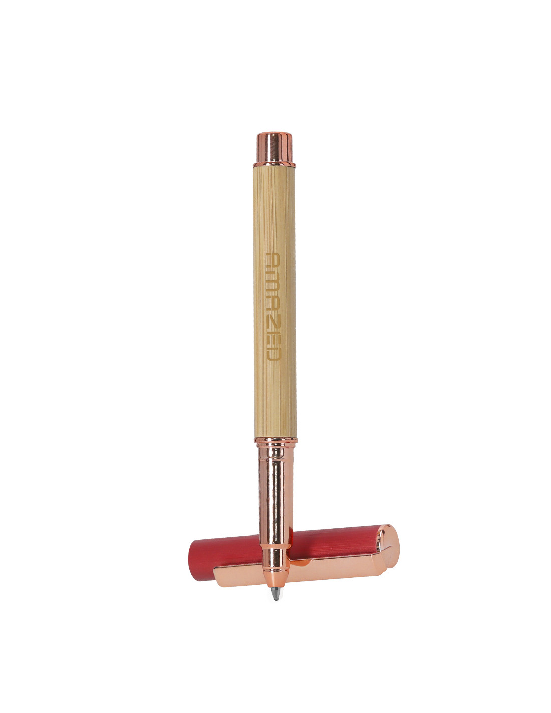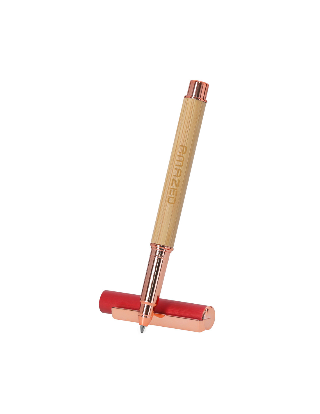 Elegante roller fabricado en bambú y aluminio. Con clip metálico, empuñadora y detalles de acabado oro rosa, caña fabricada en bambú y tapadera en aluminio. Con cartucho jumbo, en tinta azul y con cierre de capucha.