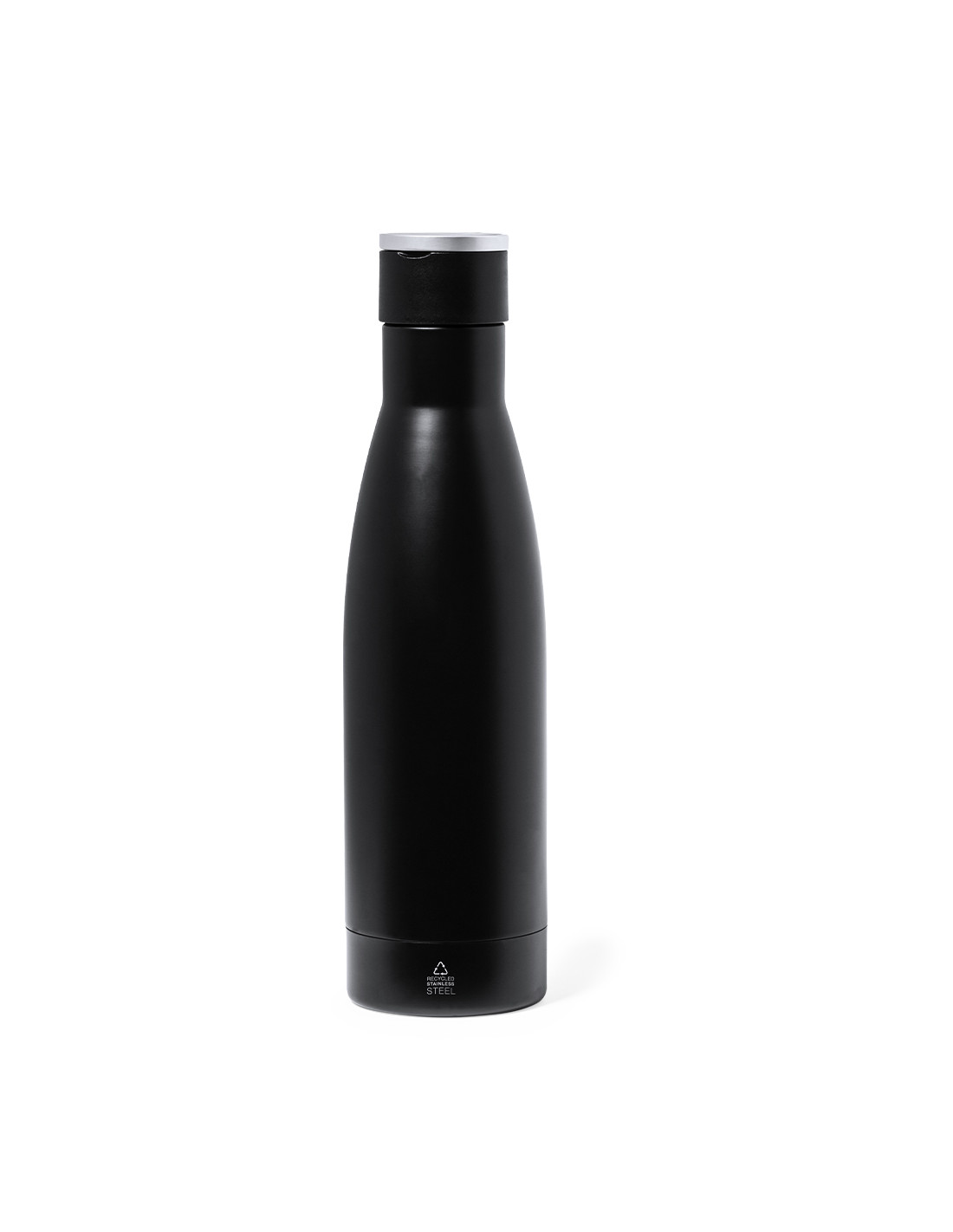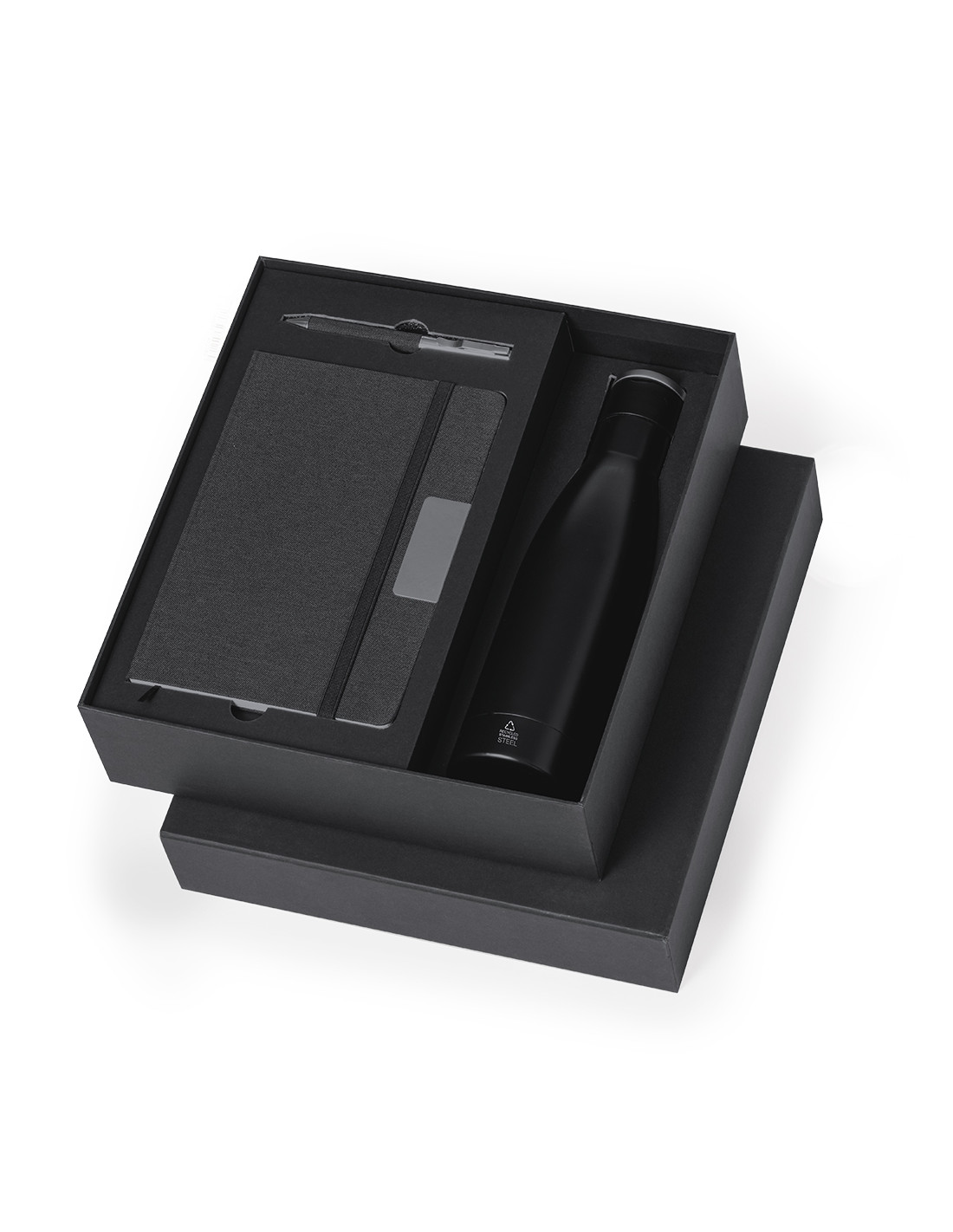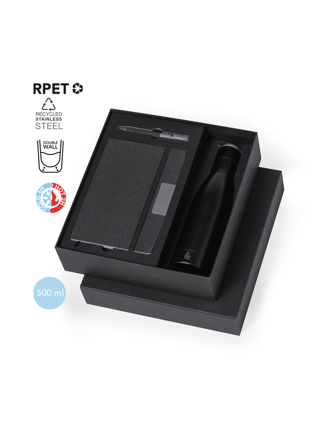 Elegante set premium que incluye: Termo de doble capa en Acero Inox Reciclado de acabado negro mate y de 500 ml de capacidad, con asa rígida de metal color plata mate. Con logotipo acero inox.Bloc de notas en RPET en elegante color negro, con detalle metálico especial para marcaje en láser. Incluye cierre elástico y marcapáginas de tela. Interior con 80 hojas de disposición a una raya. Con logotipo RPET.Bolígrafo en RPET de acabado negro mate, de mecanismo giratorio y tinta azul. Con clip y puntera en pulido metal. Set presentado en estuche individual de acabado mate, con troquelado interior para cada uno de los elementos del set.El material RPET se elabora a partir de plástico reciclado, para así fomentar la reutilización de residuos plásticos y ayudar a la sostenibilidad del planeta.