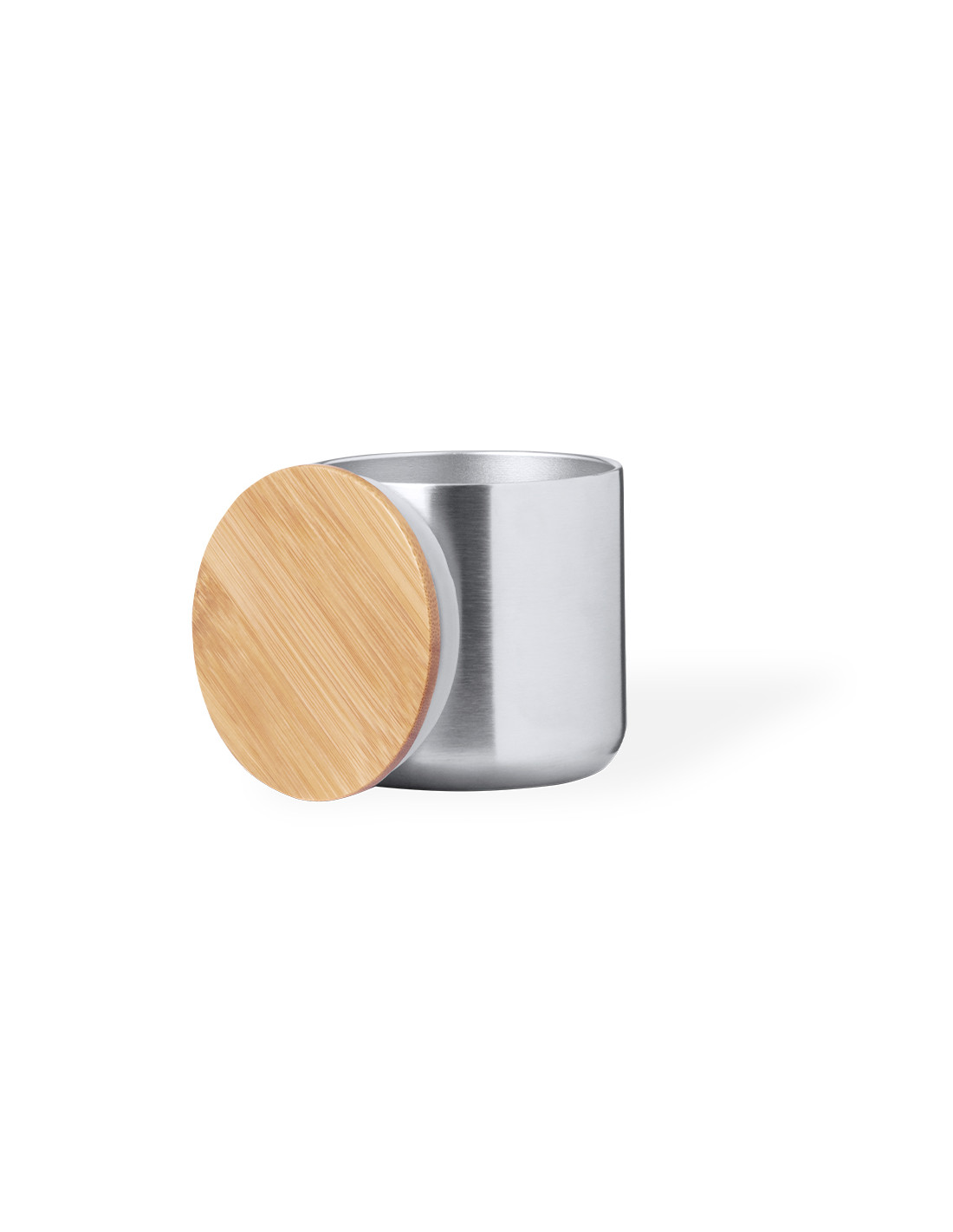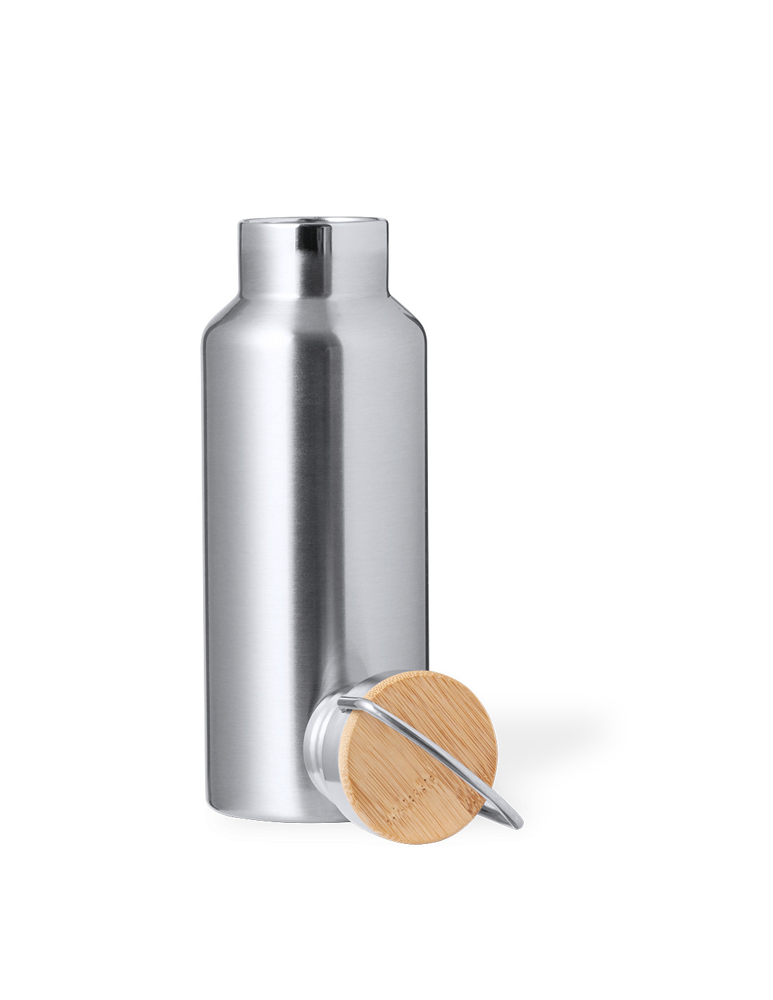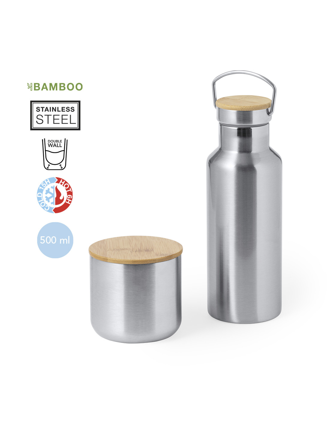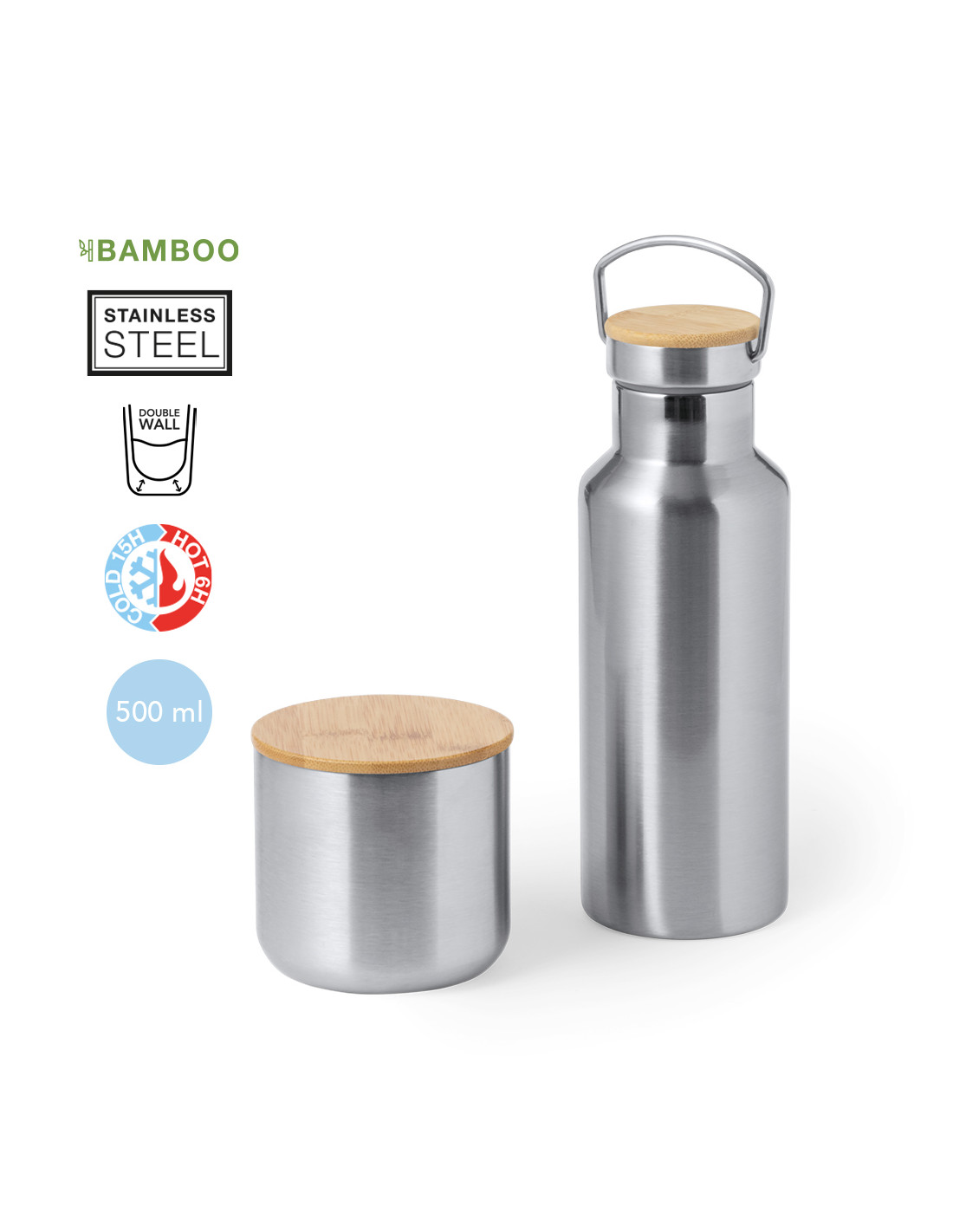 Práctico set de bidón y vaso térmico en acero inox. Incluye, bidón térmico de 500 ml de capacidad fabricado en acero inox, tapón de seguridad a rosca con base de bambú e incluye asa de transporte. Además, contiene 1 vaso de 300 ml de capacidad en acero inox y tapadera bambú con cierre de presión. Presentado en una caja de diseño kraft.