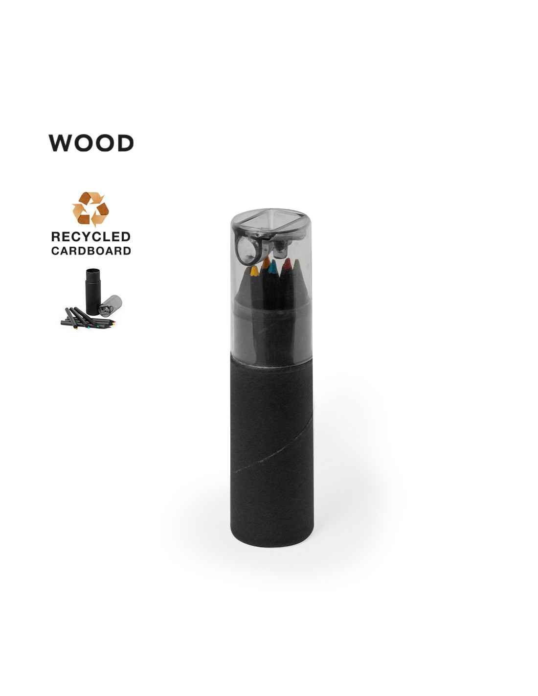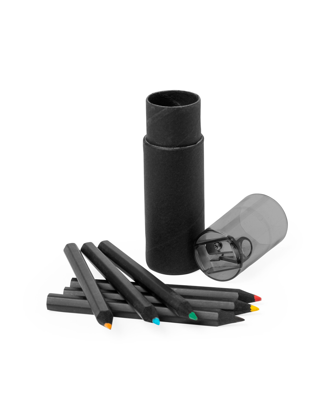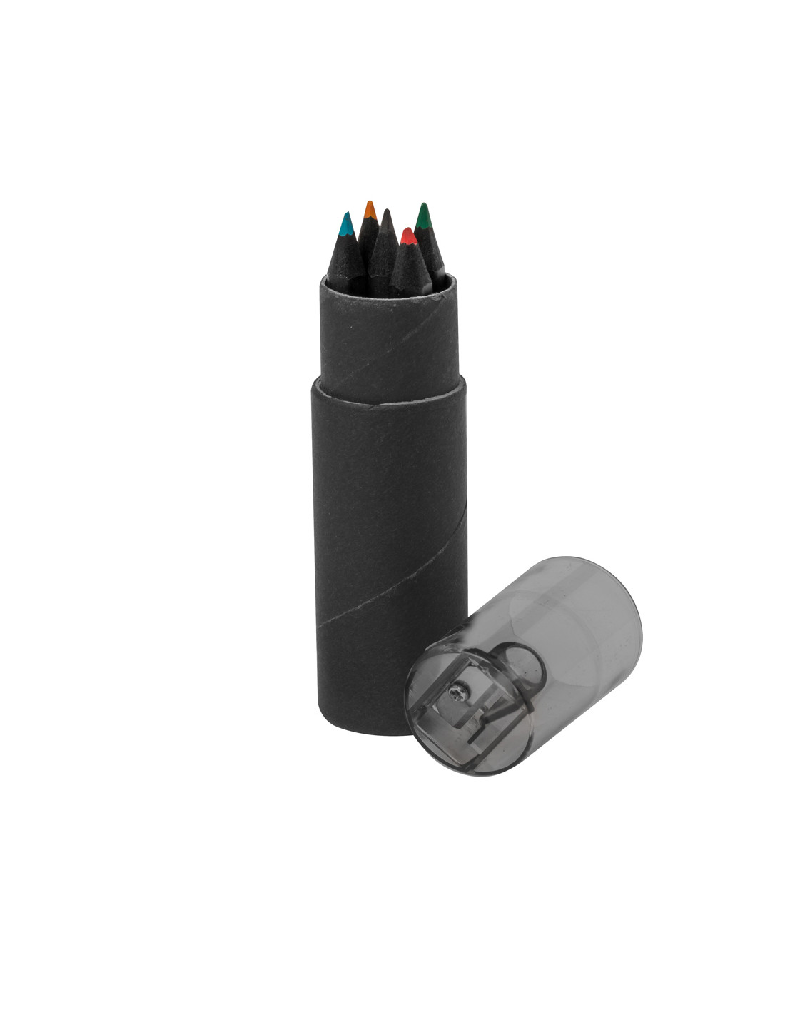 Set de 6 lápices de madera acabada en color negro, con cuerpo hexagonal y minas en varios colores. Presentados en estuche cilíndrico de cartón reciclado negro, con capucha transparente a juego y sacapuntas integrado.