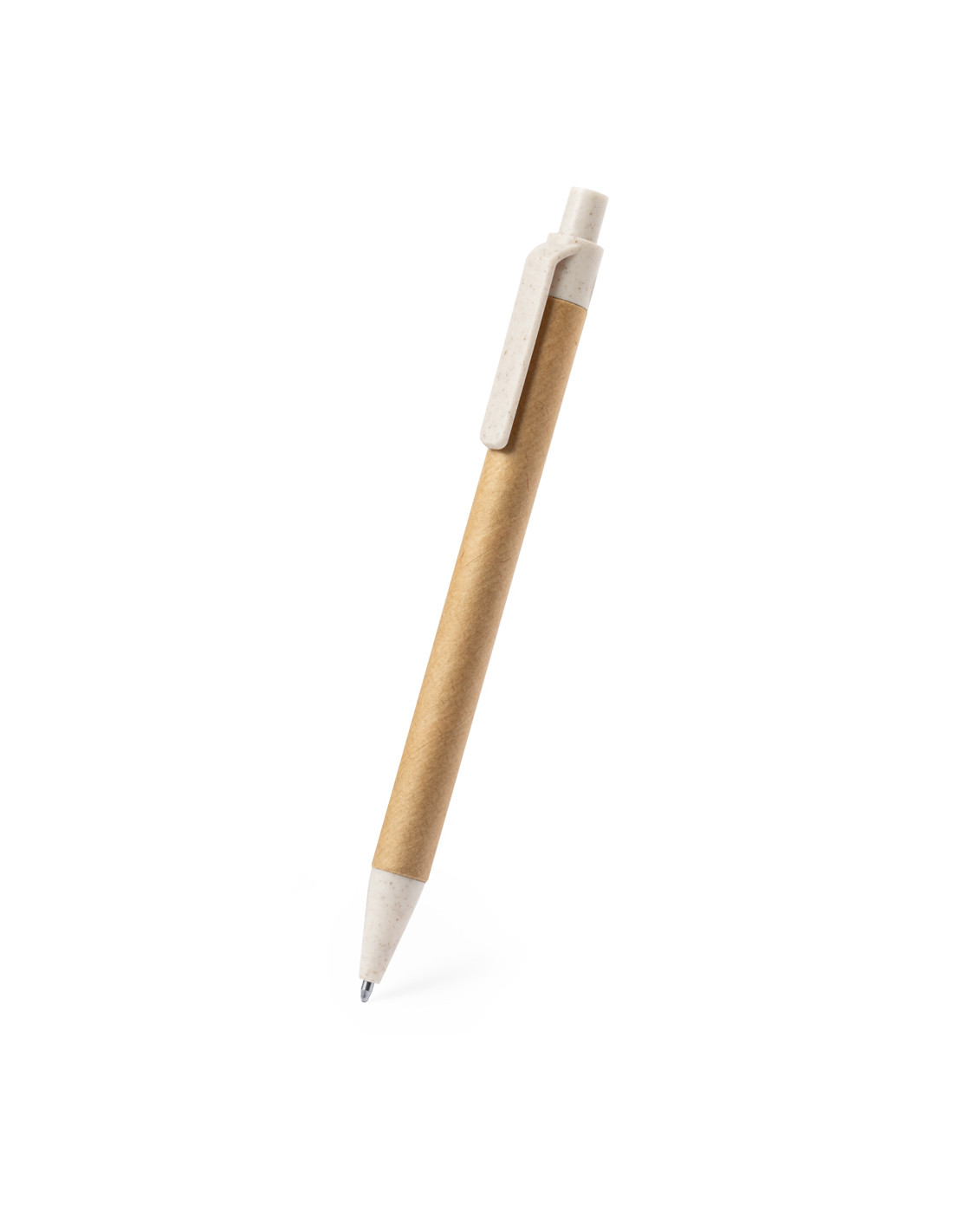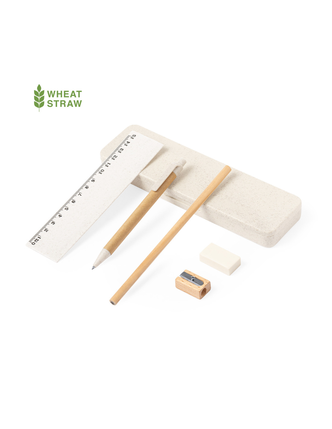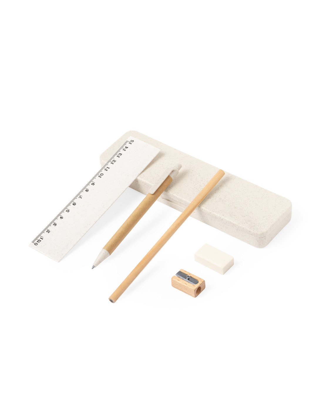 Set de escritura fabricado en caña de trigo. Práctico conjunto compuesto por: - Lápiz hecho en madera- Bolígrafo fabricado en cartón reciclado y caña de trigo- Regla hecha con caña de trigo- Sacapuntas de madera- Goma- Estuche hecho en caña de trigo. La caña de trigo fomenta la utilización de materias primas naturales, reduciendo así las emisiones contaminantes.