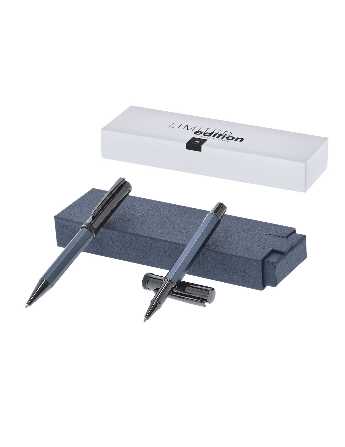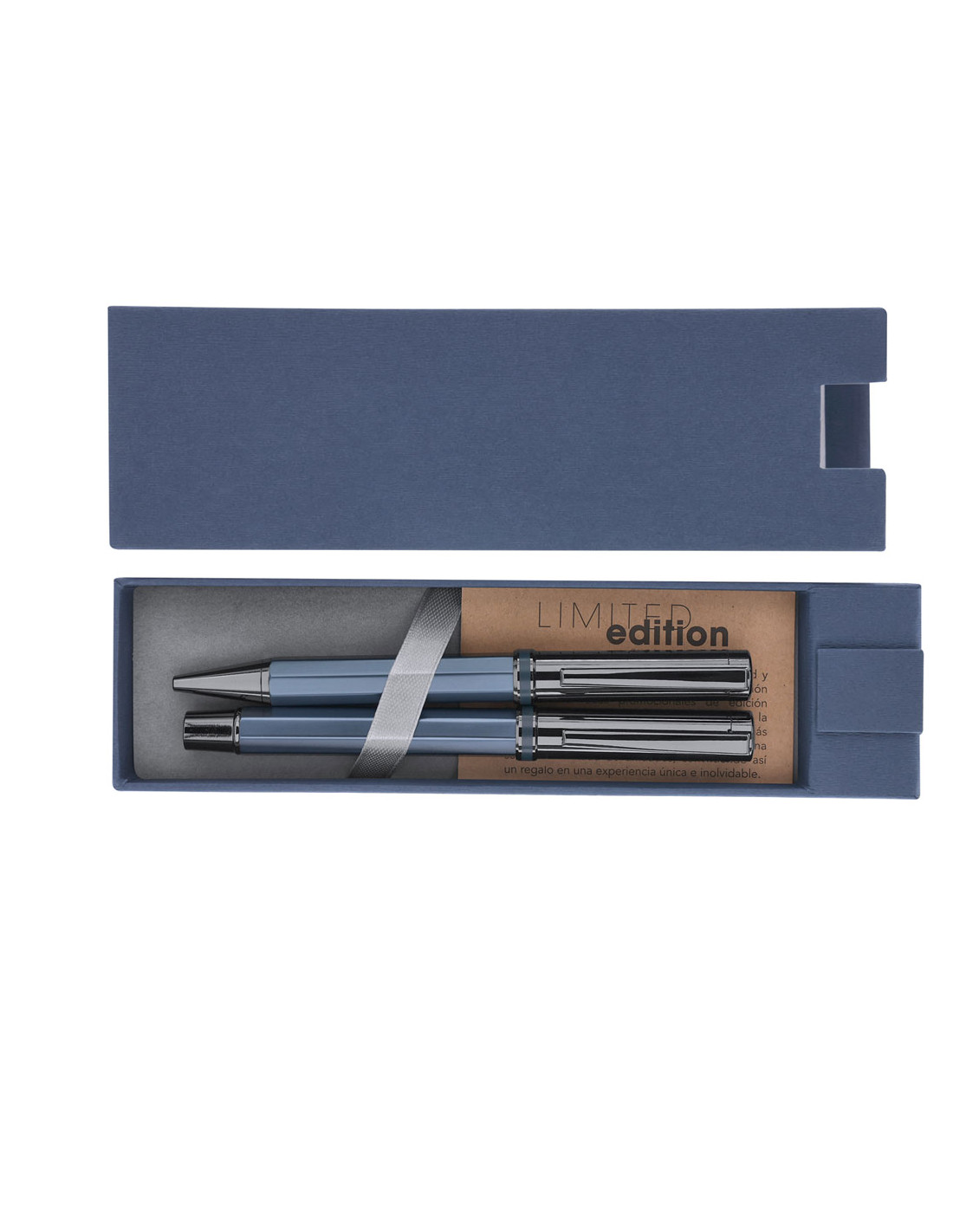 Exclusivo set de bolígrafo y roller de la más alta gama colección Limited Edition. Un complemento moderno, funcional de gran belleza que sobrepasa todas las expectativas. Caracterizado por su elegante y minimalista diseño, así como su calidad premium en resistente y duradero acero inox, en perfecta sintonía con el aluminio. Bolígrafo con sofisticado sistema de apertura giratoria y roller con práctica apertura de capucha. Empuñaduras de diseño hexagonal en colores metalizados mate y parte superior cilíndrica de sofisticado color antracita brillo con clip metálico, de tinta azul y recargables, carga jumbo para roller. De la perfecta combinación entre exclusividad y diseño, nace Limited Edition, una colección especial de ideas promocionales de edidición limitada. Un nuevo concepto, inspirado en la fusión de artículos premium con las últimas y más novedosas tendencias y q