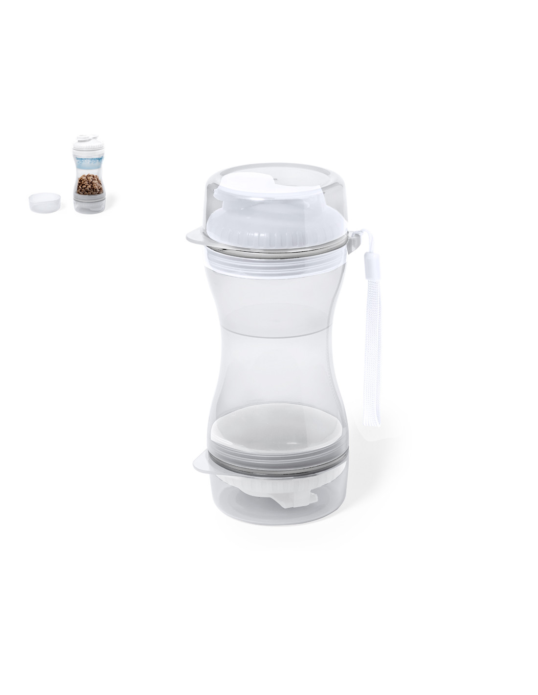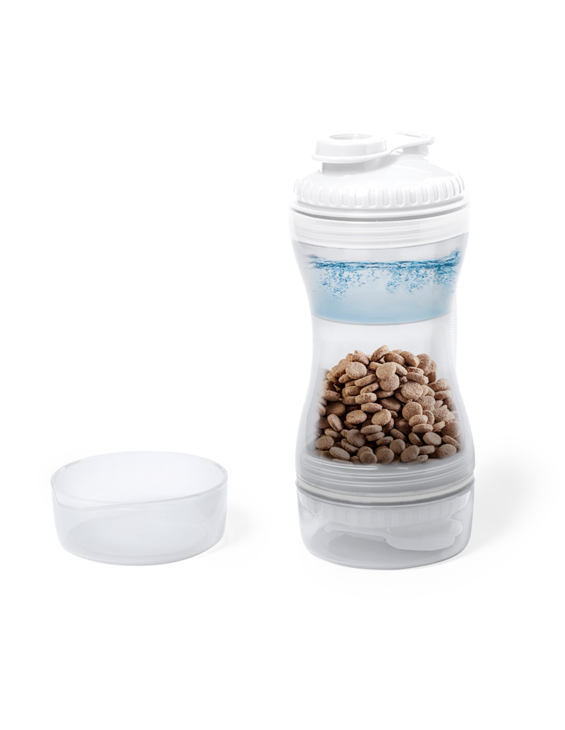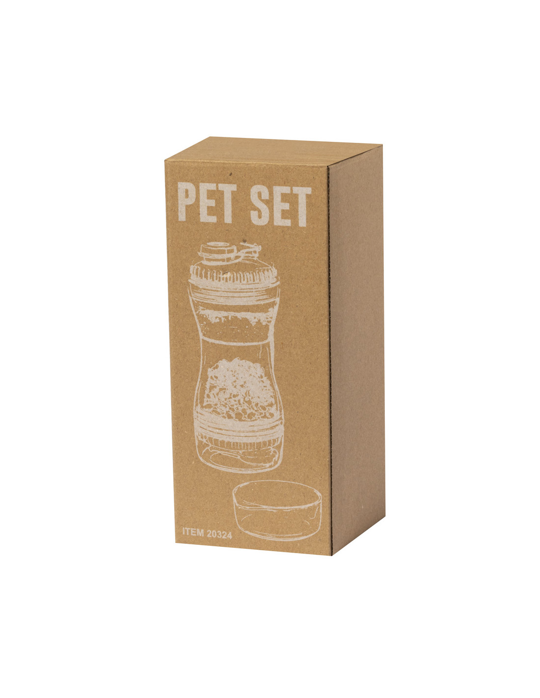 Práctico set de mascotas fabricado en resistente ABS. Con dos compartimentos separados de 330 ml y 280 ml, con tapón de rosca para mayor seguridad y dosificadores incluidos. Además, cuenta con dos tapaderas para usar como cuenco. Presentado individualmente en caja de diseño kraft.