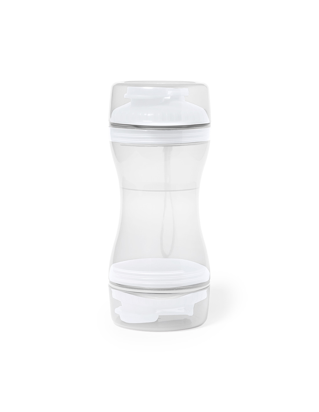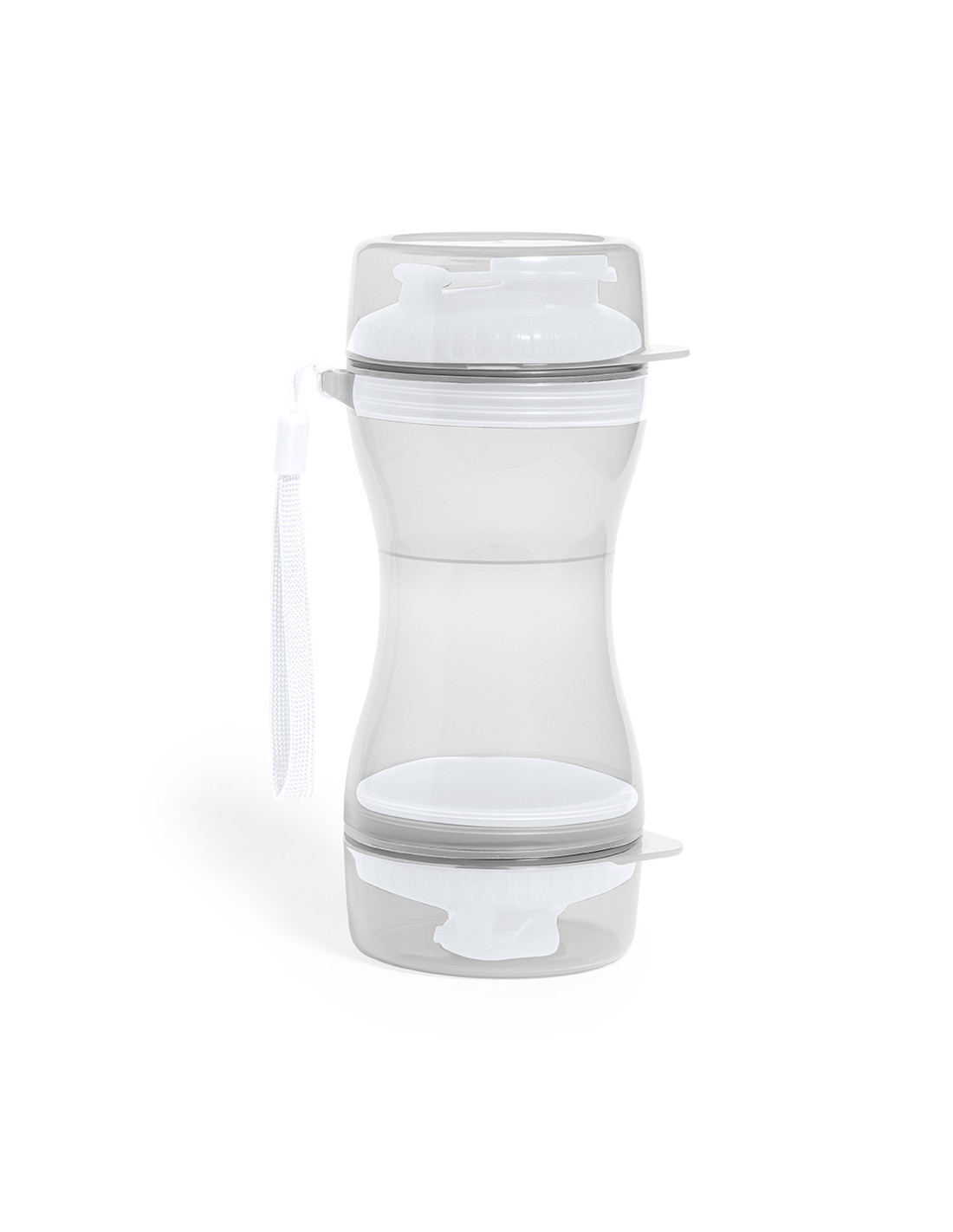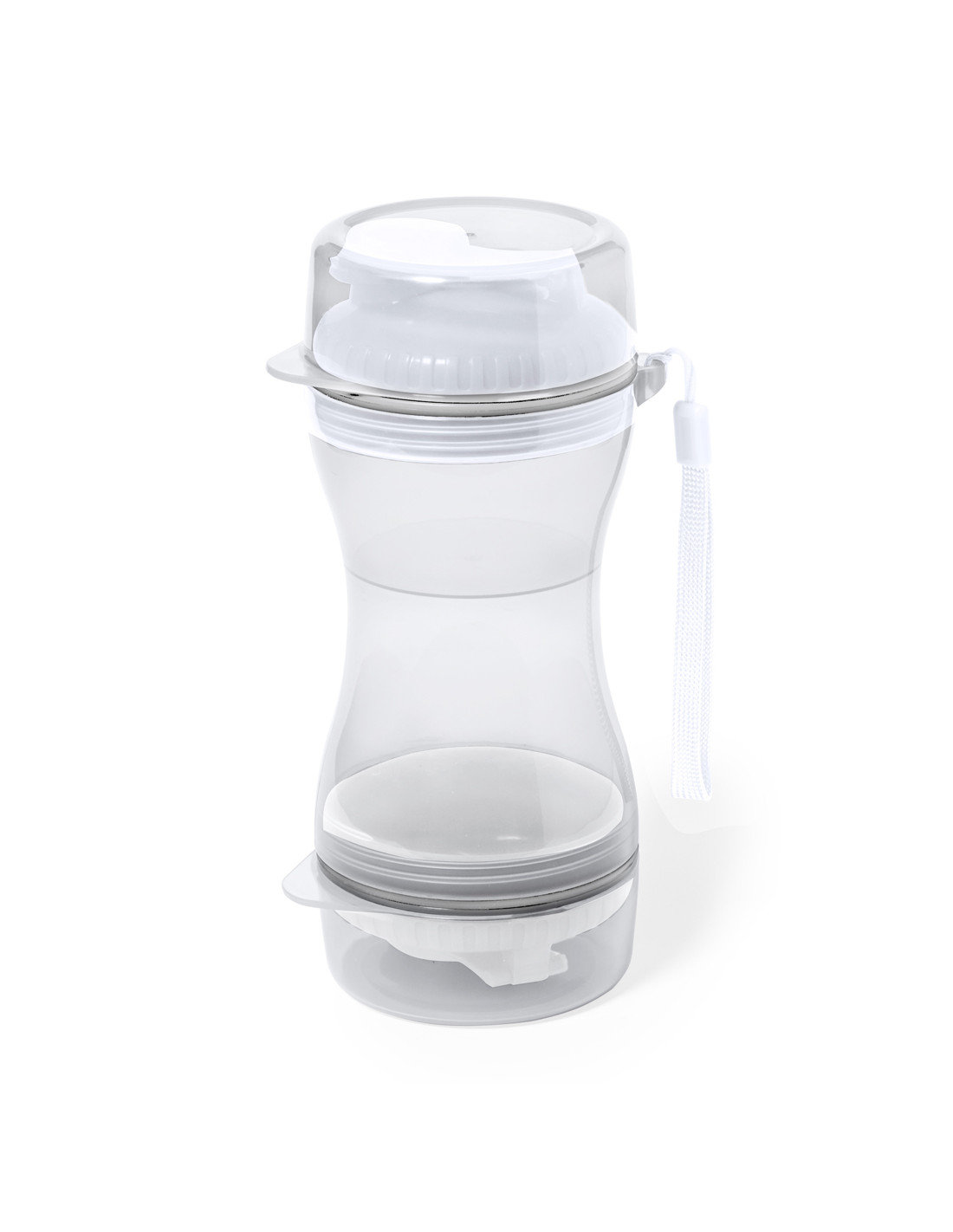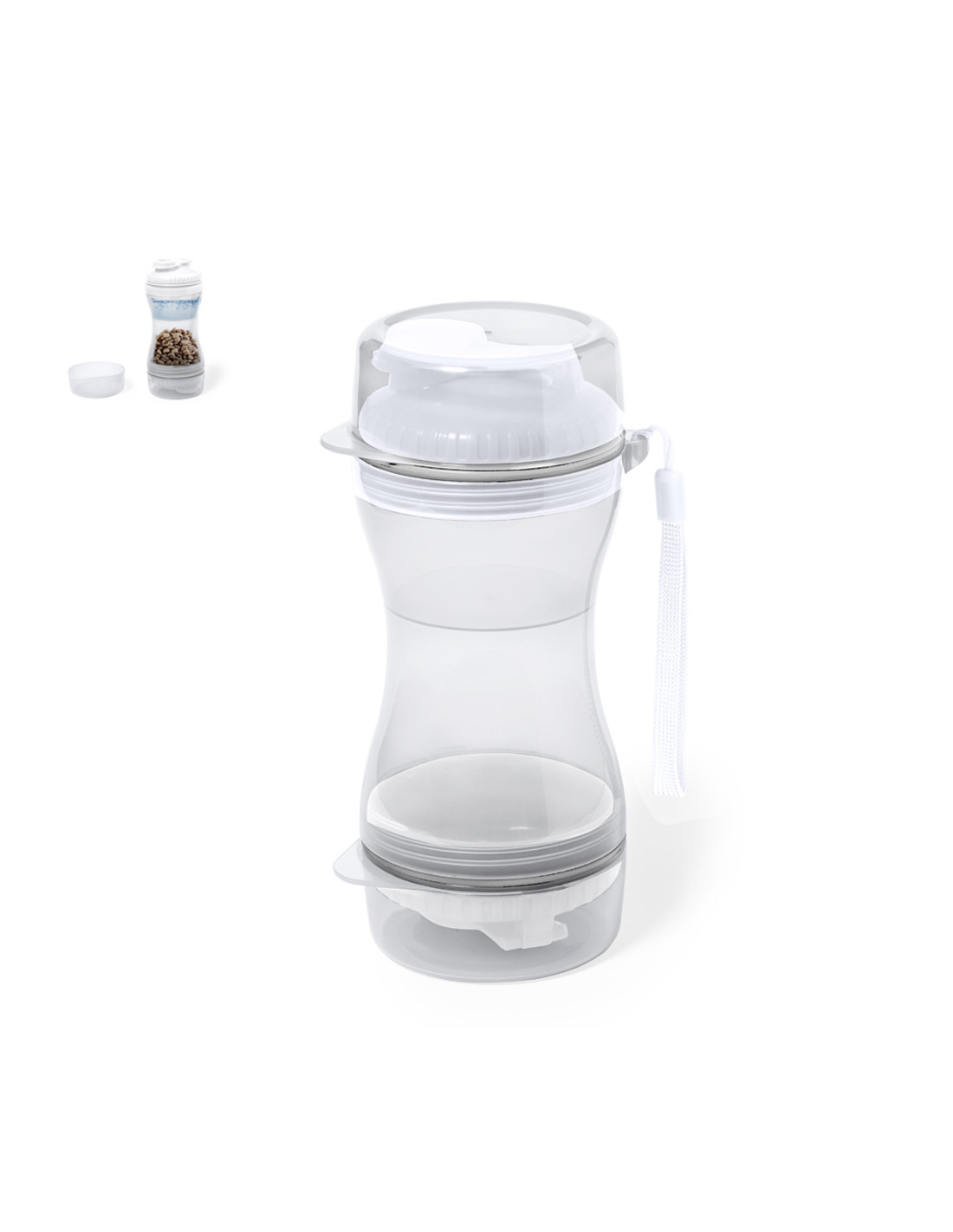 Práctico set de mascotas fabricado en resistente ABS. Con dos compartimentos separados de 330 ml y 280 ml, con tapón de rosca para mayor seguridad y dosificadores incluidos. Además, cuenta con dos tapaderas para usar como cuenco. Presentado individualmente en caja de diseño kraft.