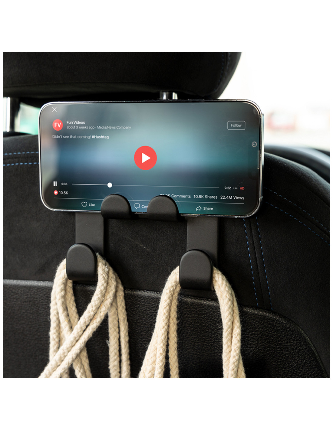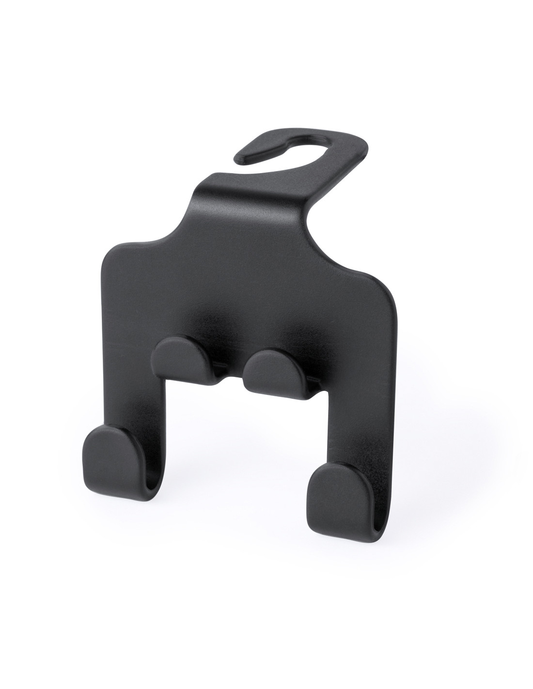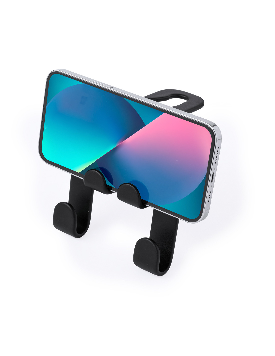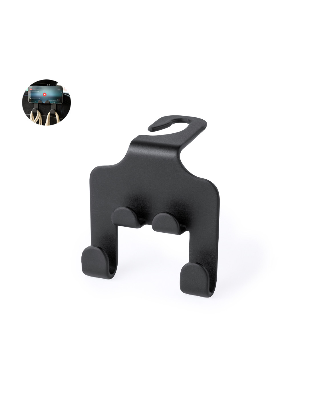 Resistente soporte fabricado en ABS. Fácil instalación mediante el gancho abierto diseñado para colocarse en el reposacabezas, con soporte para dispositivos móviles y dos ganchos adicionales para bolsas. Presentado en bolsa individual.