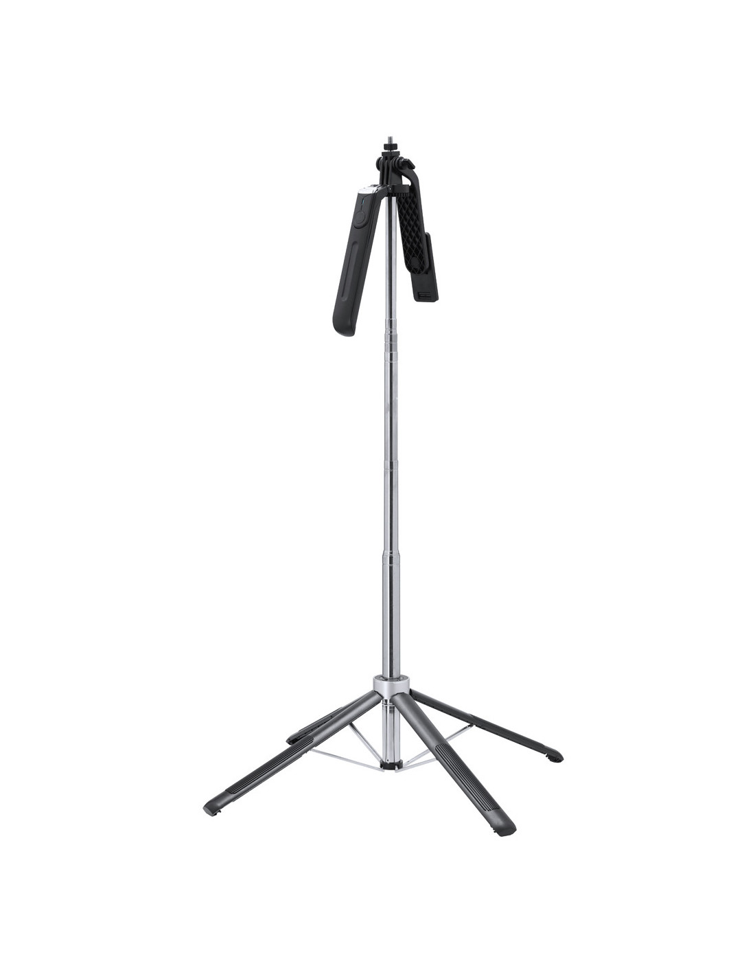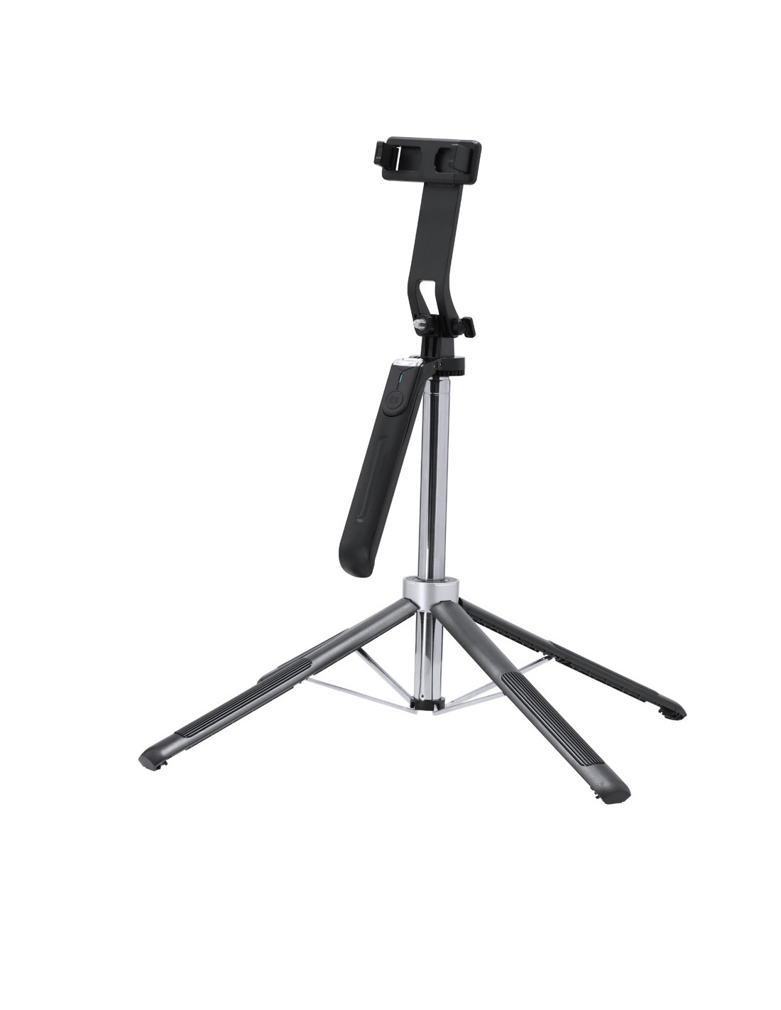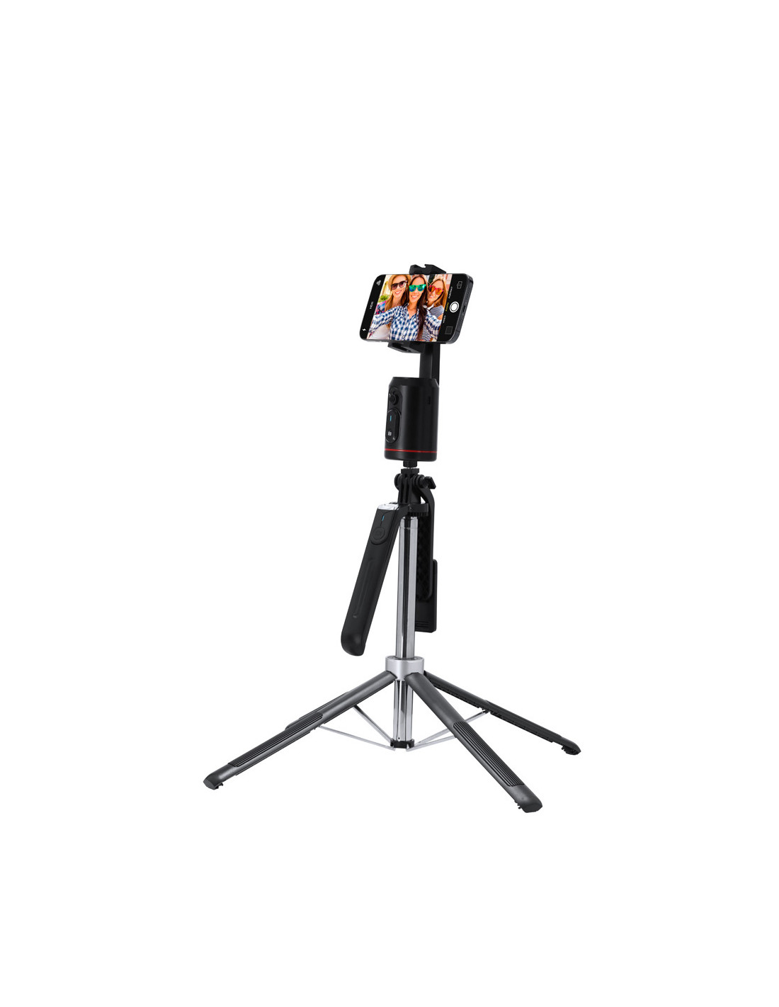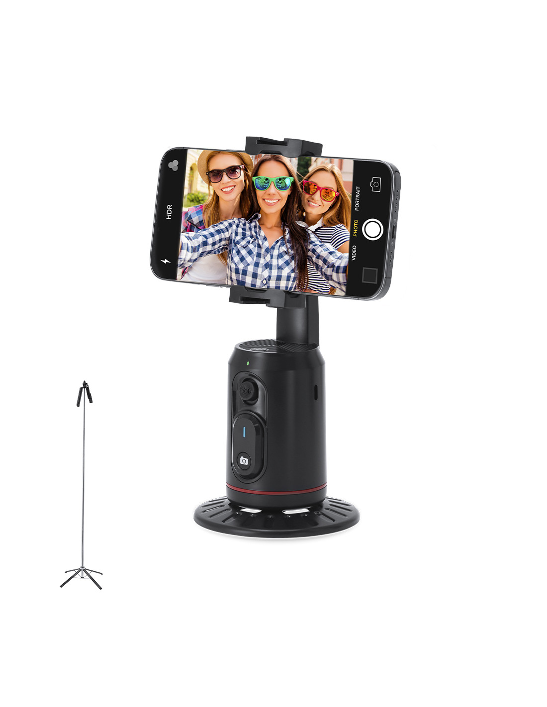 Soporte de seguimiento automático con base y trípode. Incluye:- Lente óptica de alta calidad con inteligencia artificial que posibilita un seguimiento avanzado 360º y doble ángulo de reconocimiento. Ideal para grabar tanto de pie como sentado, asegurando un acompañamiento constante sin importar el movimiento.- Controles gestuales intuitivos para una grabación impecable, iniciando el seguimiento, pausando la grabación o cancelándola con unos simple gestos de mano, que posibilitan una experiencia de grabación sin interrupciones.- Compatibilidad universal y funcionamiento sin aplicaciones para streaming y vlogs, ya que se integra en las plataformas más populares, ofreciendo una experiencia plug-and-play para todos los usuarios.- Disparador extraíble de conexión Bluetooth integrado en la carcasa y batería de litio de 1200 mAh, de gran autonomía. Montaje versátil con rosca 1/4