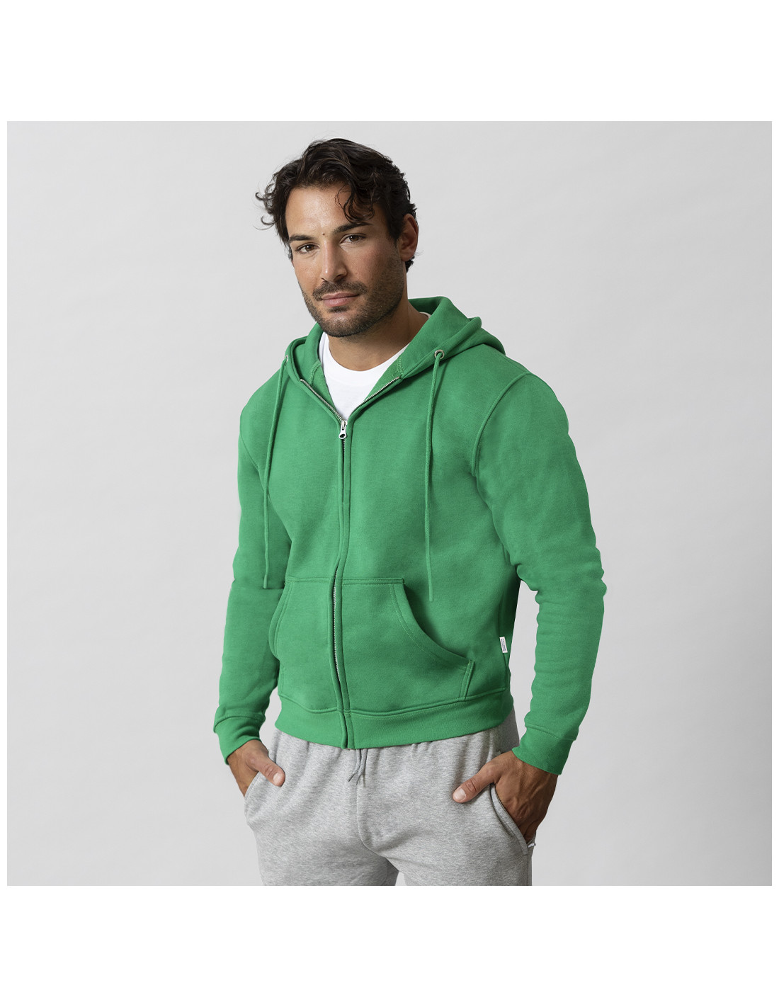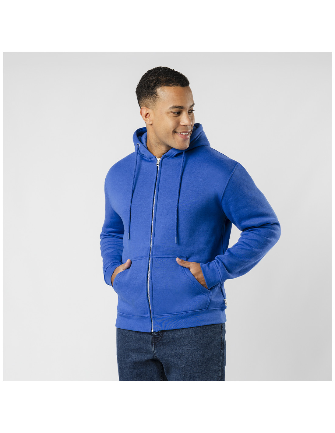 Sudadera Unisex con capucha y cremallera de Algodón Orgánico y Poliéster Reciclado, en suave felpa perchada de 280 g/m2. Con capucha forrada de doble capa, cordones redondos ajustables -con topes a juego- y ojales metálicos. Puños y cintura de punto canalé de elastano y bolsillo frontal tipo canguro. Apertura de cremallera oculta metálica, con cubrecosturas reforzado en cuello. Incluye etiqueta distintiva eco.