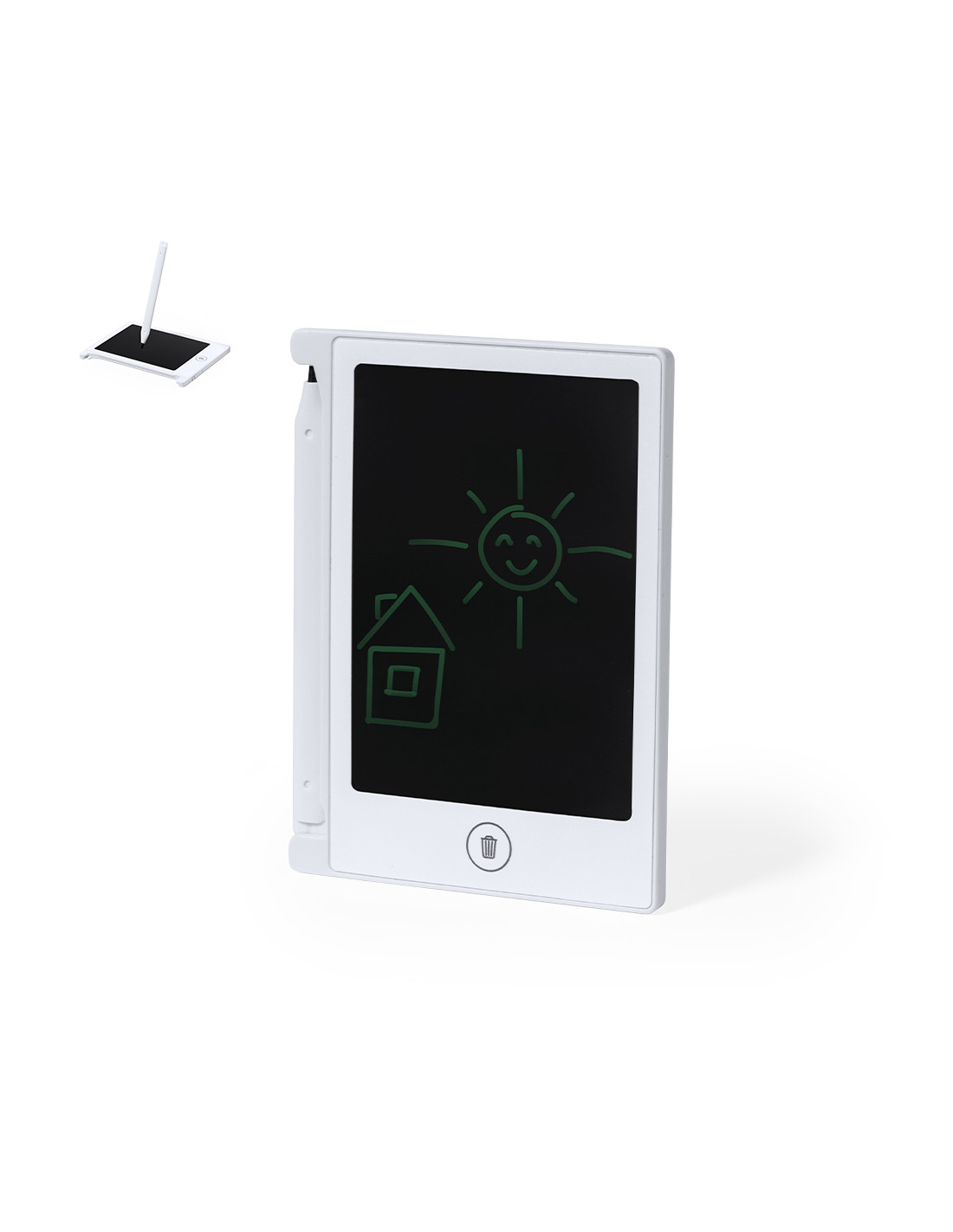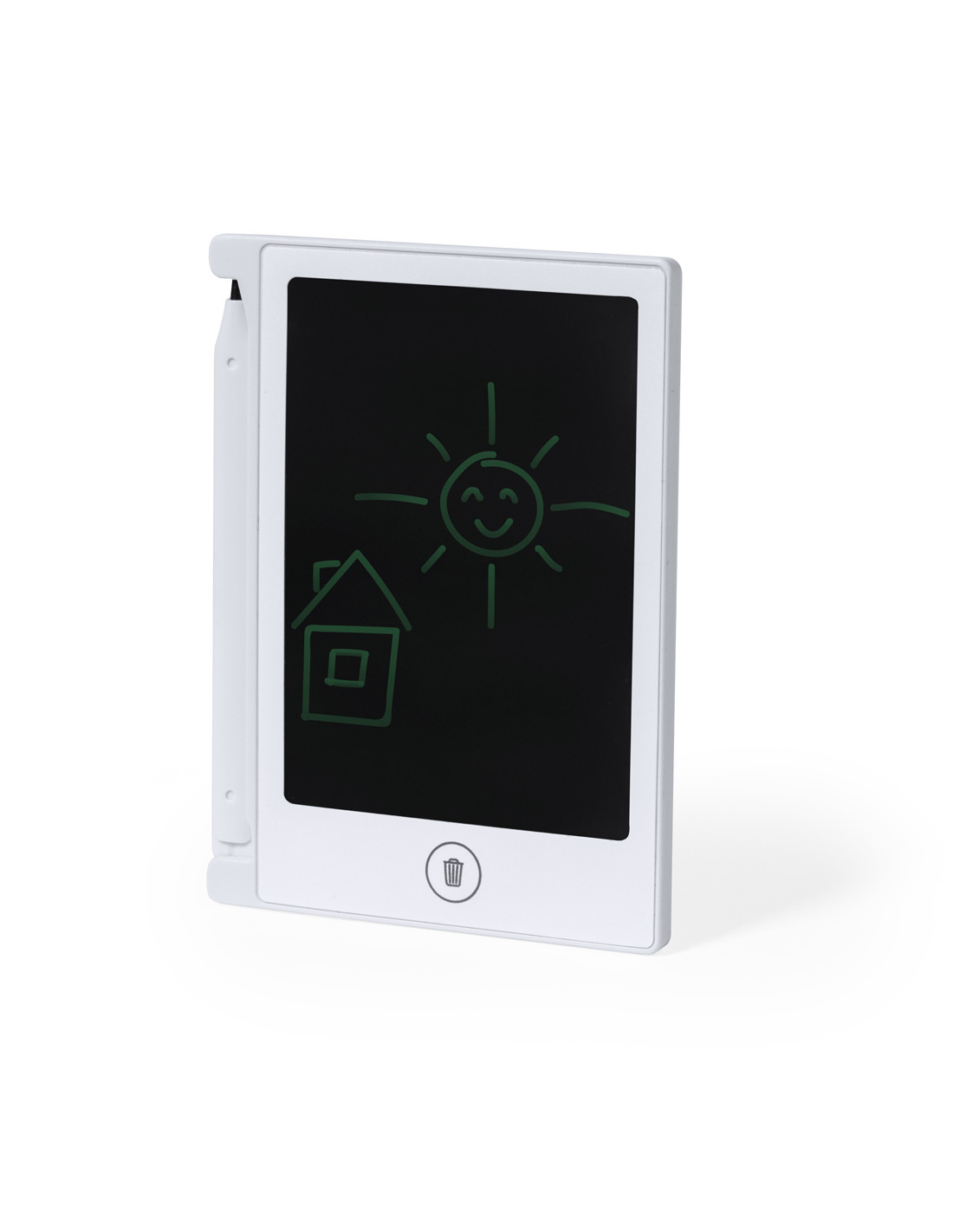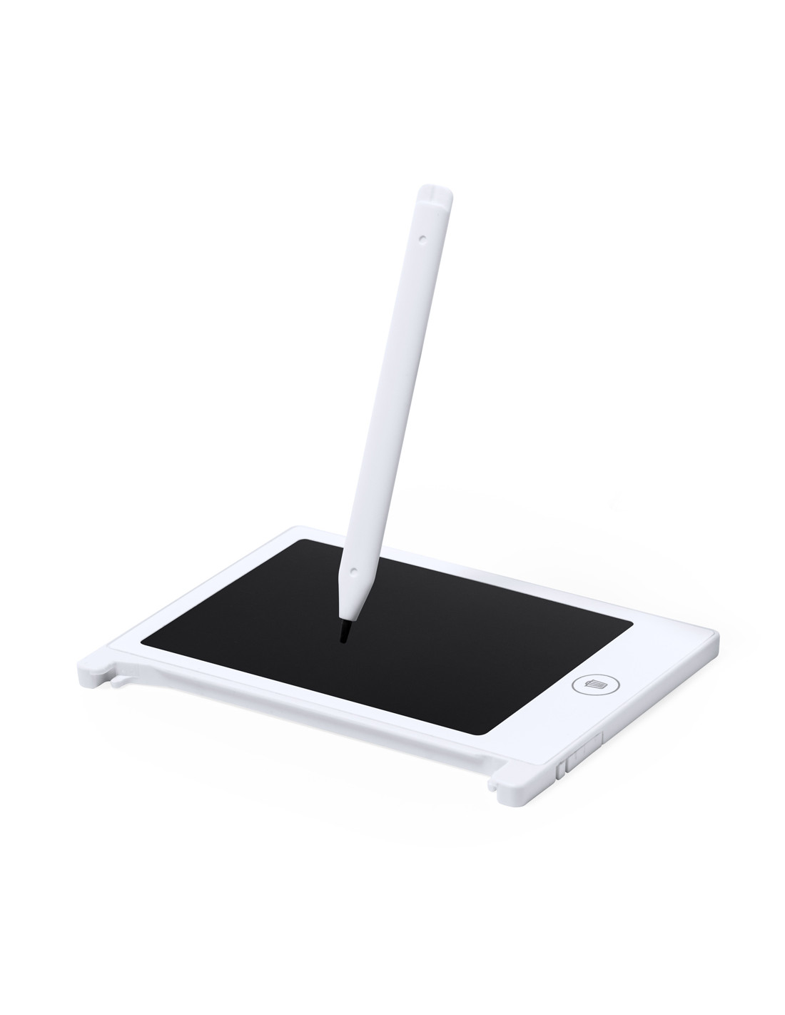 Tableta LCD para escritura en resistente material, con fijación magnética y soporte para el lápiz. Pantalla LCD de 4,5 pulgadas, con lápiz incluido, botón de borrado, bloqueo anti borrado y pila de botón incluida. Presentado en caja de diseño kraft.