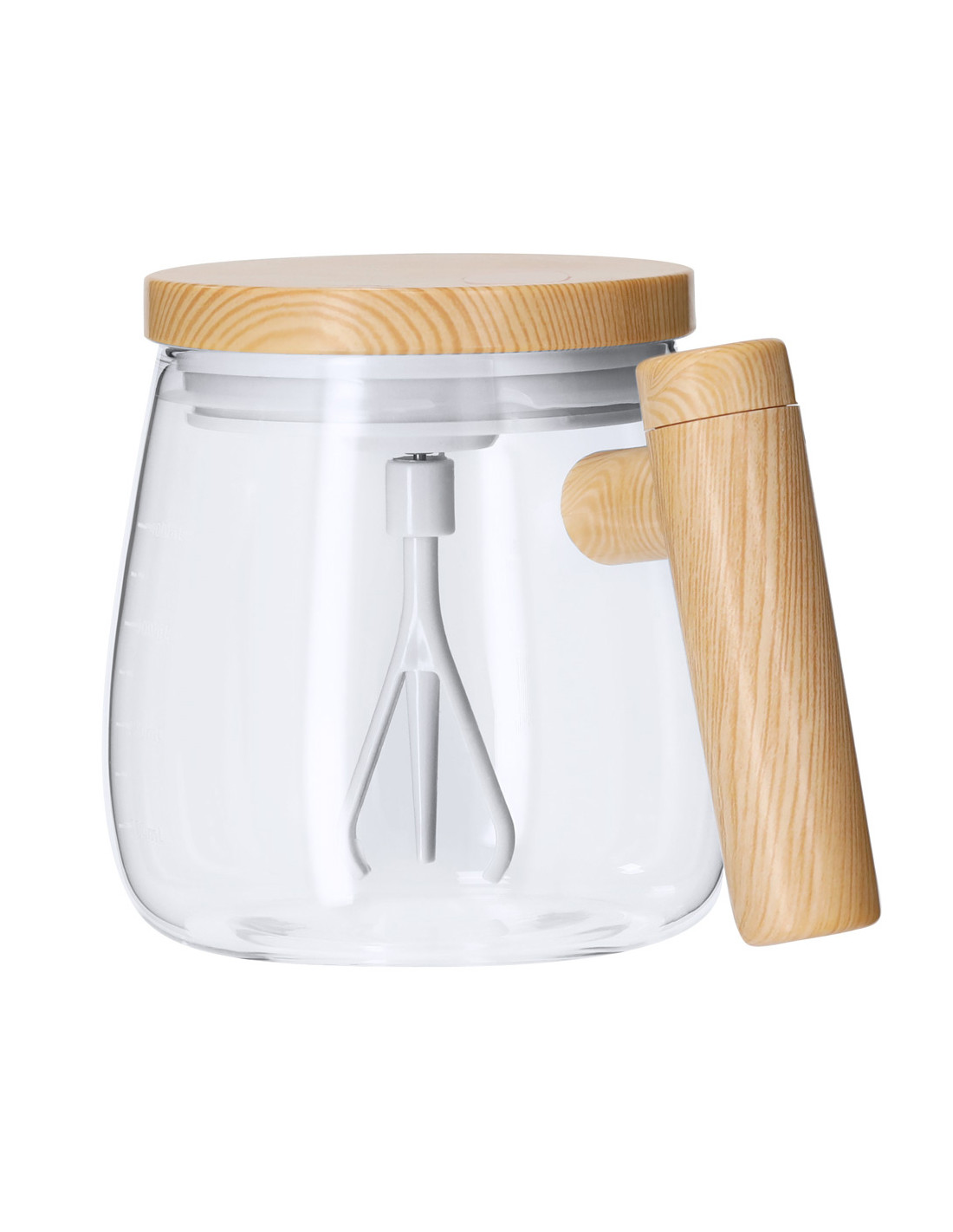 Taza mezcladora fabricada en resistente cristal de borosilicato de 400ml de capacidad. Incluye tapadera con agitador eléctrico alimentado por 2 pilas AAA (no incluidas) y botón de on/off en la parte superior. Con compartimento en mango especial para guardar el agitador, fabricados en ABS imitación madera. Además, tiene escala de medidas impresa en el cuerpo de color blanco.Fabricado en cristal de borosilicato, que ofrece una resistencia y durabilidad excepcionales, alargando su vida útil y pudiendo ser reutilizado infinidad de veces.