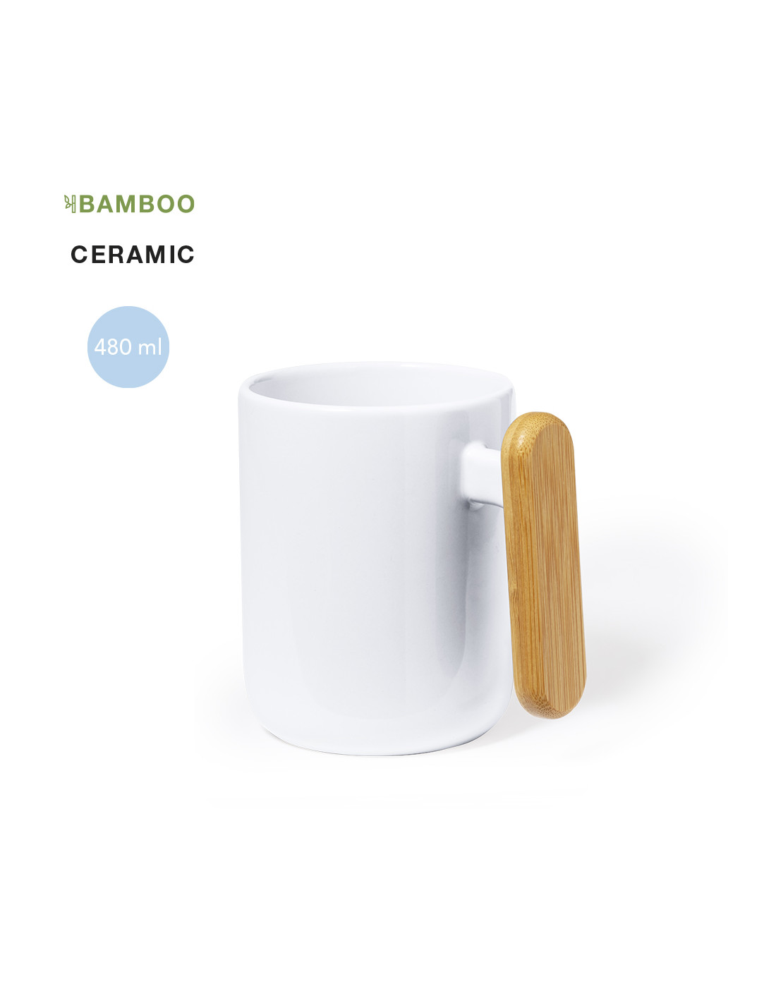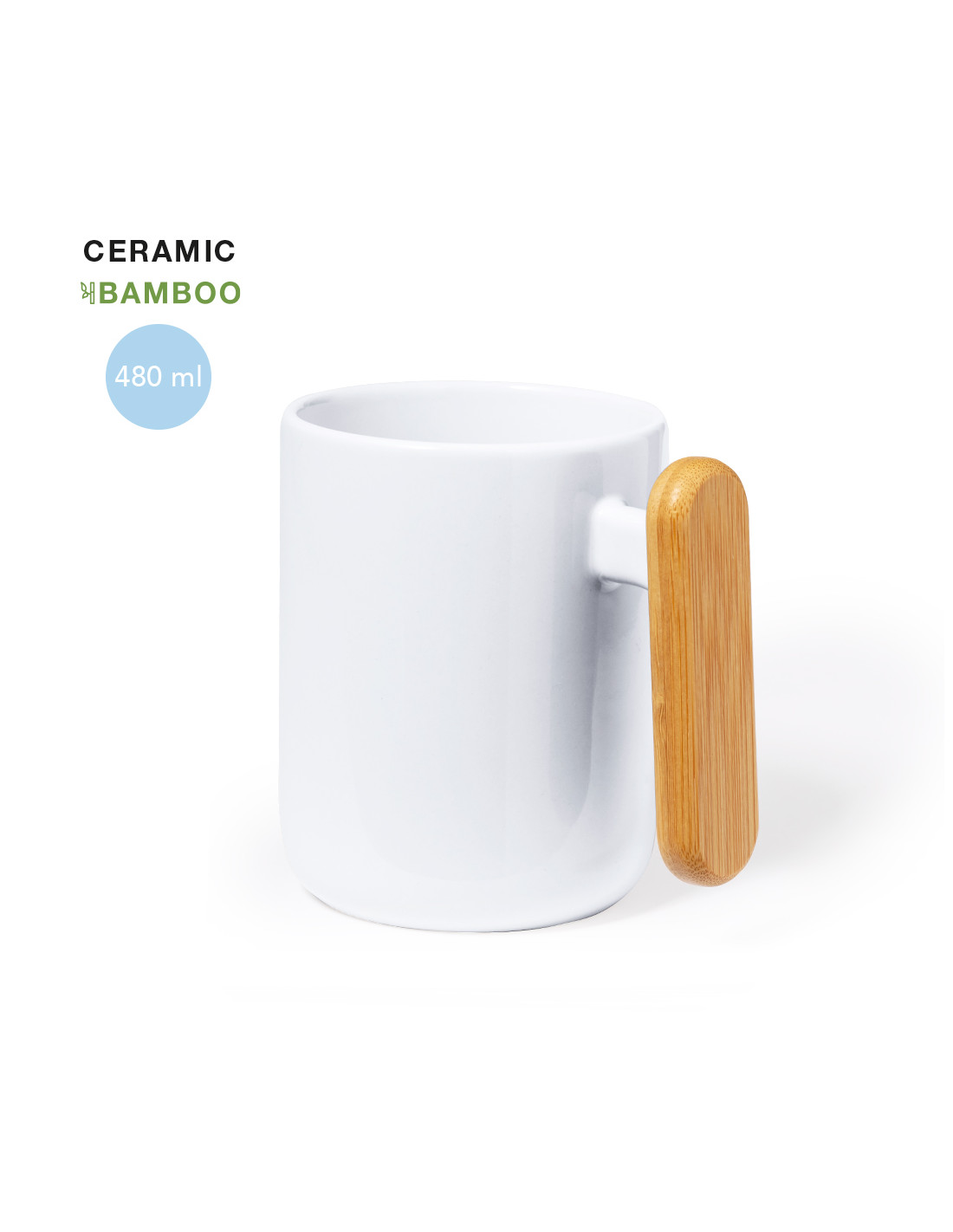 Taza de cerámica de 480 ml de capacidad, en elegante color blanco. Distinguido diseño en combinación cerámica con asa de bambú. Presentada en caja individual acabado kraft.Materiales como el bambú fomentan la utilización de materias primas naturales, reduciendo las emisiones contaminantes. Proviene de una planta de gran resistencia y versatilidad, con crecimiento y regeneración rápidos, siendo una excelente alternativa al uso de madera tradicional.