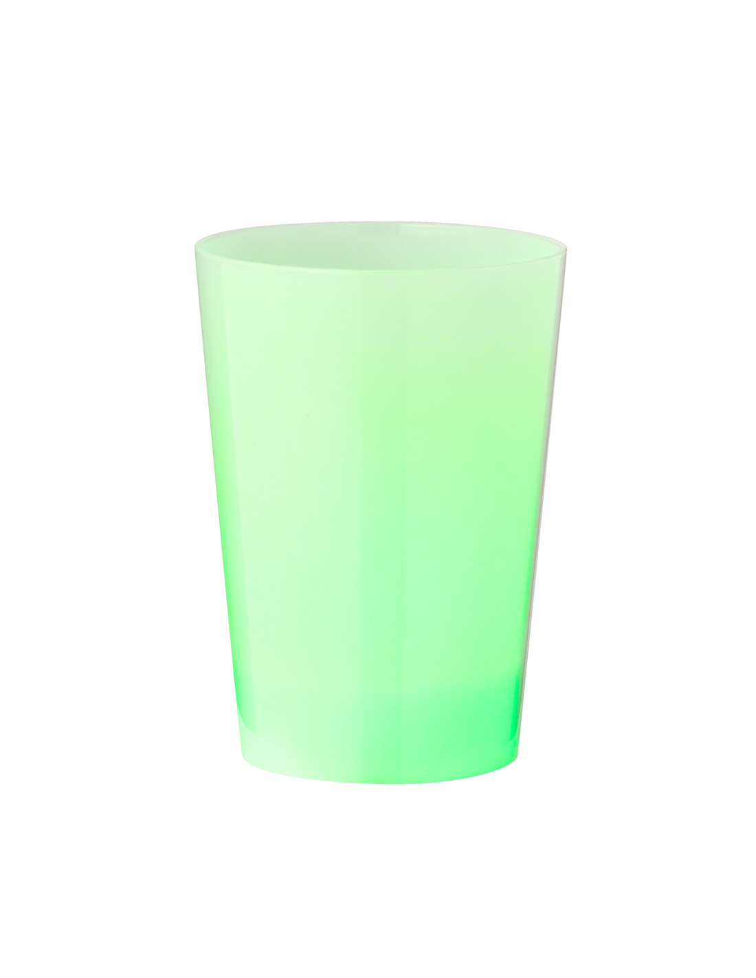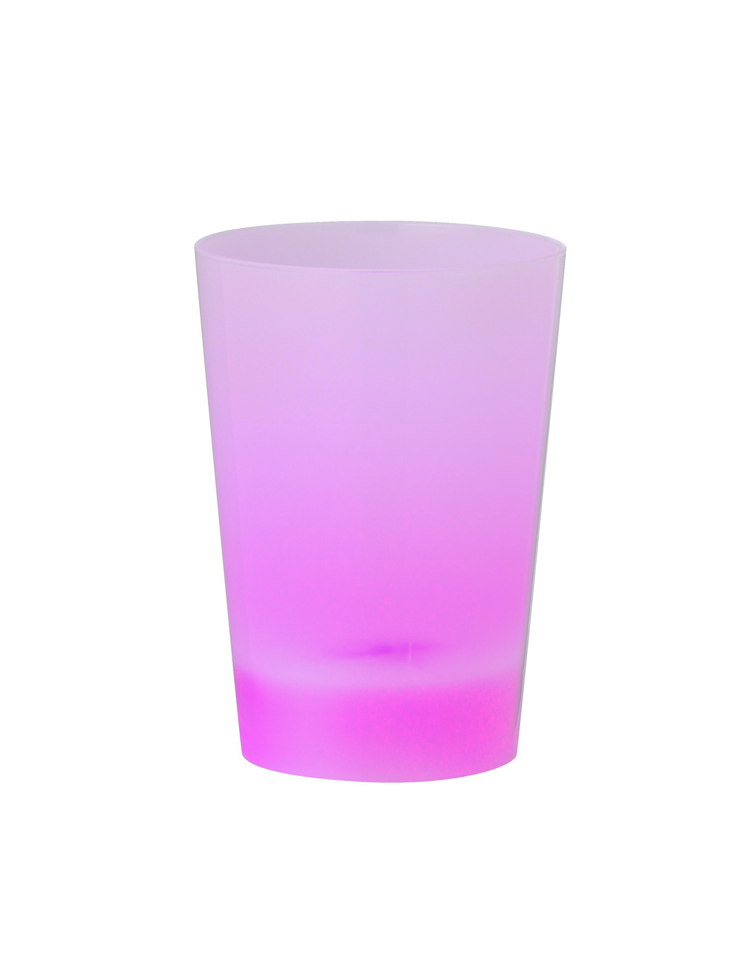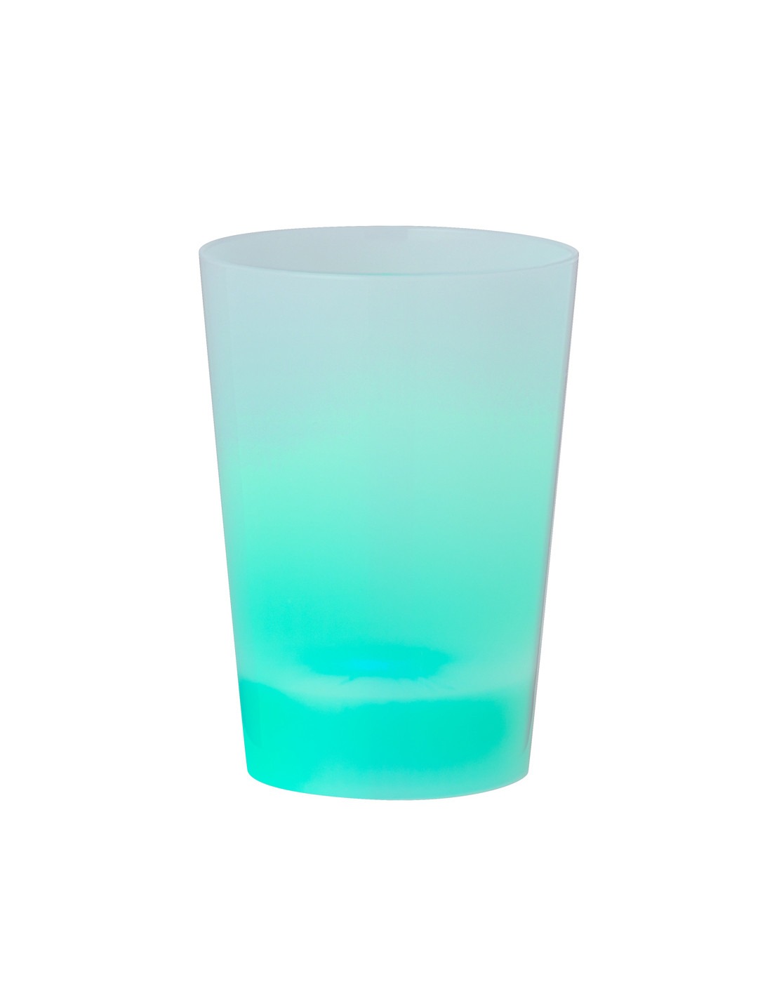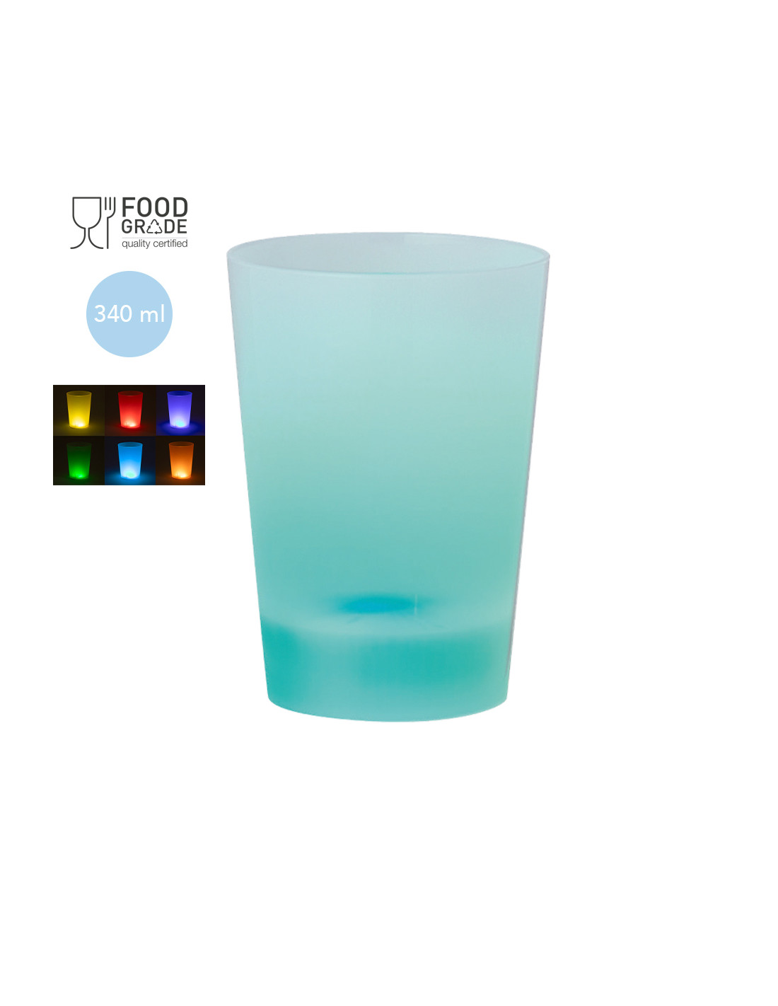 Original vaso iluminado por luces LEDs, de 340 ml de capacidad fabricado en PS. Con pila de botón incluida para iluminar cualquier bebida deseada, animando cualquier evento. Se activa desde el botón que tiene en la base poder poner diversos colores. Presentado en una caja de diseño kraft.