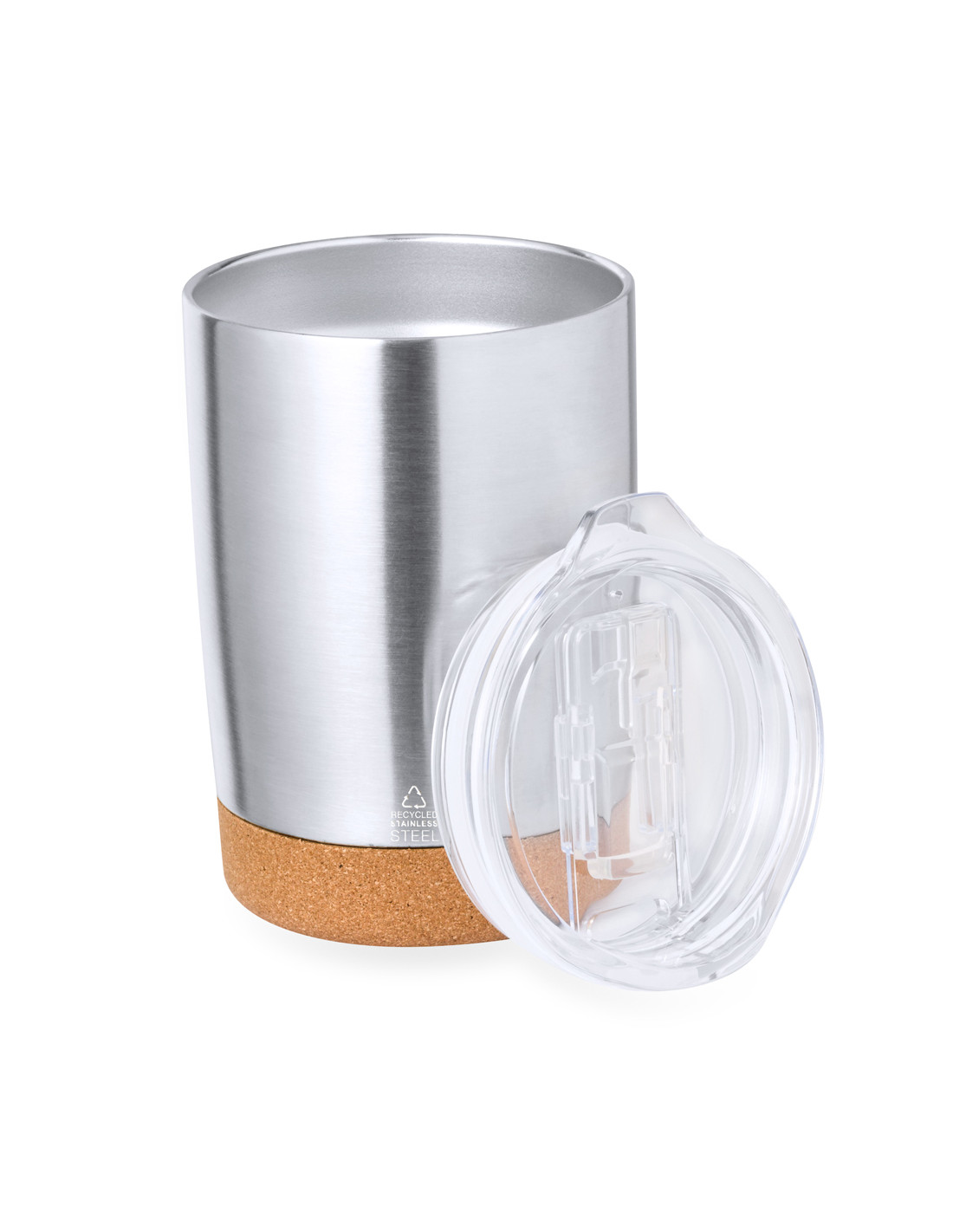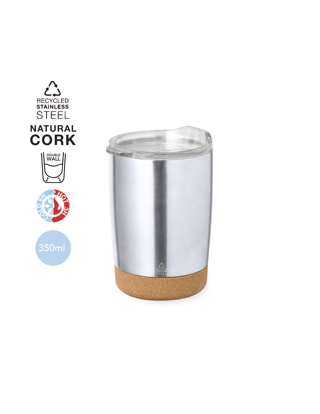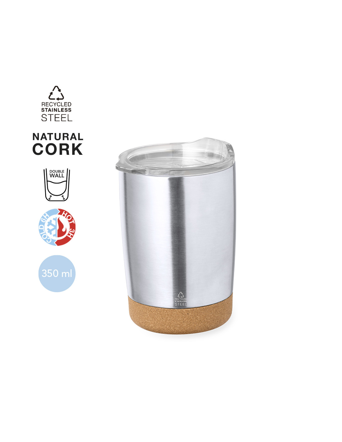 Vaso de sobremesa fabricado en acero inox reciclado en 350 ml de capacidad. Combinación de base en corcho natural con cuerpo en acero inox reciclado de acabado plata. Con doble pared para mejor y más duradera conservación de la temperatura. Original tapón dosificador transparente con abrefácil, y logotipo Acero Inox Reciclado. Presentado en atractiva caja de diseño kraft.El acero es uno de los materiales más demandados y que puede encontrarse casi en todas partes, desde productos de uso diario a grandes construcciones. Con innumerables propiedades, entre las que cabe destacar la durabilidad y su alto grado de reutilización, convirtiéndolo en una alternativa muy valorada en soluciones de sostenibilidad. Debidamente tratado, permite obtener nuevos recursos de infinita utilización.