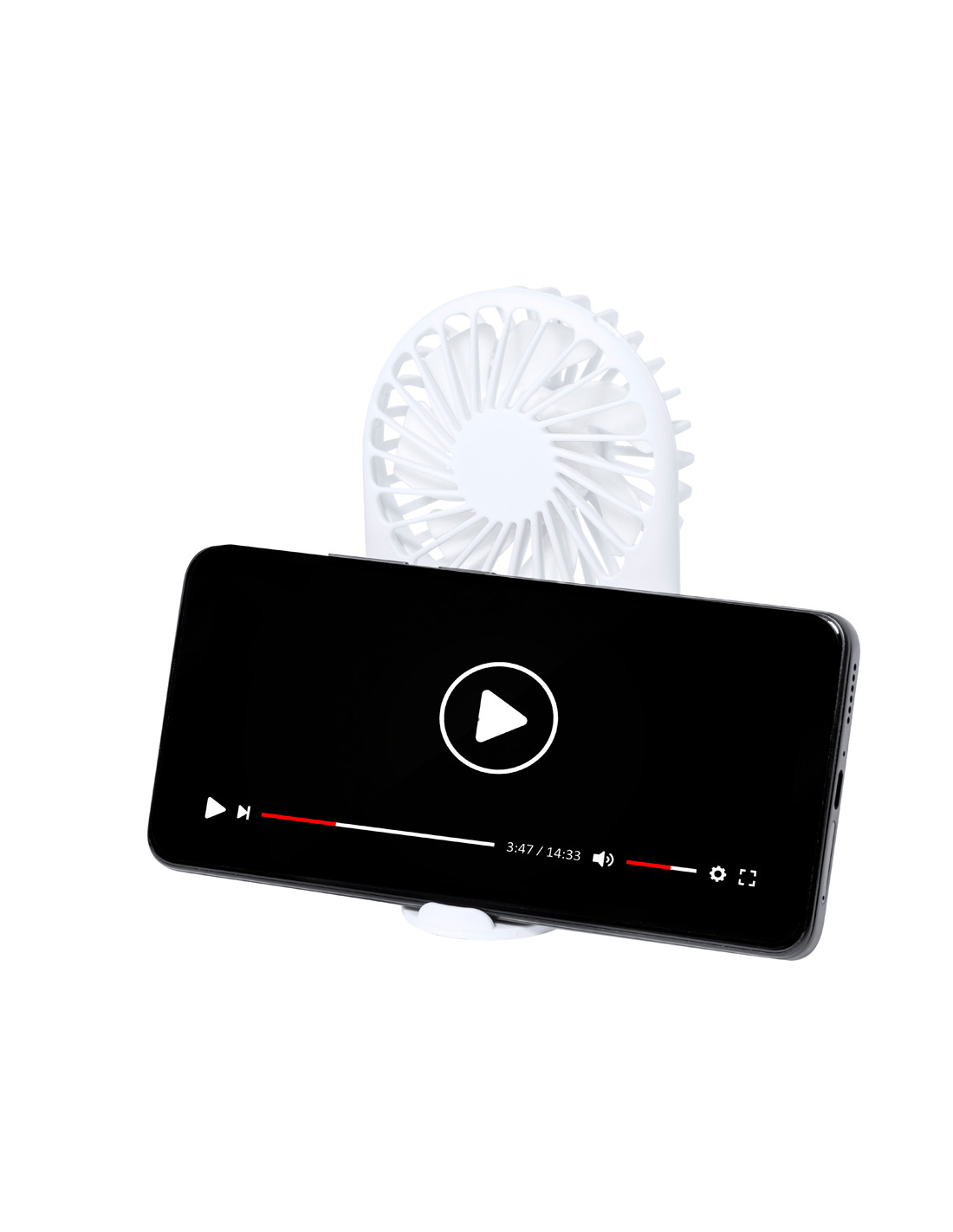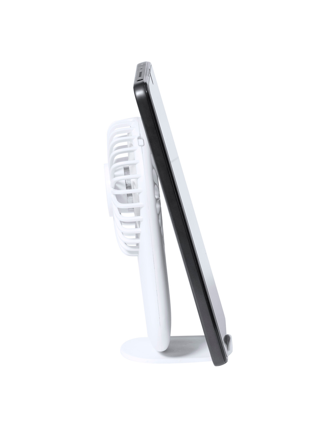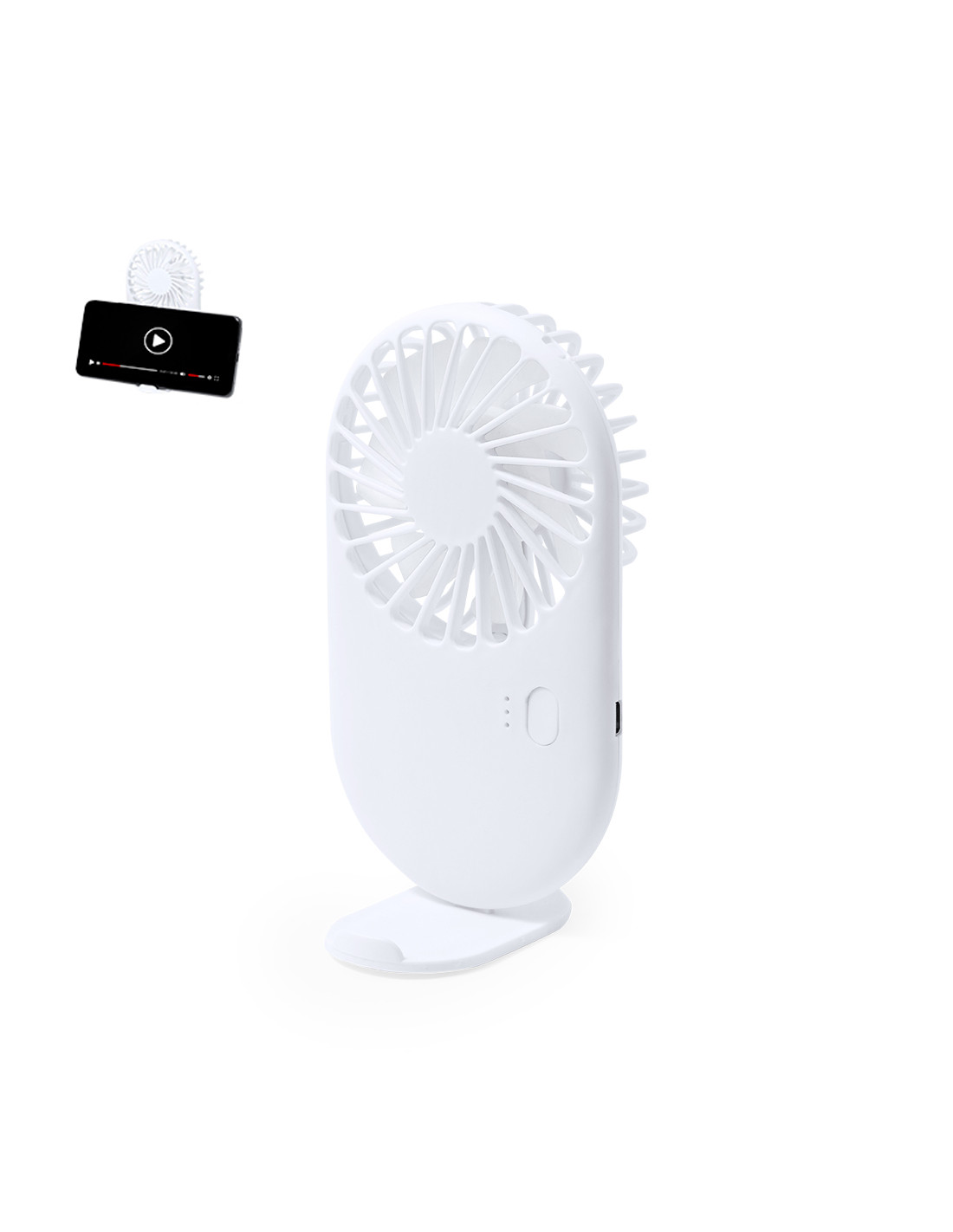 Ventilador portátil fabricado en resistente ABS. Cuenta con tres velocidades y soporte integrado para smartphone. Se alimenta mediante una batería de 300 mAh, con indicadores de luz que muestran el nivel de carga y cable Micro USB incluido. Presentado individualmente en caja de diseño kraft.